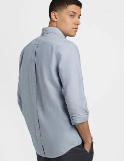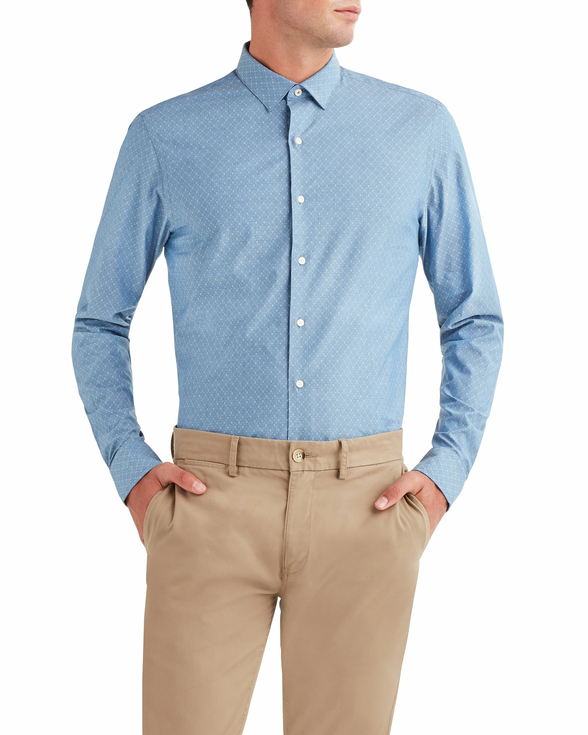 The Navy Argyle Chambray Dress Shirt is cut to a skinny fit in cotton chambray. The style stands out with its argyle dashed-diamond print.