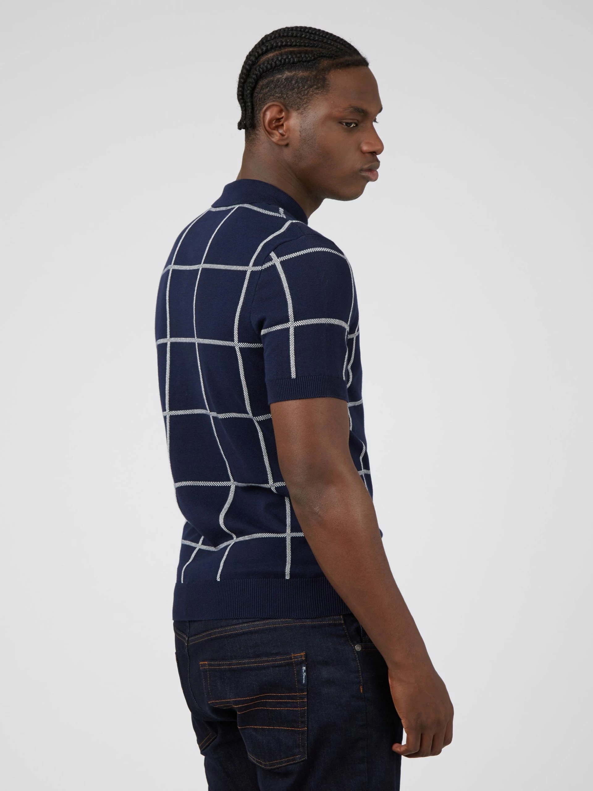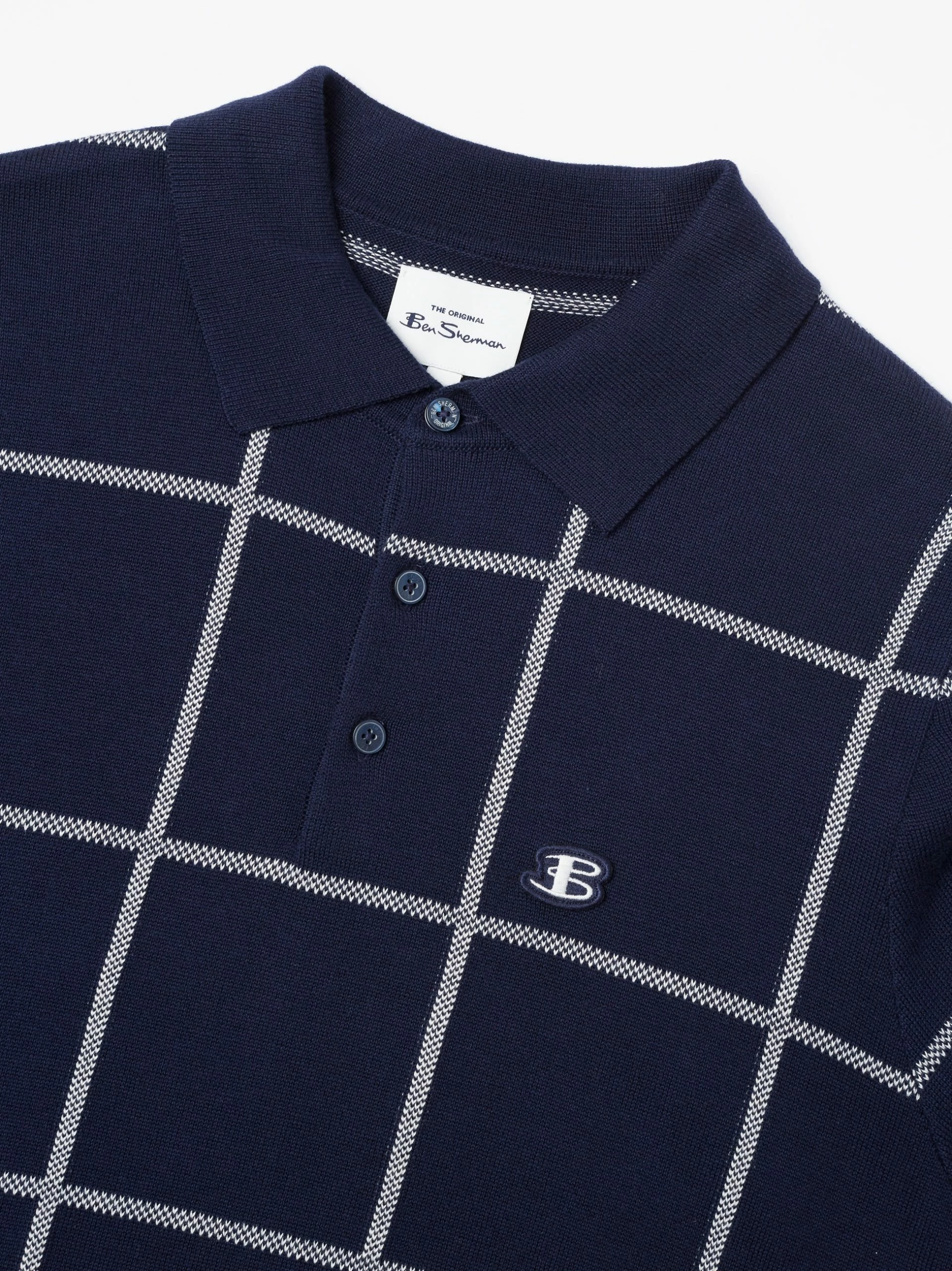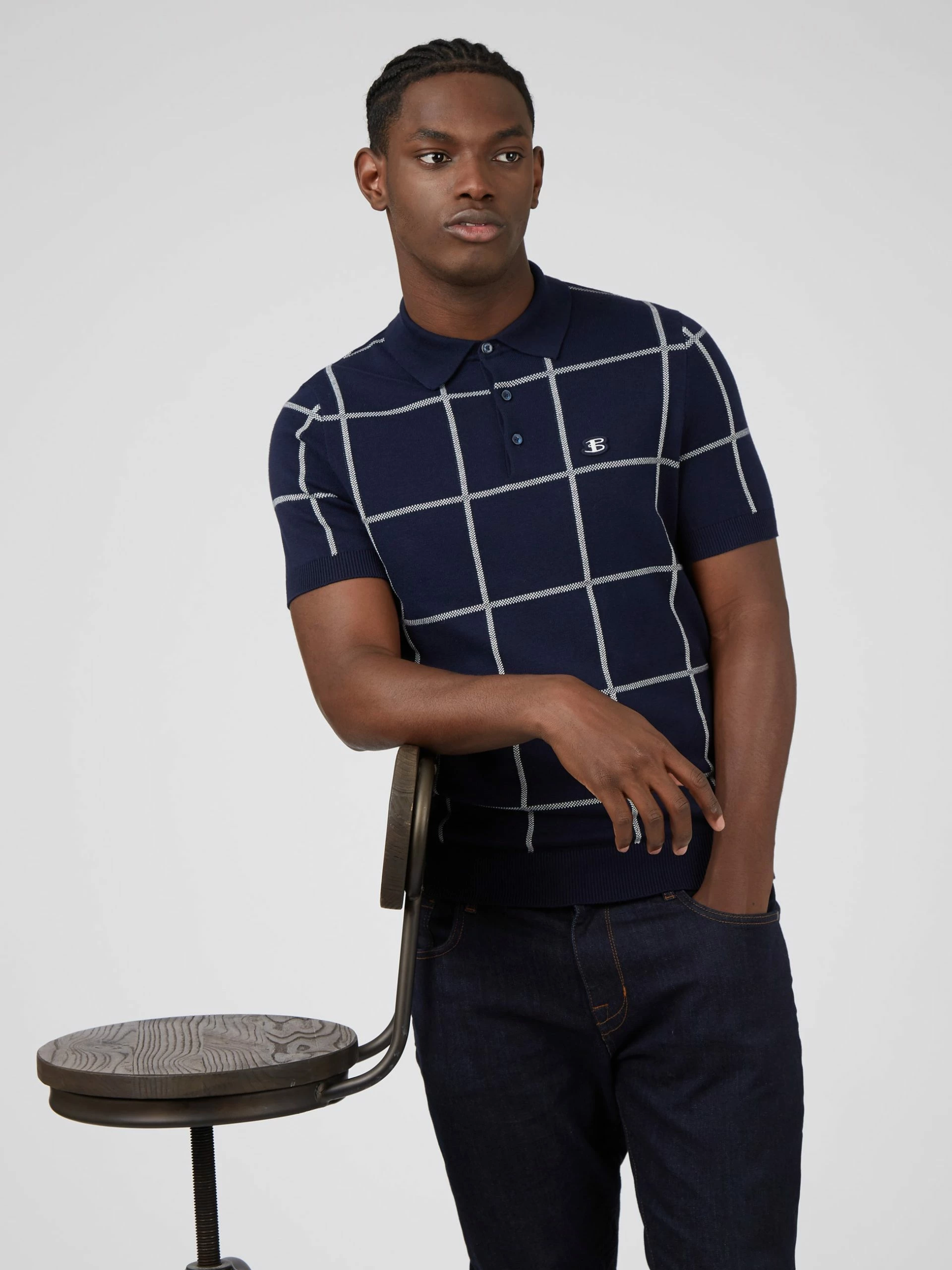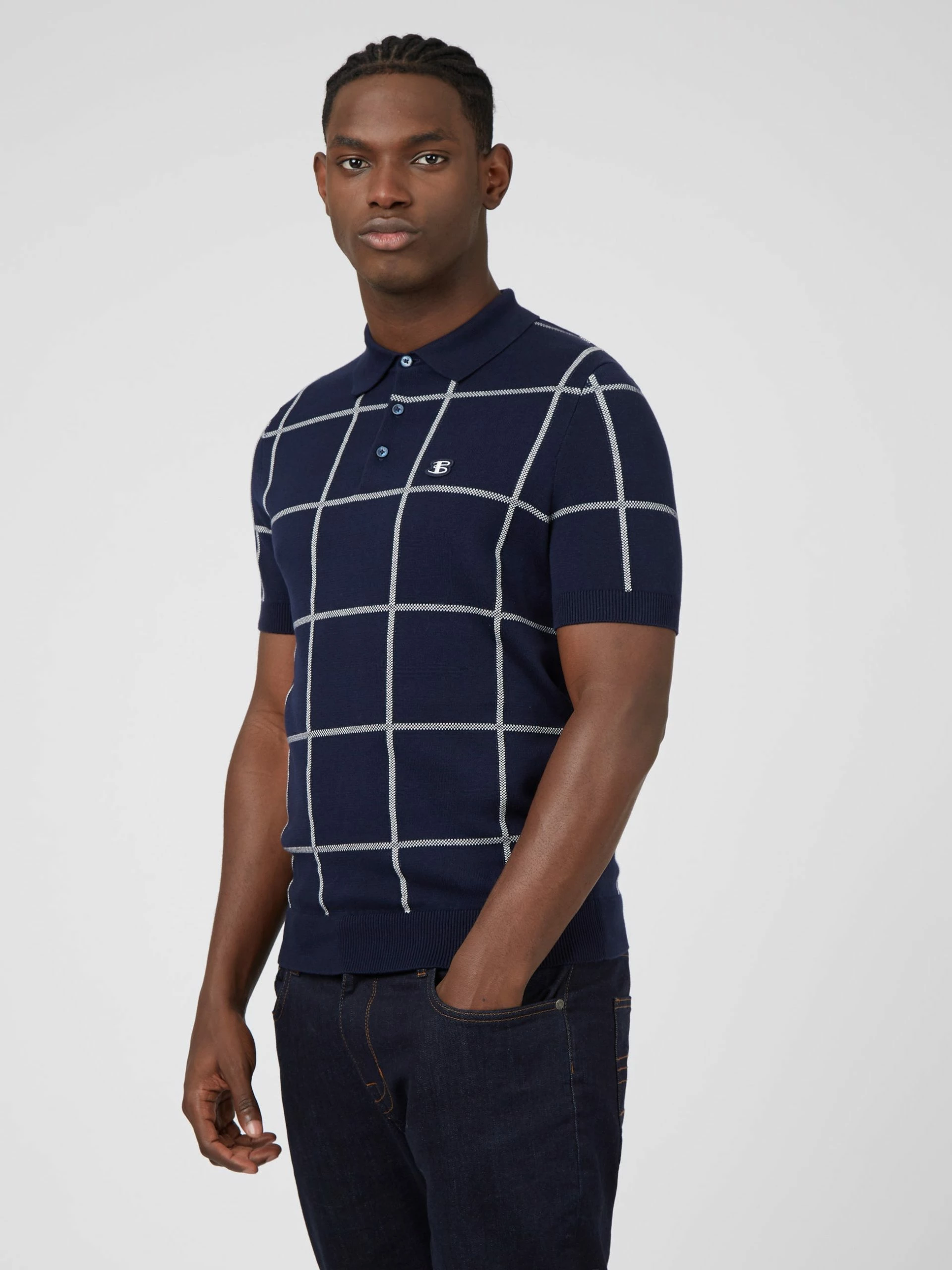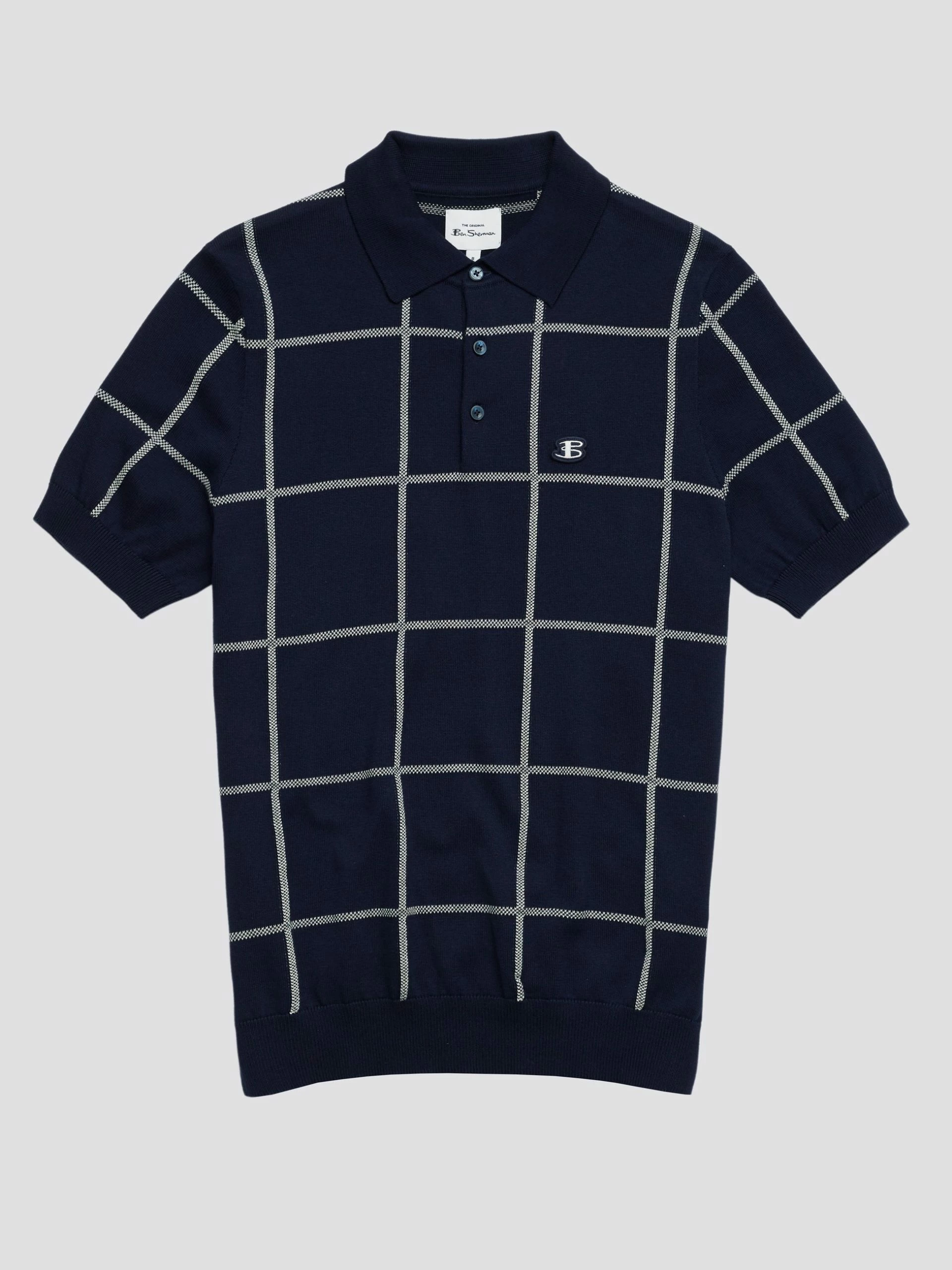A short sleeve knitted polo with a jacquard check design to the front. This oversized check makes this polo stand out and feel contemporary. As part of our “B by Ben Sherman” range, this polo is branded with an embroidered B logo to the chest.