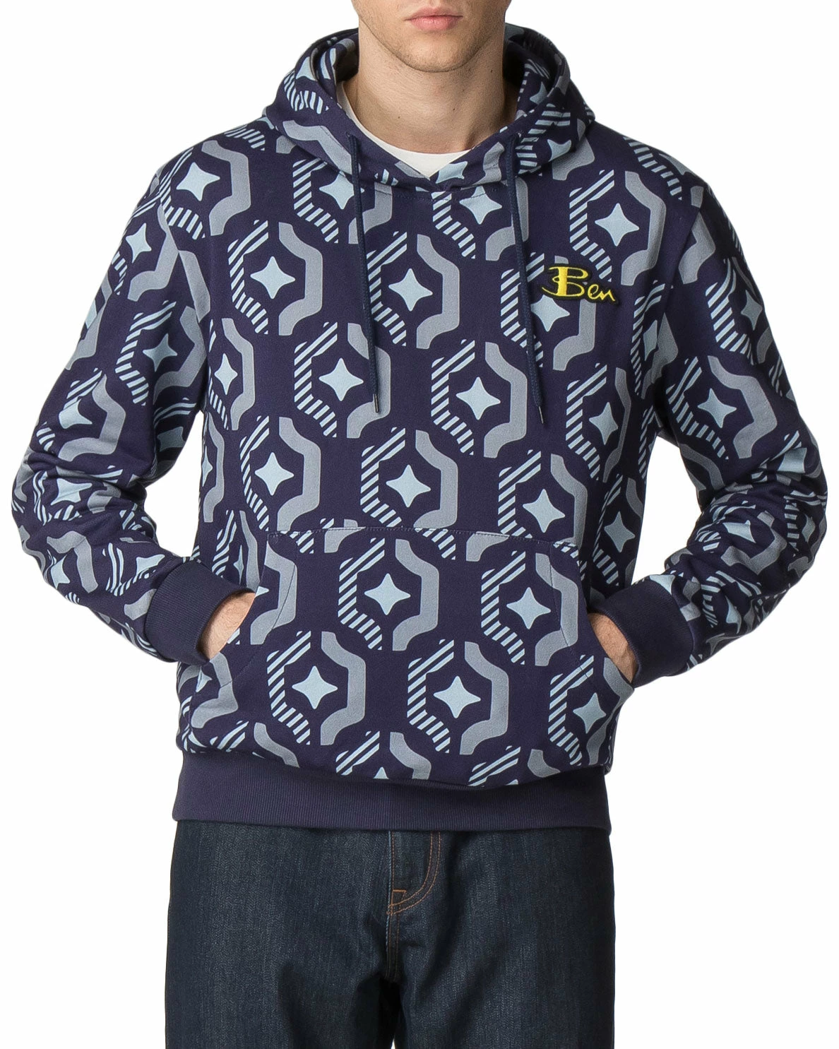 From the Ben Sherman x House of Holland collection, this standout style features a geometric wallpaper-inspired print with retro appeal. The vintage-style print is digitally printed onto the zip-up hoodie silhouette for a modern finish. Our signature “Ben” logo in bright yellow stands out on the blue background.