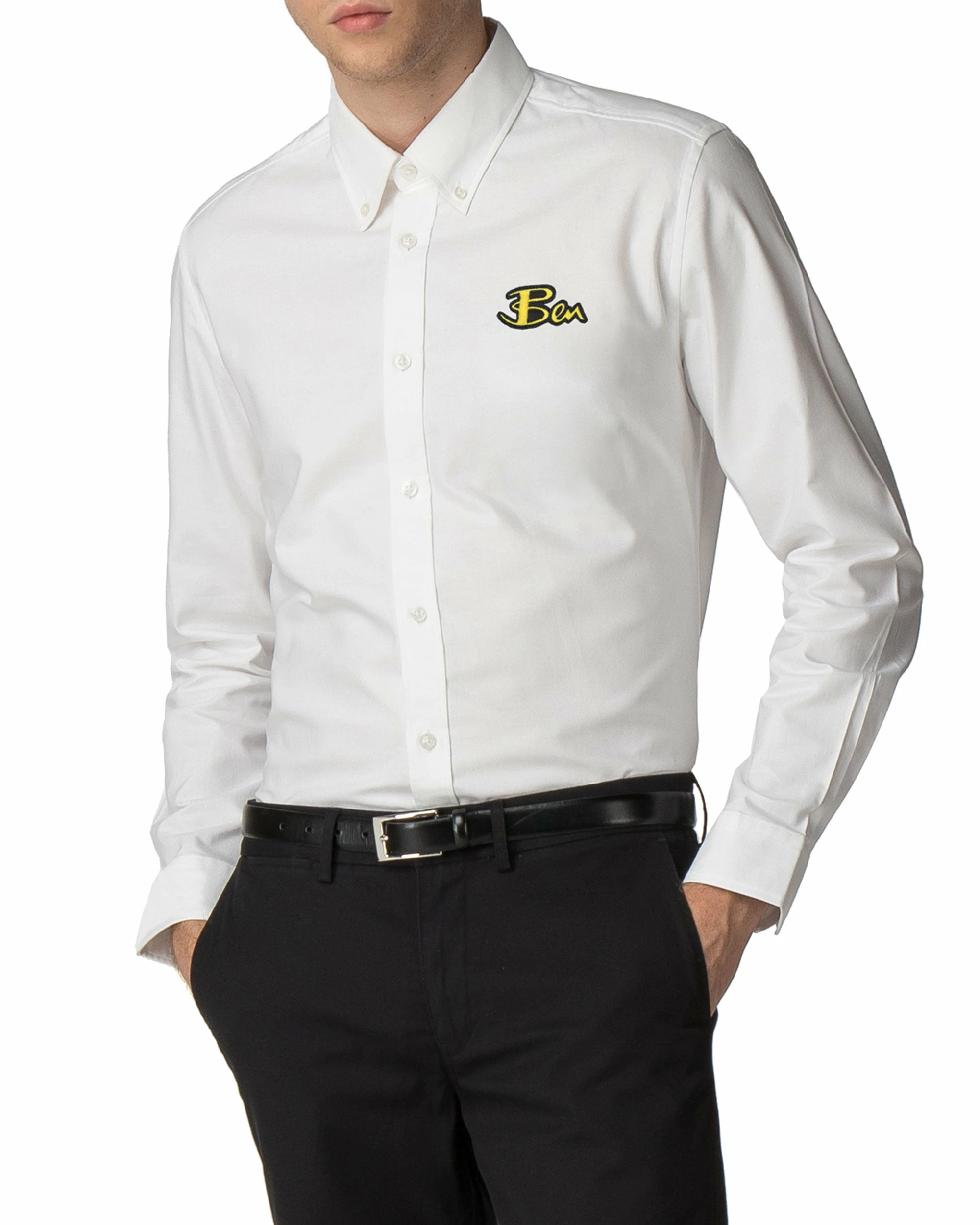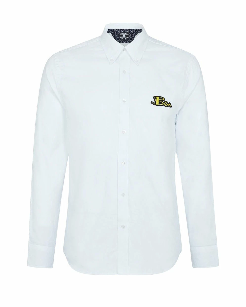 From the Ben Sherman x House of Holland collection, this is a classic Oxford-style shirt in crisp white with a bright yellow “Ben” logo and color-pop purple lining interior. A limited-edition style, this is a signature Ben Sherman shirt with subtle House of Holland details.