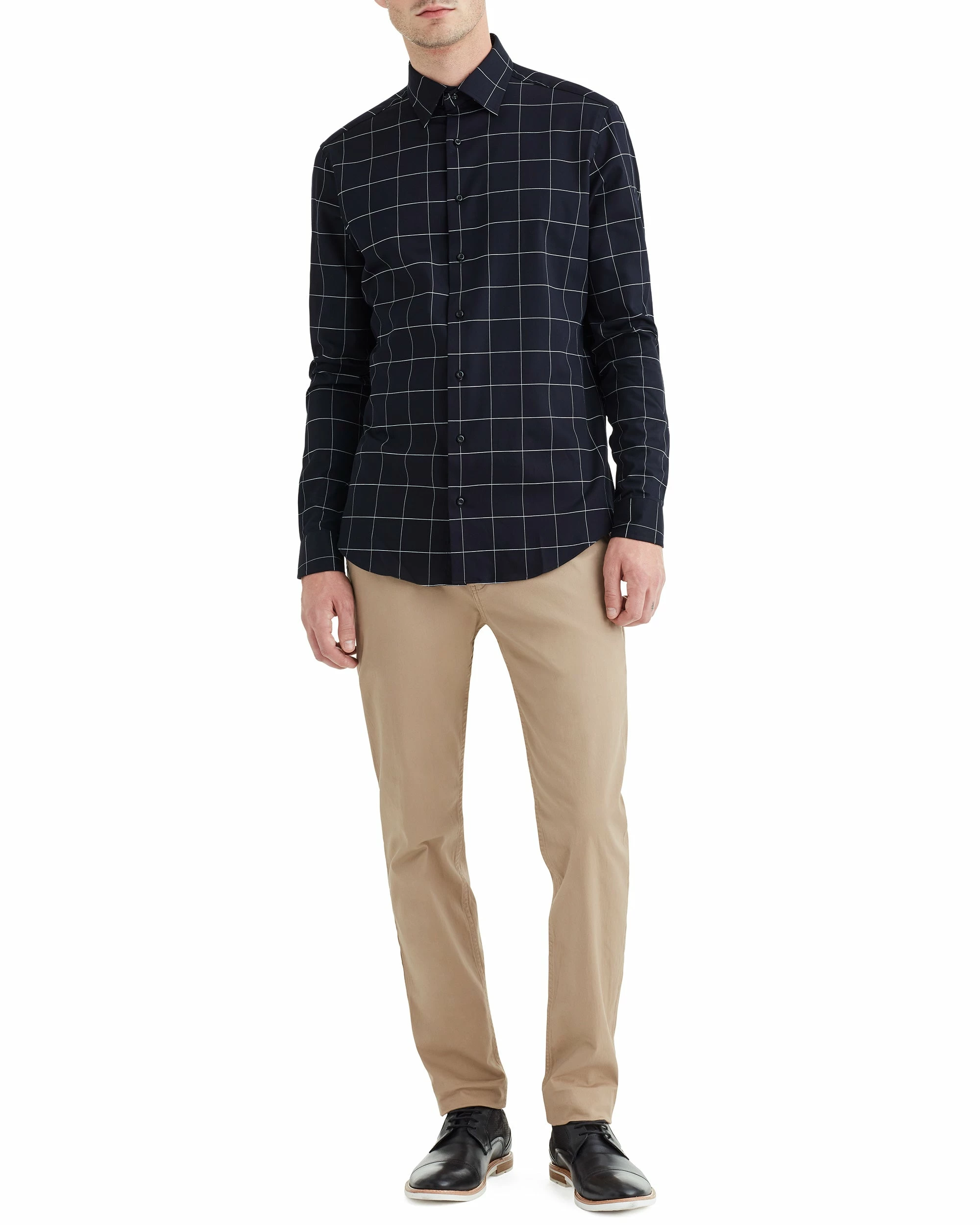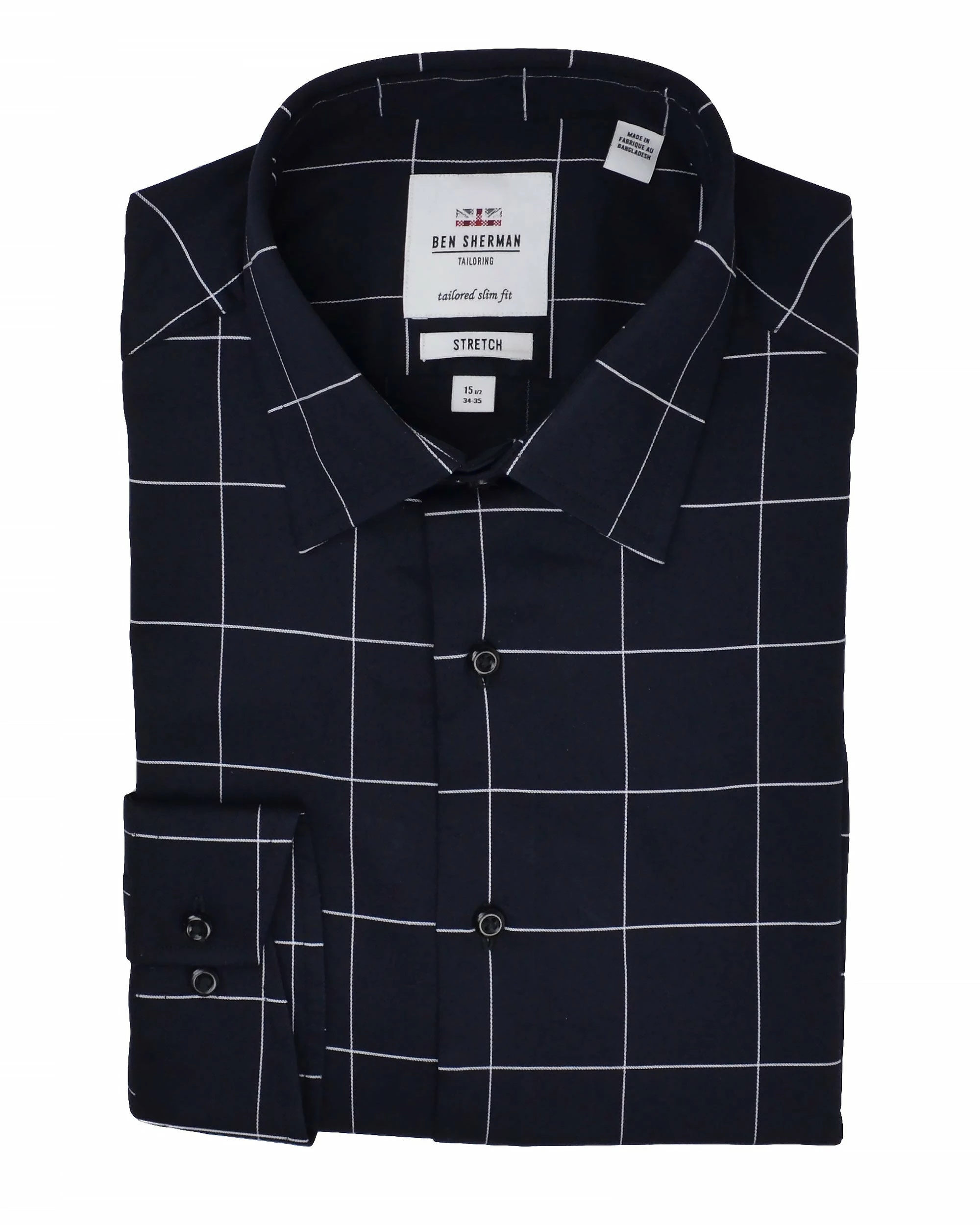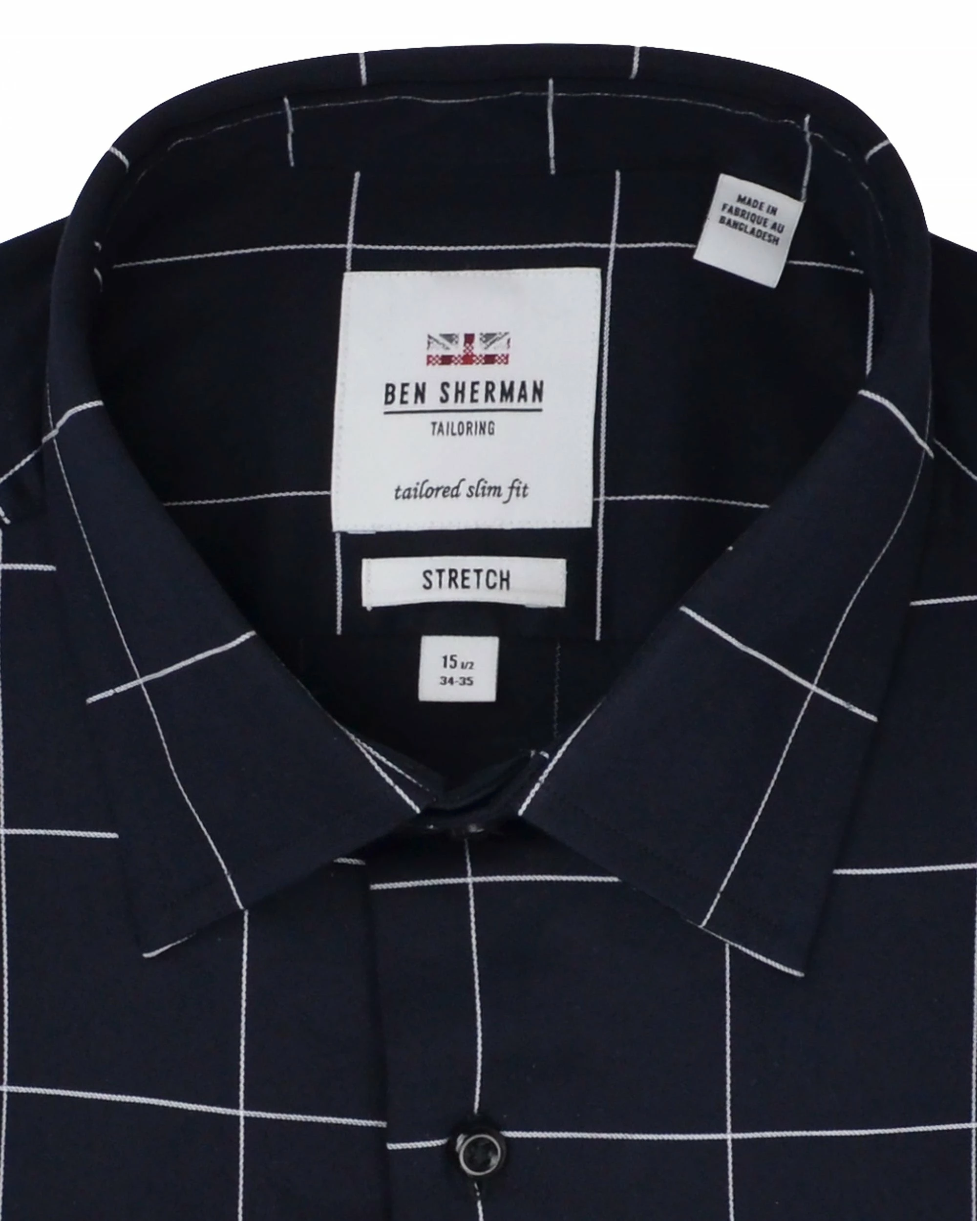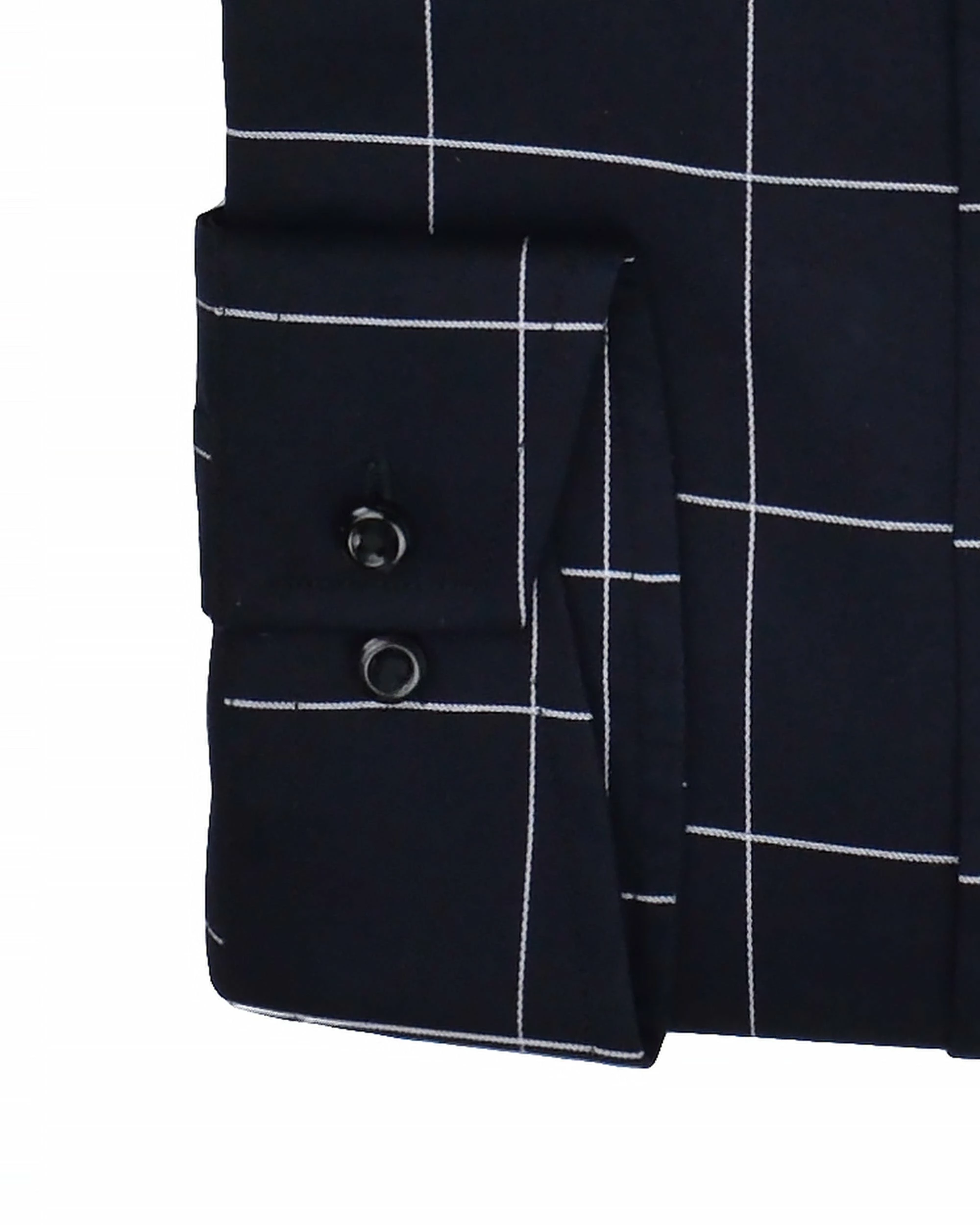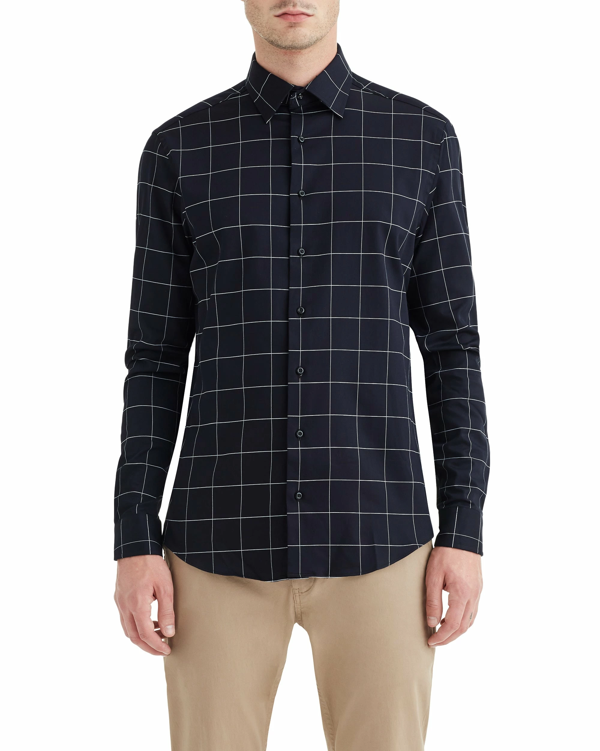 The Black Windowpane Check Slim-Fit Dress Shirt features a fine white windowpane check detail. Cut to our King’s slim fit in 100% cotton.