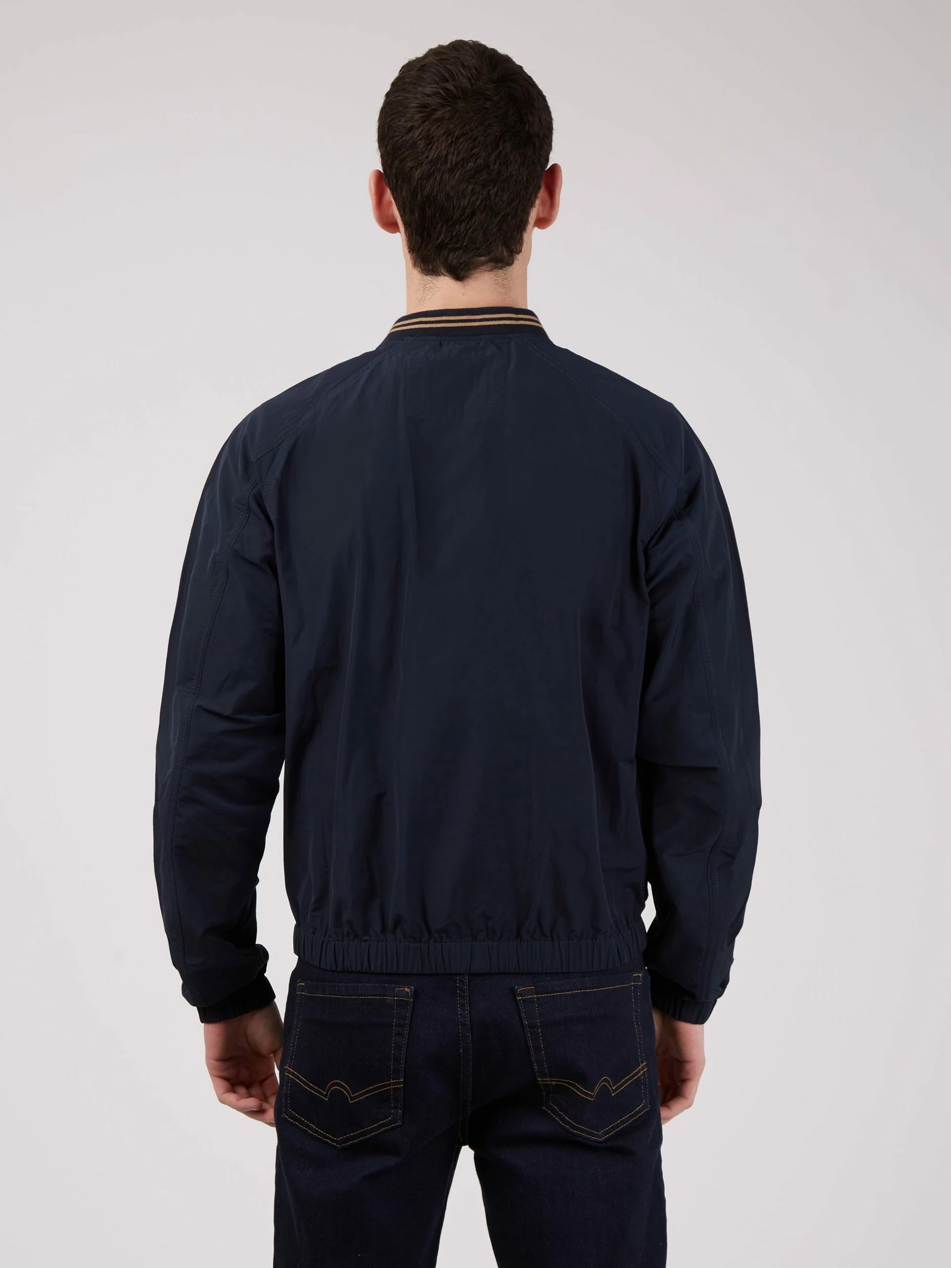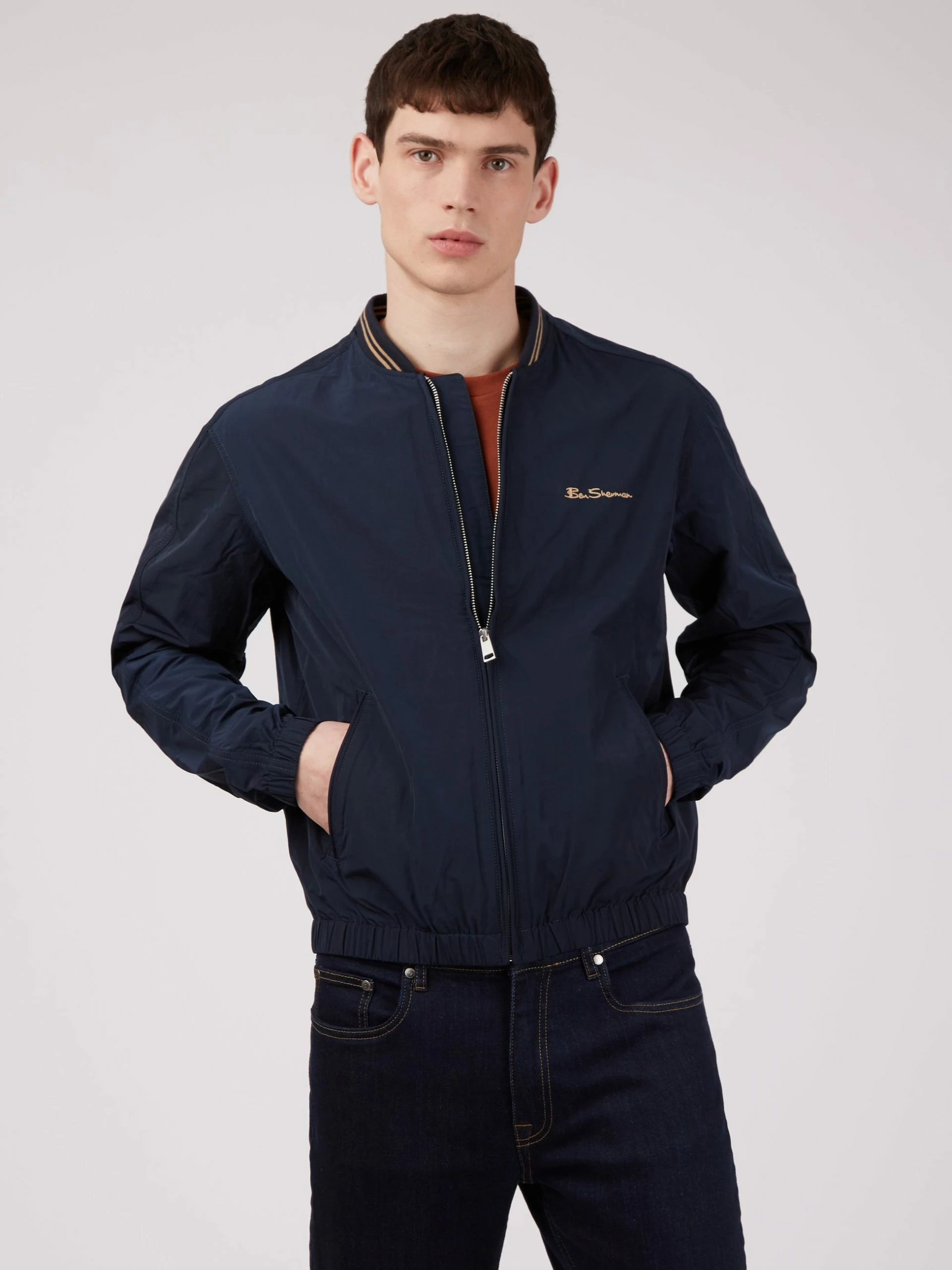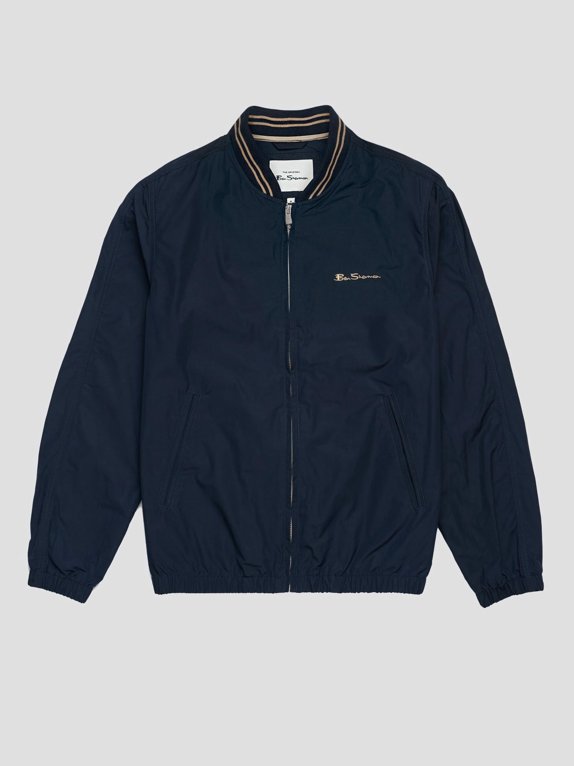 A blouson style jacket with a raglan sleeve setting in a polyester blend fabric. Features include a bomber style rib collar, elasticated cuffs and hem, 2 external front cord piped pockets and embroidered Ben Sherman branding to the chest.
