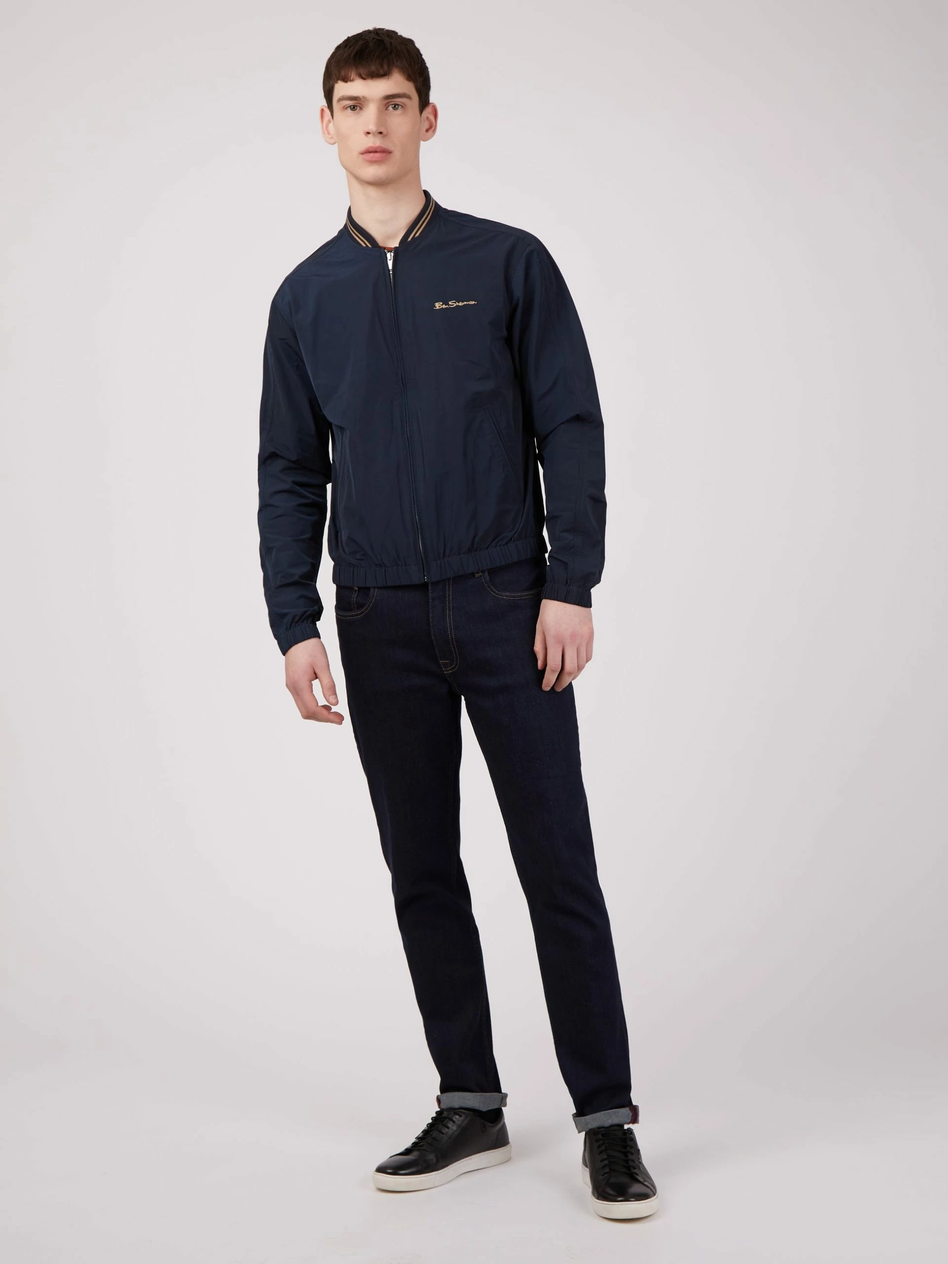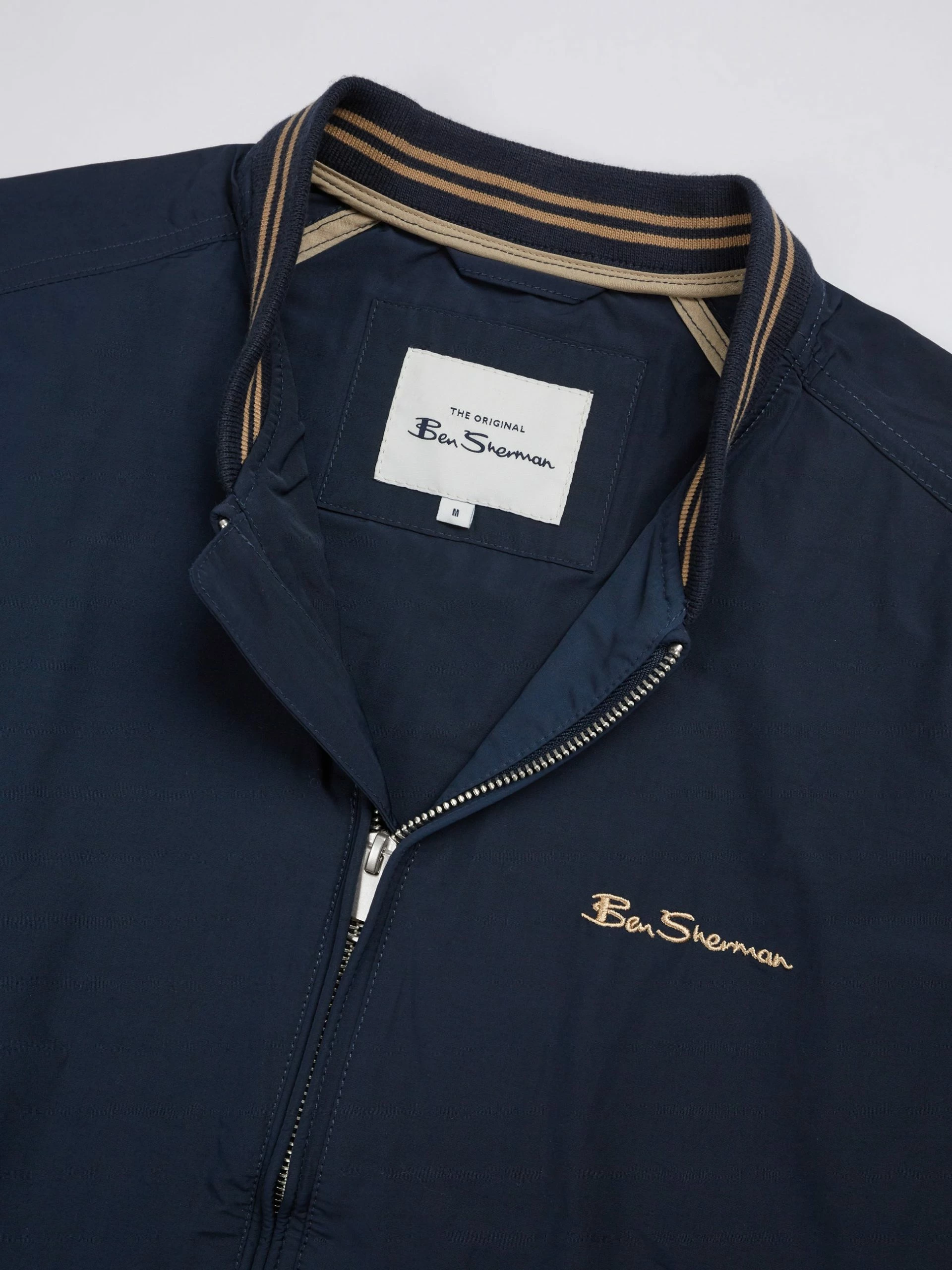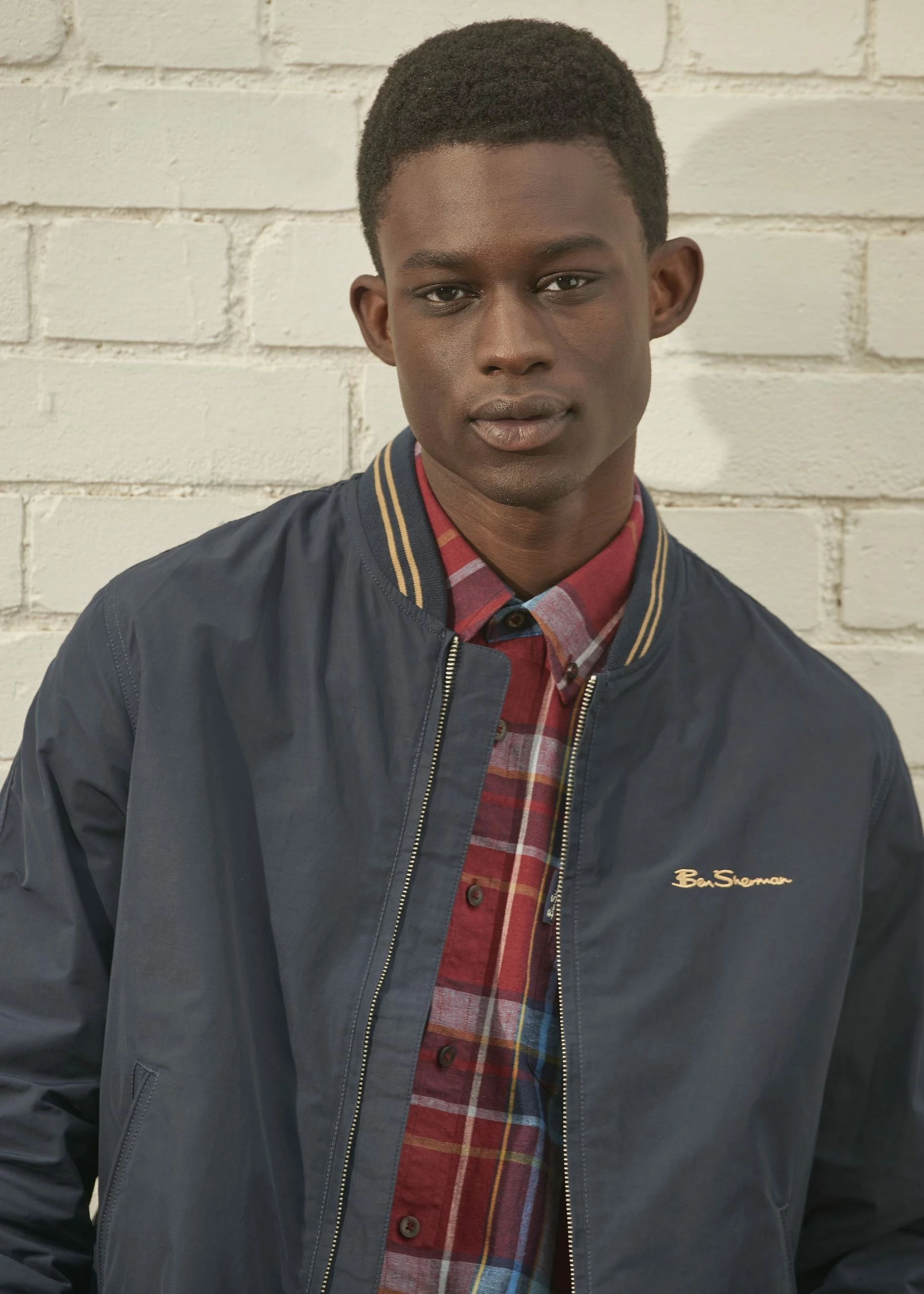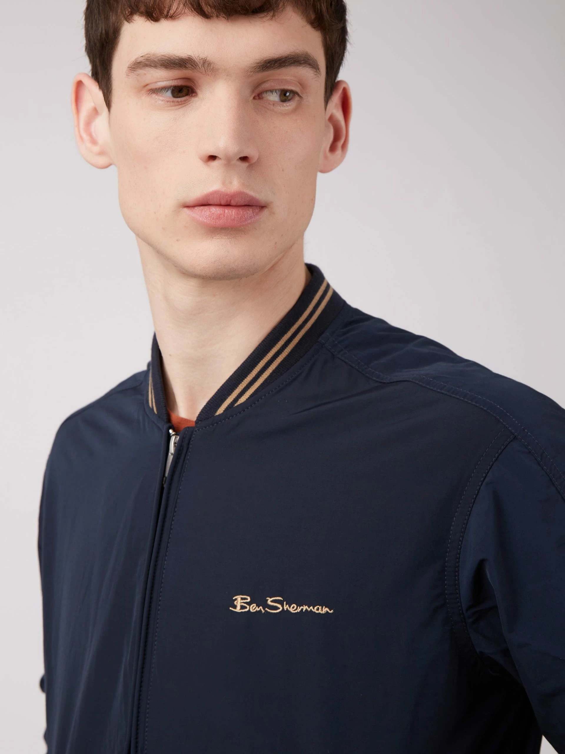 A blouson style jacket with a raglan sleeve setting in a polyester blend fabric. Features include a bomber style rib collar, elasticated cuffs and hem, 2 external front cord piped pockets and embroidered Ben Sherman branding to the chest.