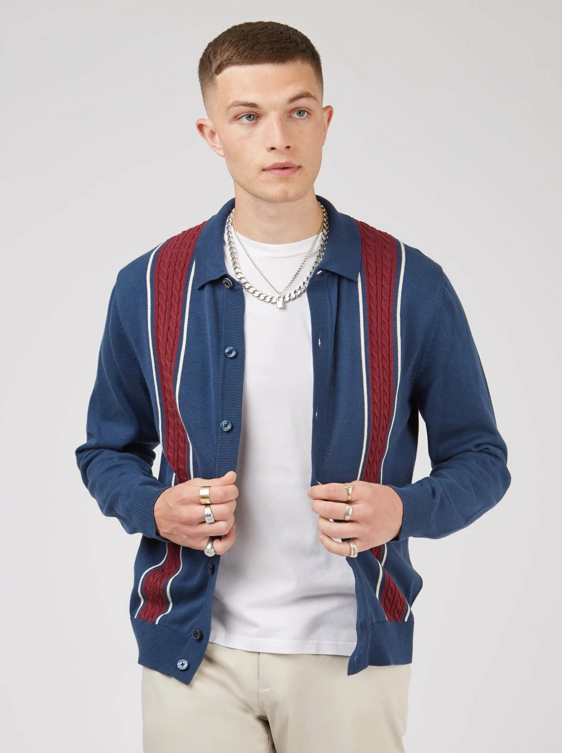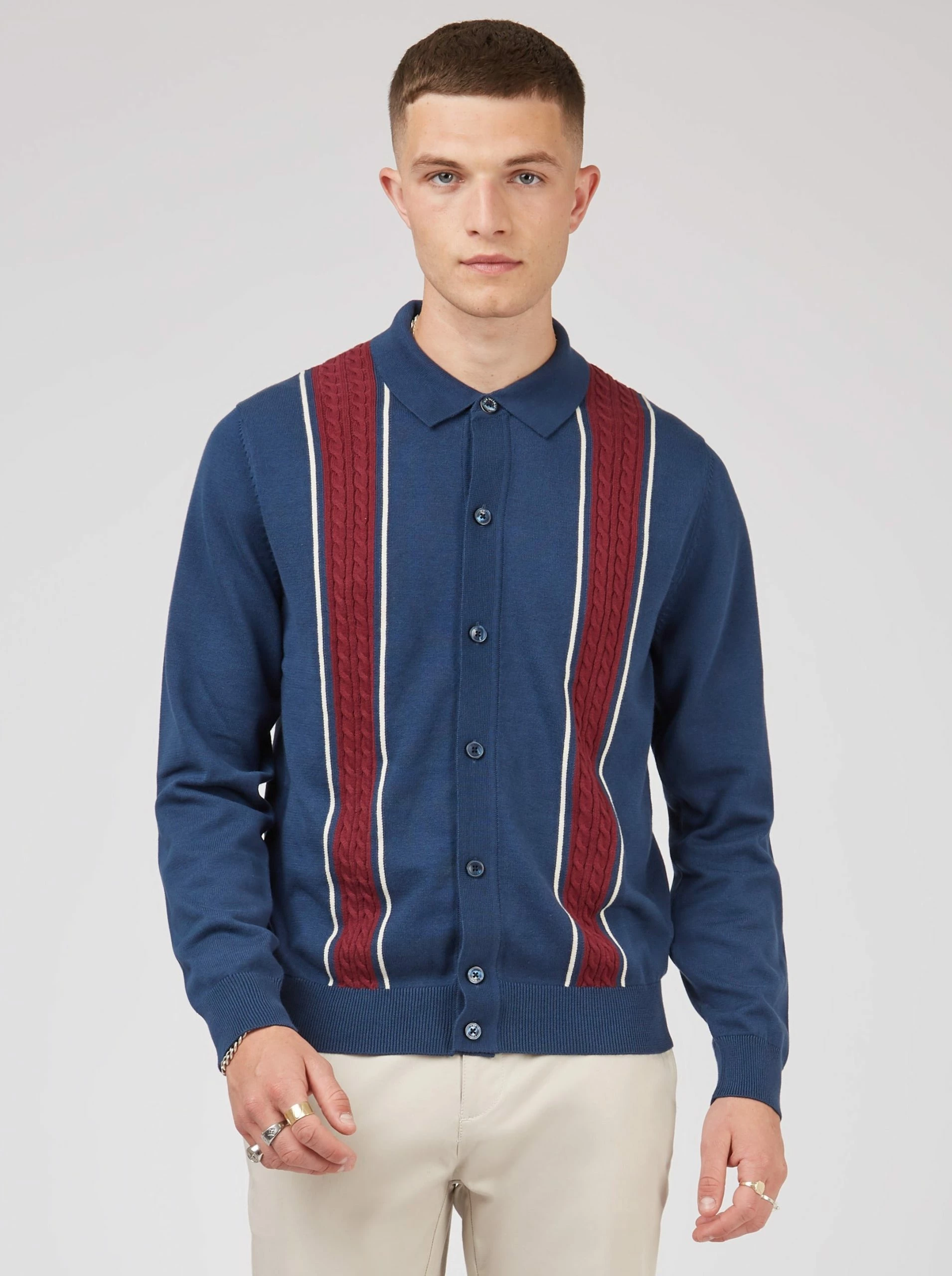 Long sleeve knitted polo designed with a button through front. Features a contrast vertical cable stripe to the front and branded with the signature Ben Sherman woven side tab.