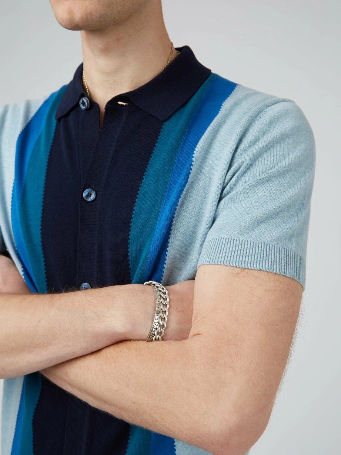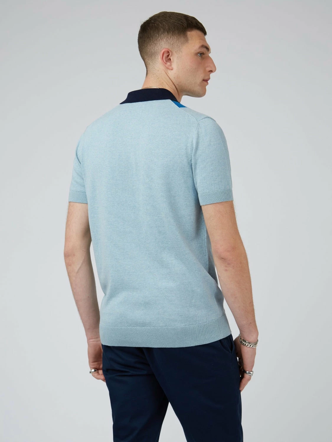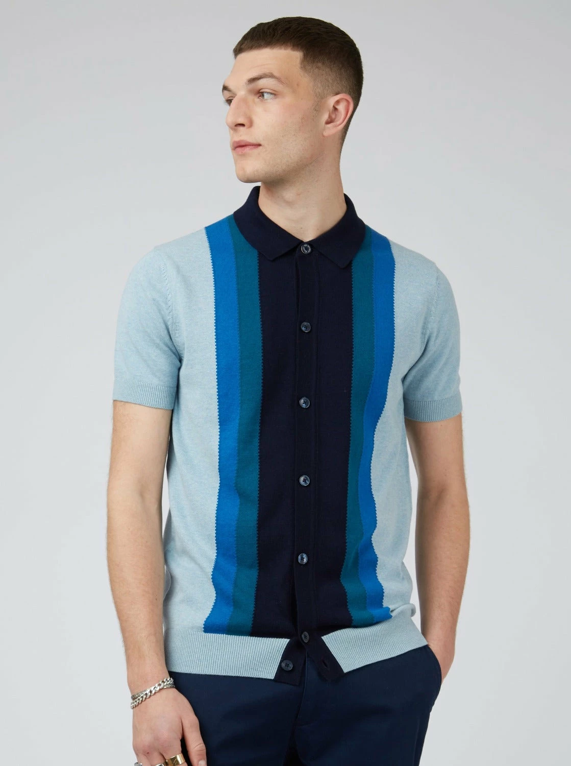 Introducing our stylish Short-Sleeve Sweater Polo – the perfect addition to your wardrobe. Featuring a button-through style, this polo is designed with striking blue color and vertical mod stripe to the front in contrasting colors, making it a standout piece.