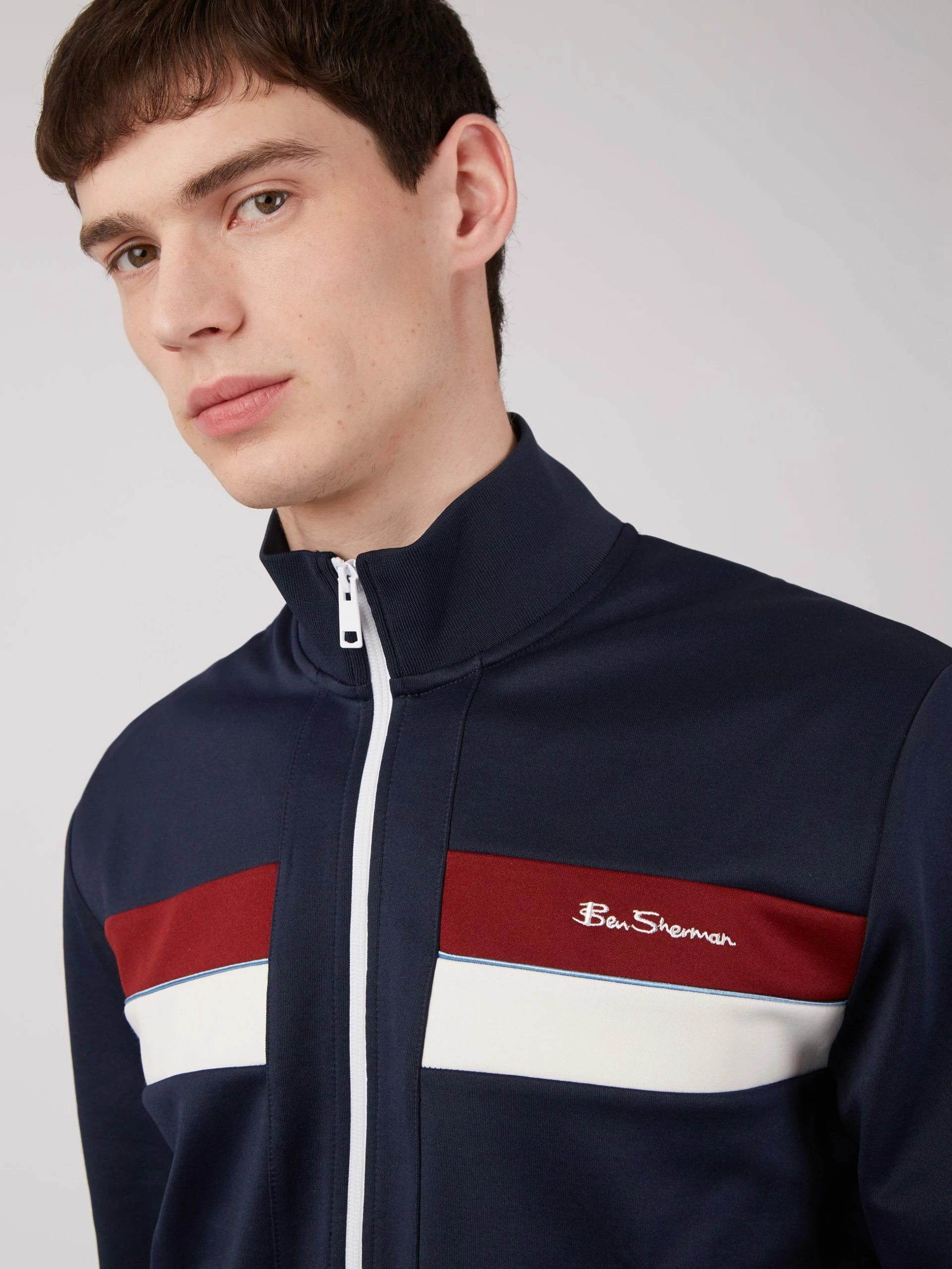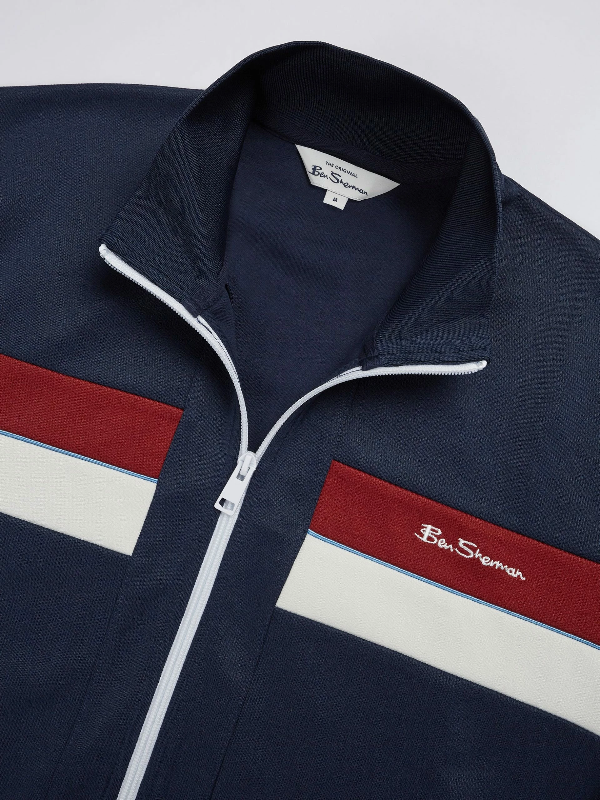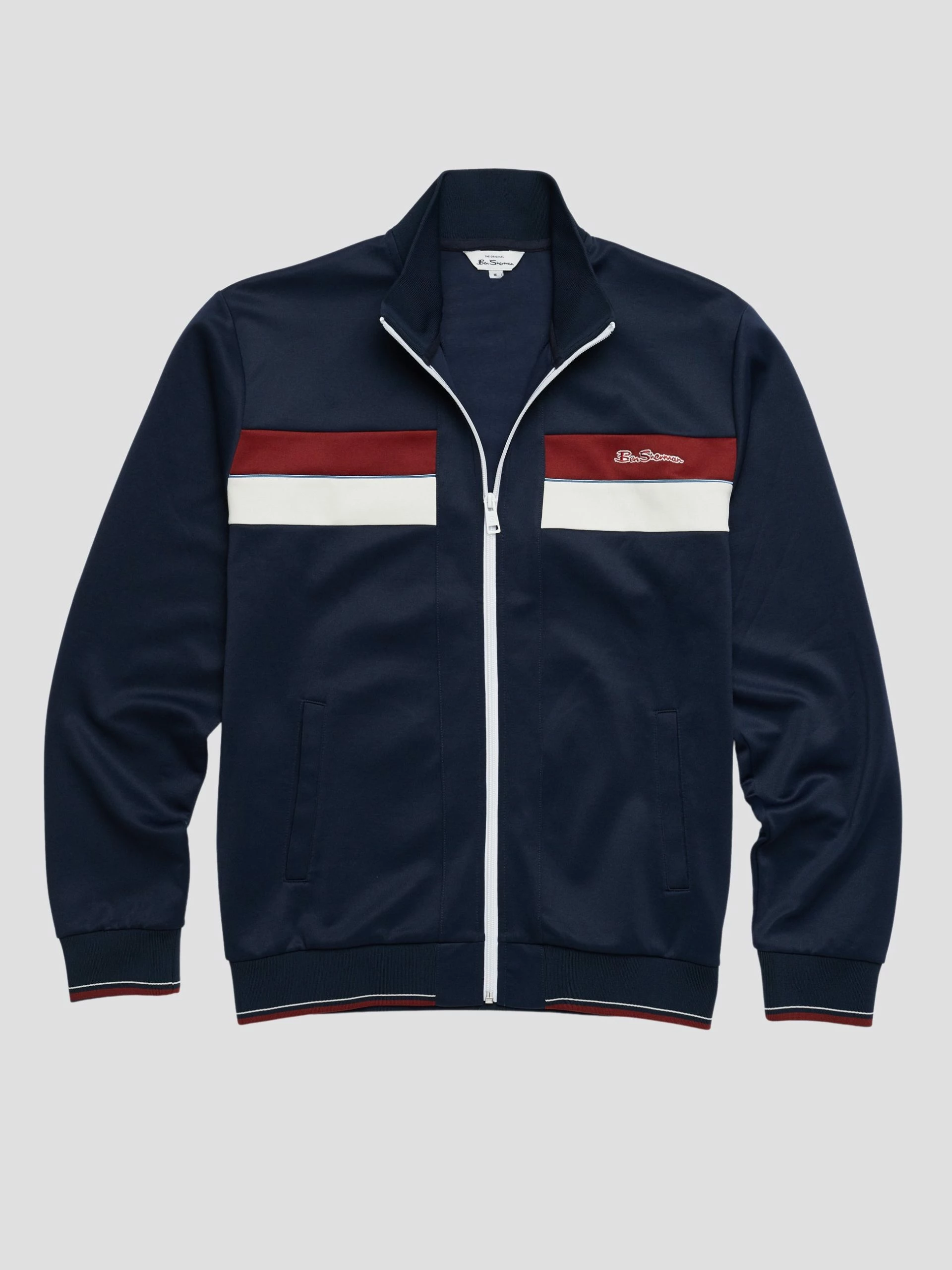 Sports influenced zip through tricot track top in a regular fit. Designed with contrast paneling to the front and a contrast center zip fastening. Finished with contrast mod stripe tipping at the hem and cuffs and branded with the Ben Sherman signature chest embroidery.