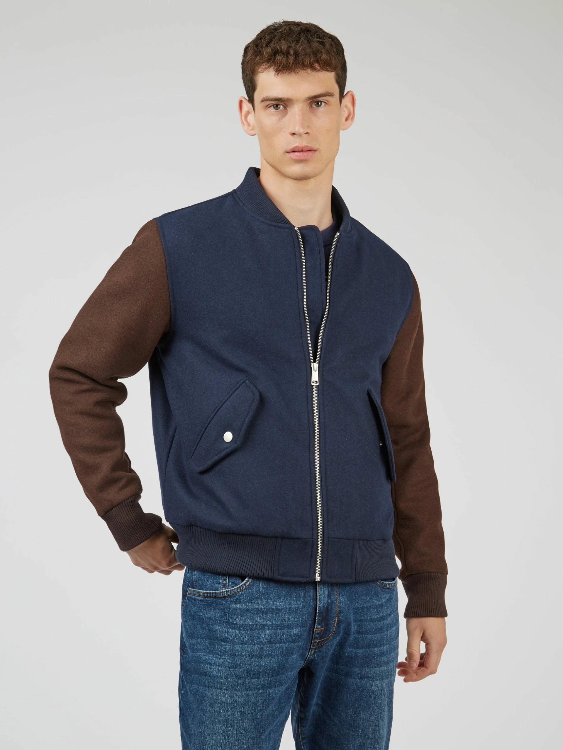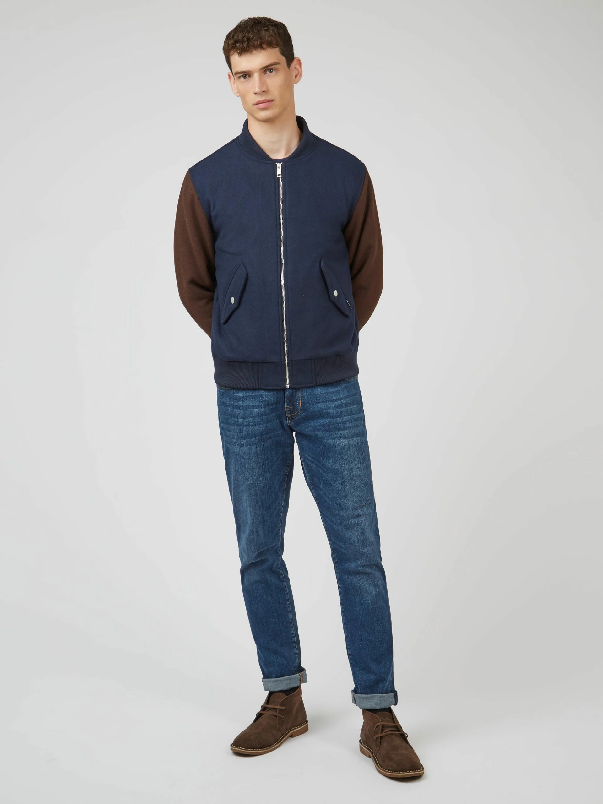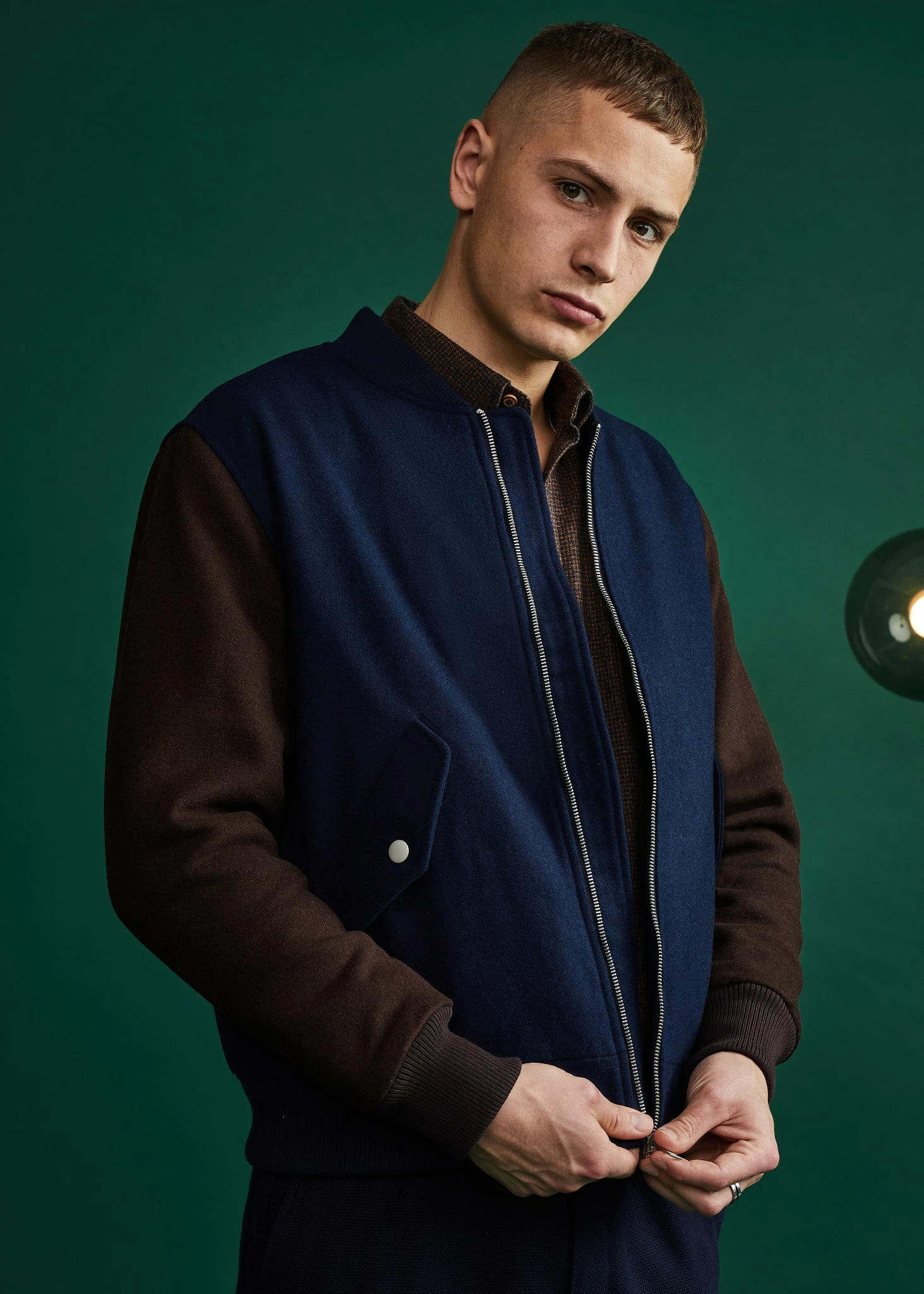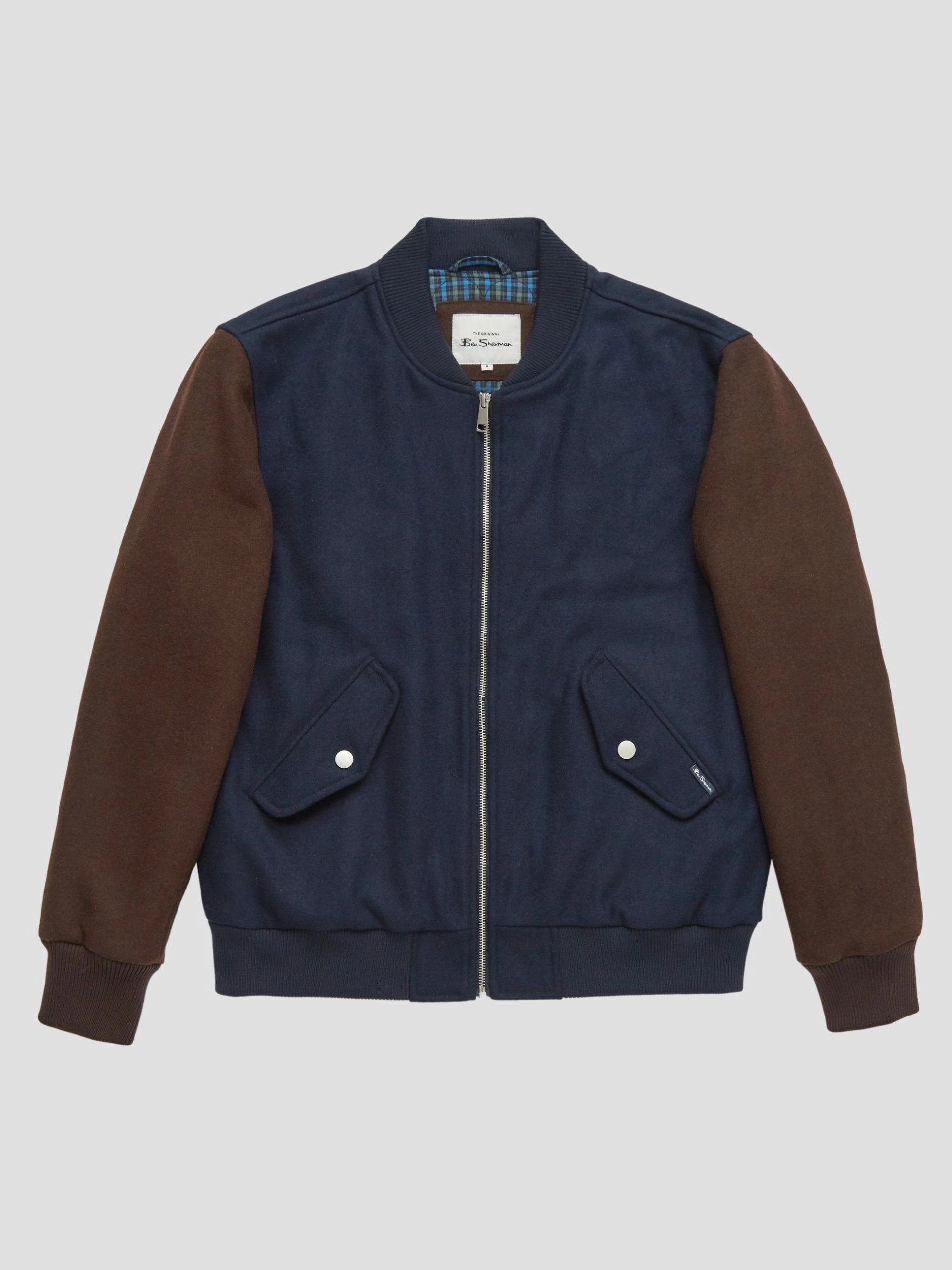 A bomber jacket in a colour block wool blend fabric. Features include wadded house check lining, ribbed neck, cuffs and hem and 2 front pockets with a ‘Ben Sherman’ branded flag label inserted.