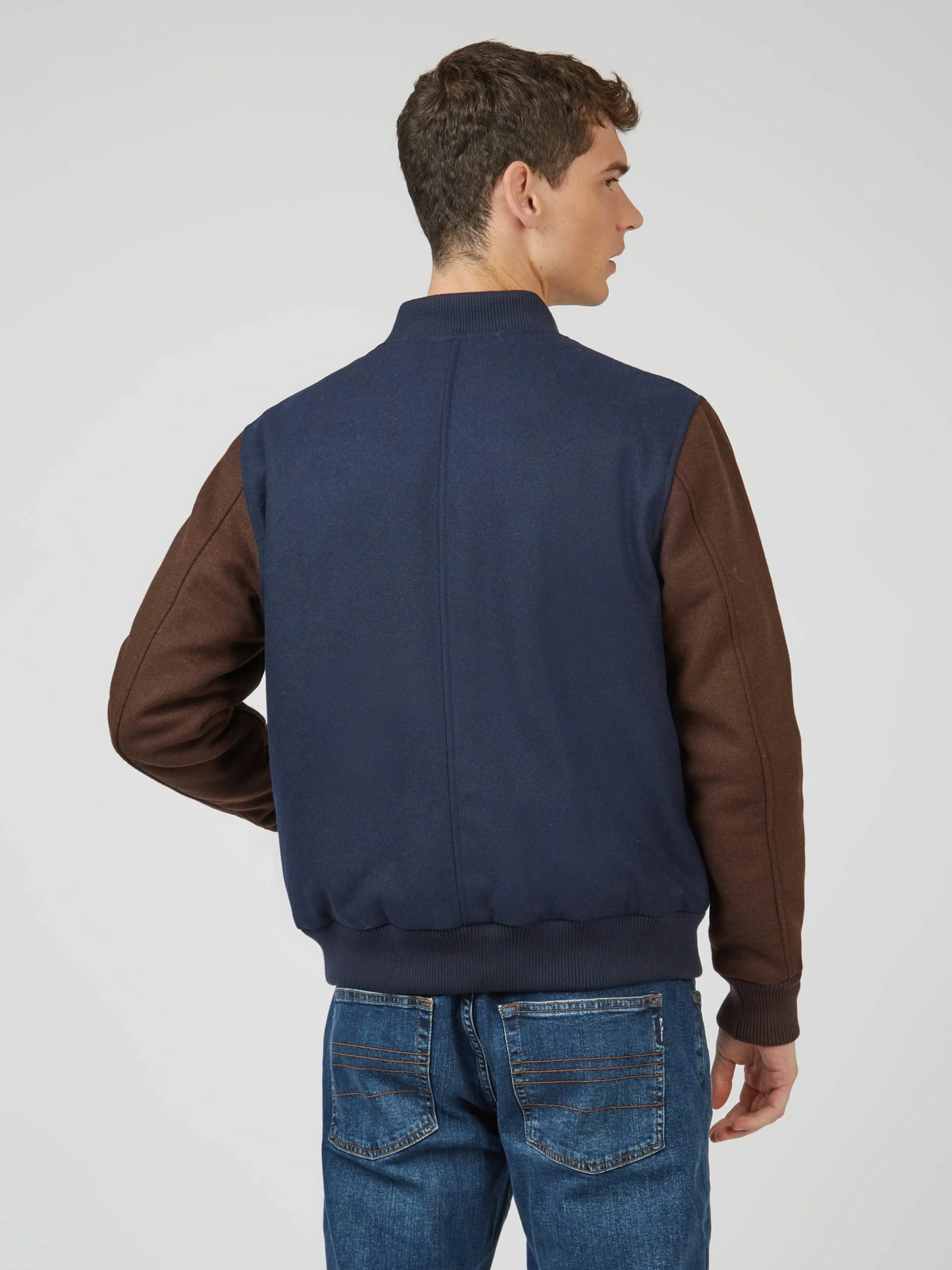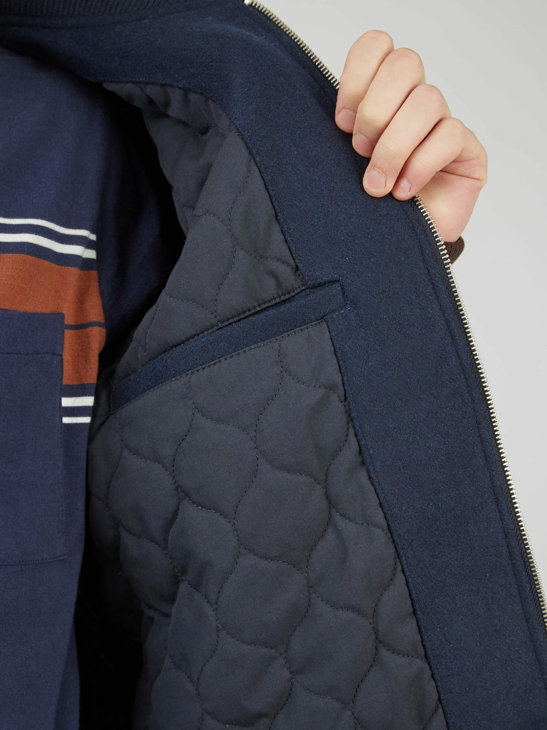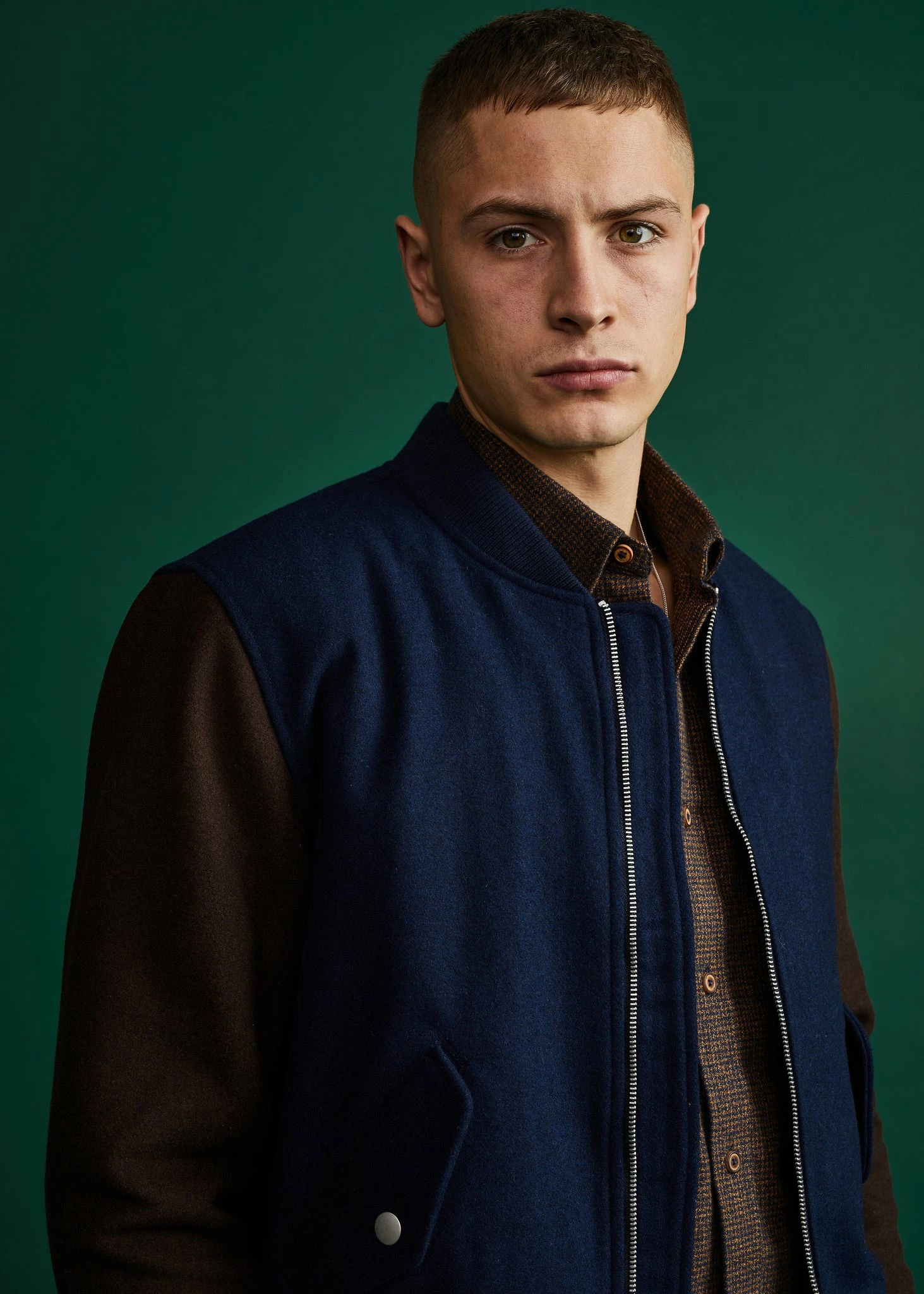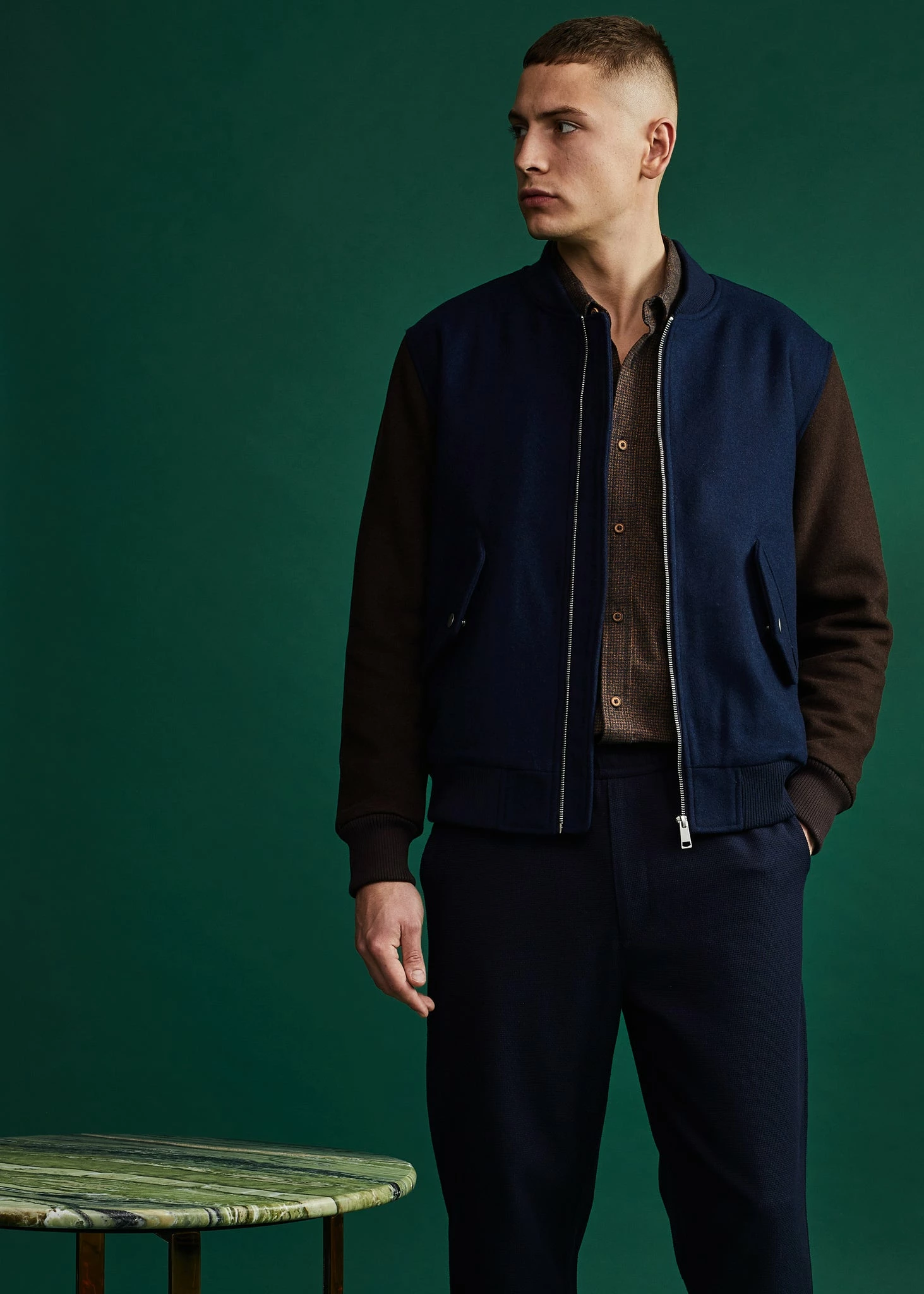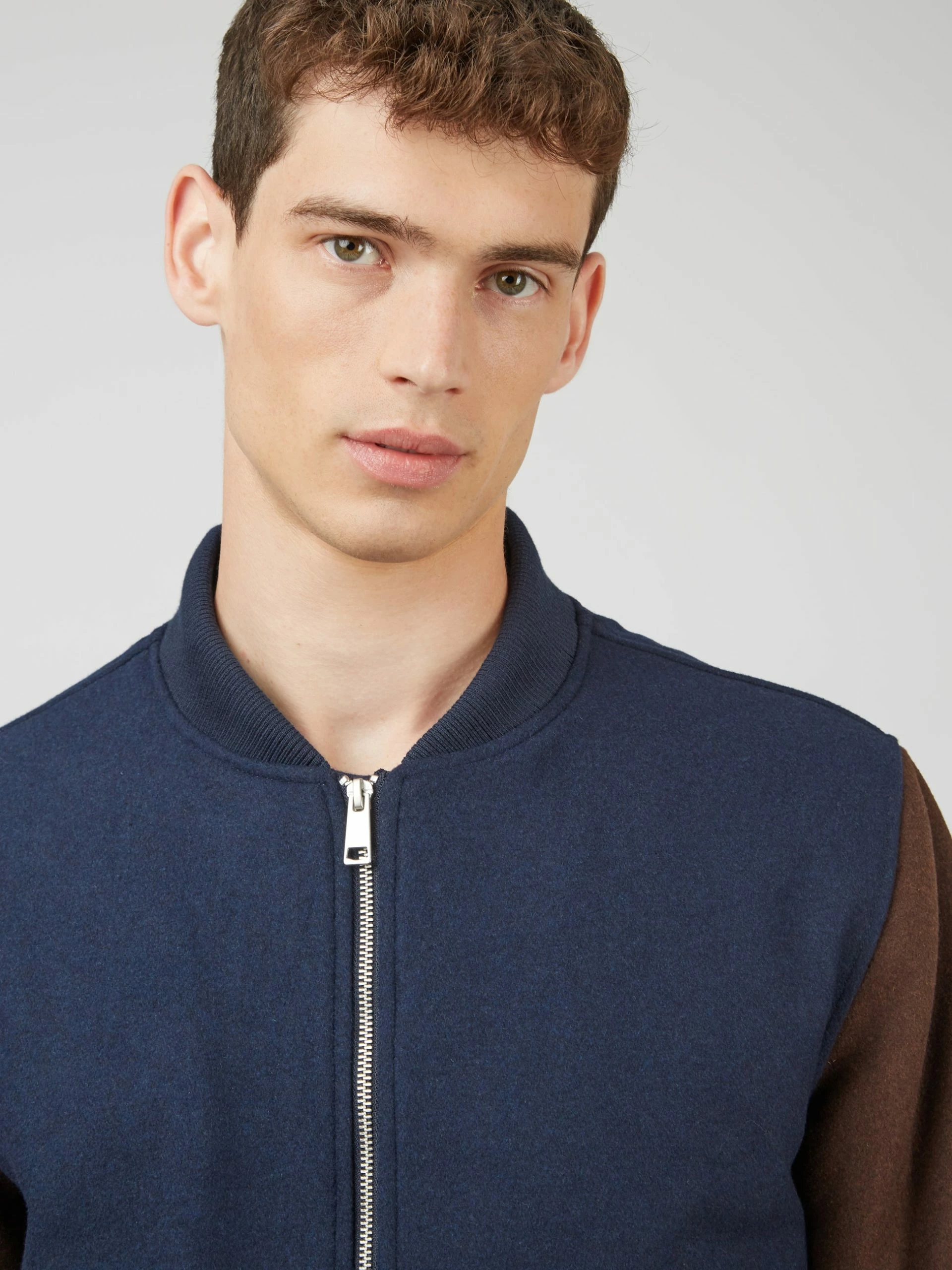 A bomber jacket in a colour block wool blend fabric. Features include wadded house check lining, ribbed neck, cuffs and hem and 2 front pockets with a ‘Ben Sherman’ branded flag label inserted.