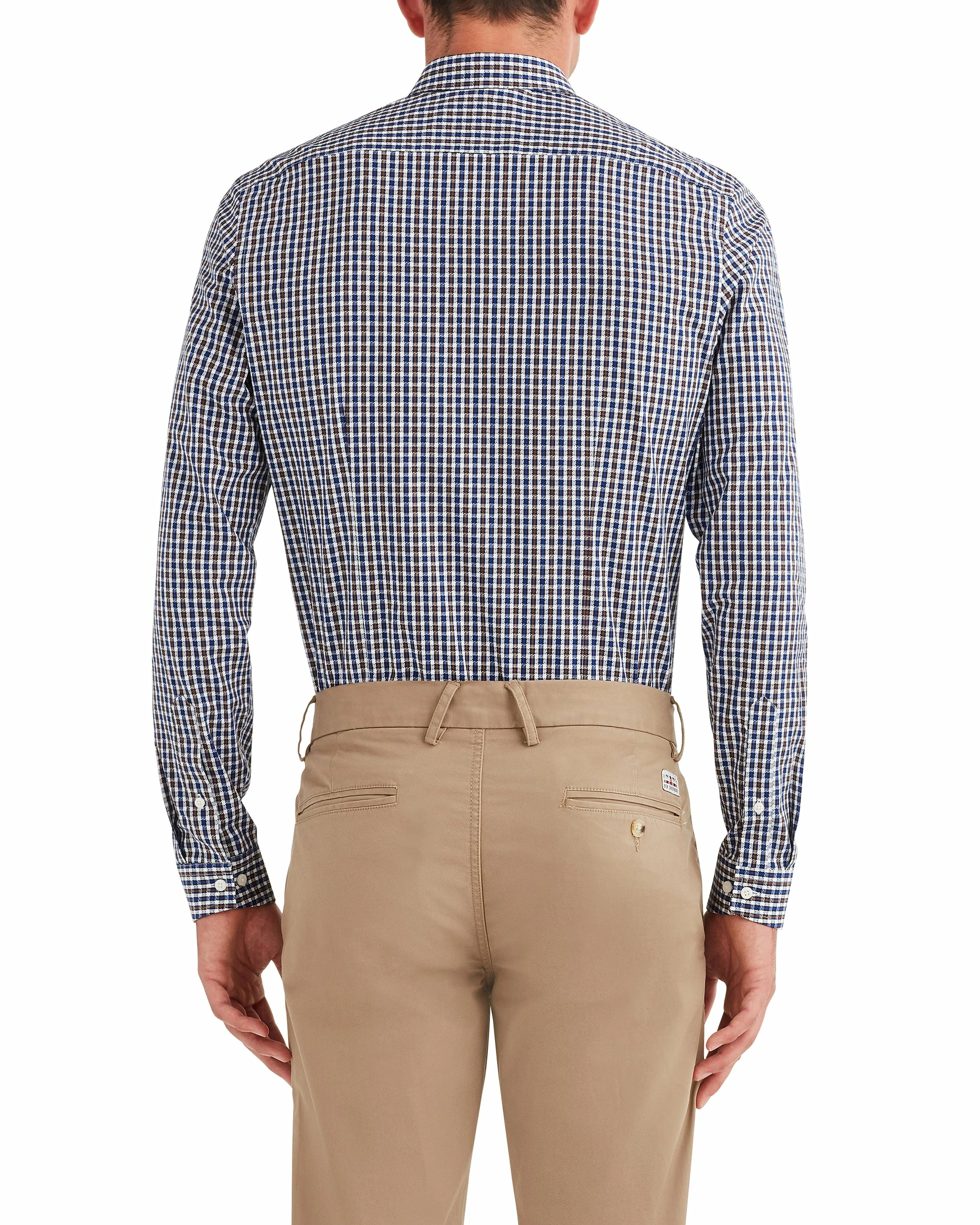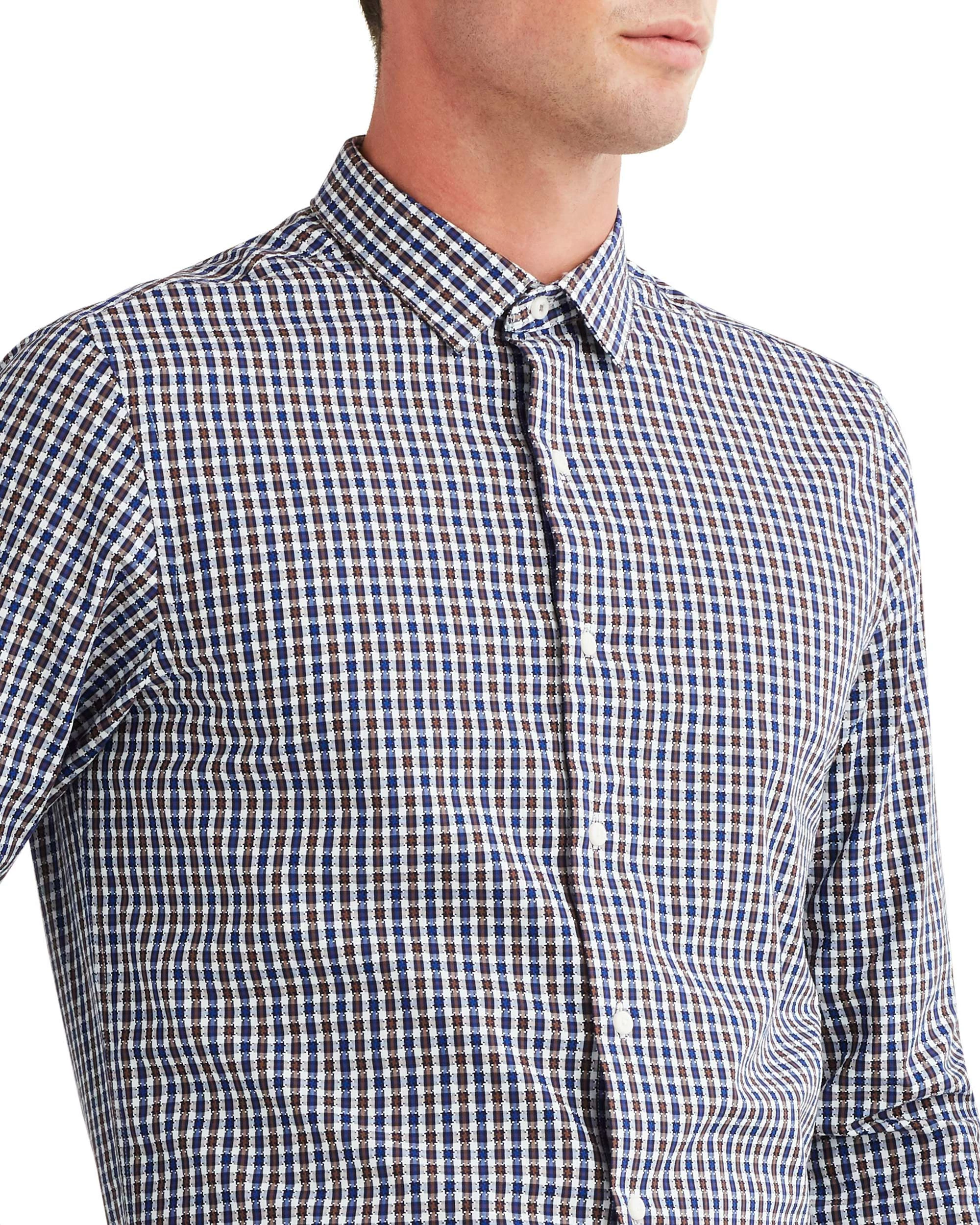 The Brown & Blue Dobby Check Dress Shirt is cut to a skinny fit with 100% cotton and dobby texturing. The check pattern gives an instant wardrobe update.