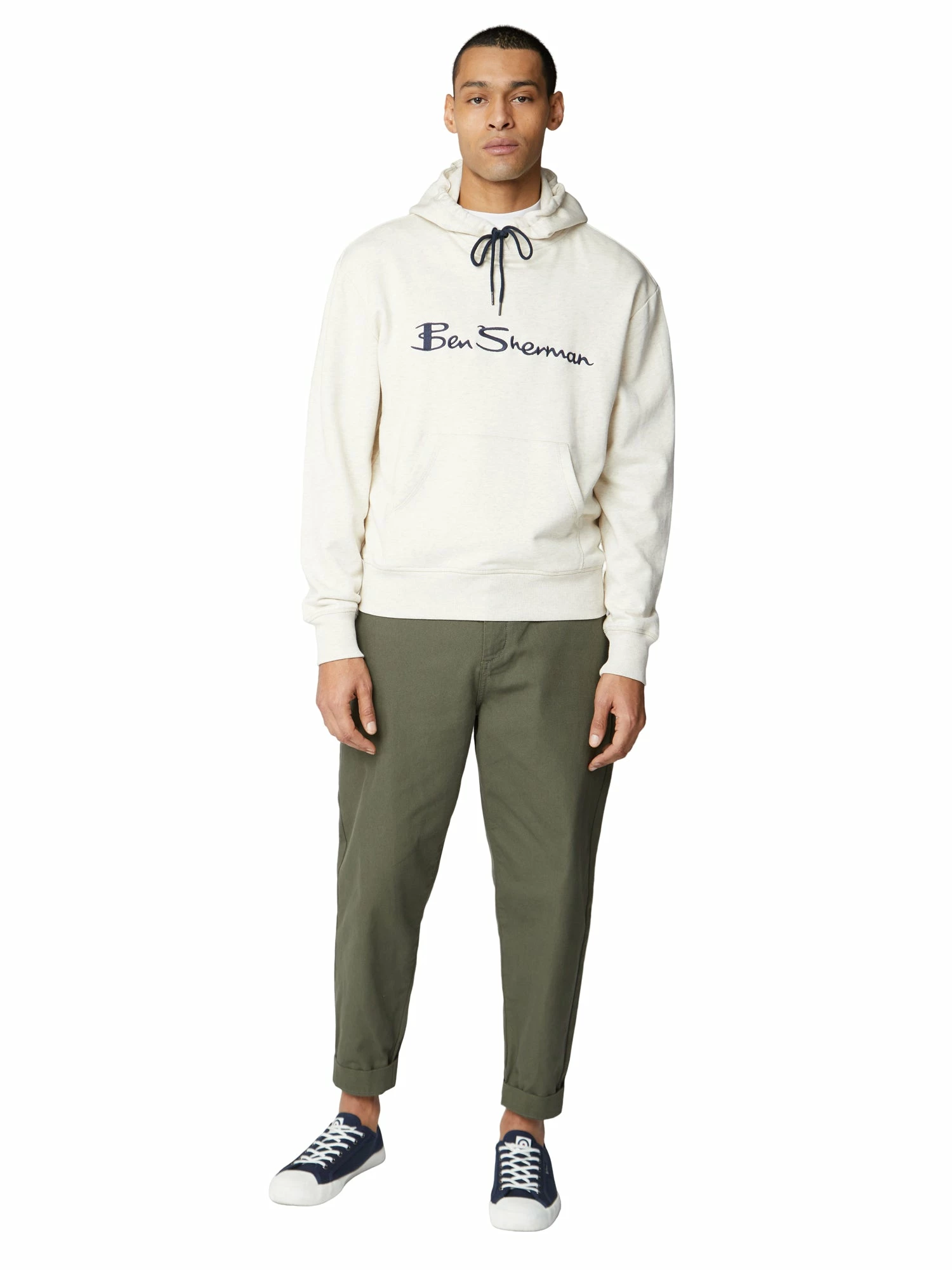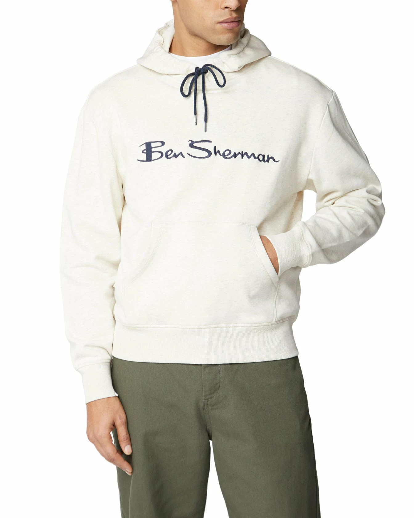 Our signatured cotton loopback hoodie featsures oversized “Ben Sherman” chest embroidery and ribbed hem and cuffs. A front pouch pocket completes the classic hoodie style.