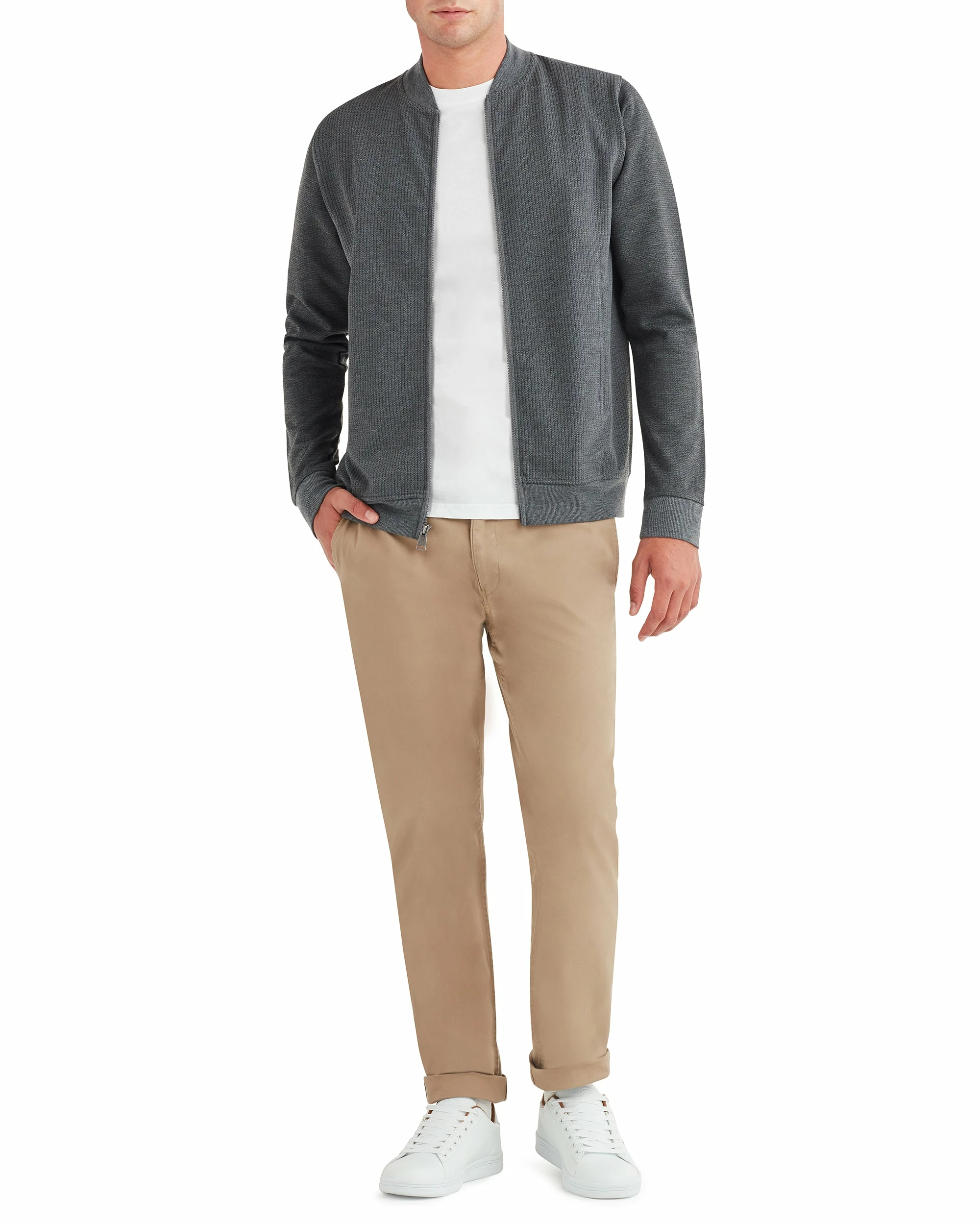 A lightly textured herringbone jacquard adds a luxe update to this classic bomber-style jacket. The result is a casual and cool jacket that’s a must-have light layer for fall.