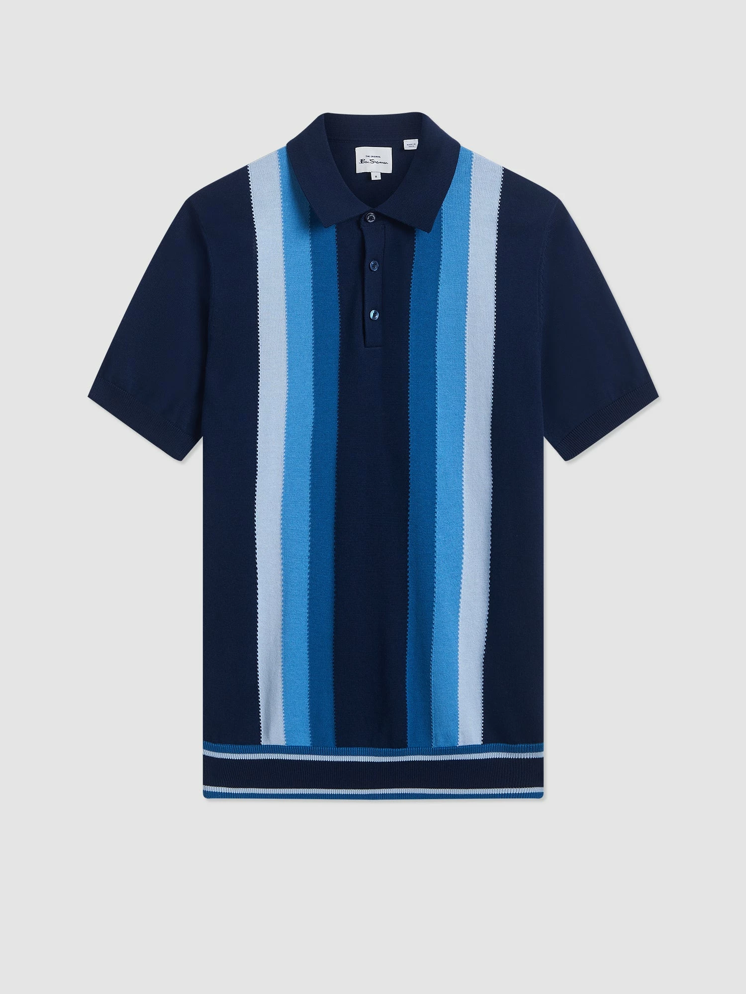 Our signature knitted polo is designed with a vertical stripe on the front and a raised texture for added interest. This mod polo is branded with a tonal signature “Ben Sherman” sleeve embroidery.