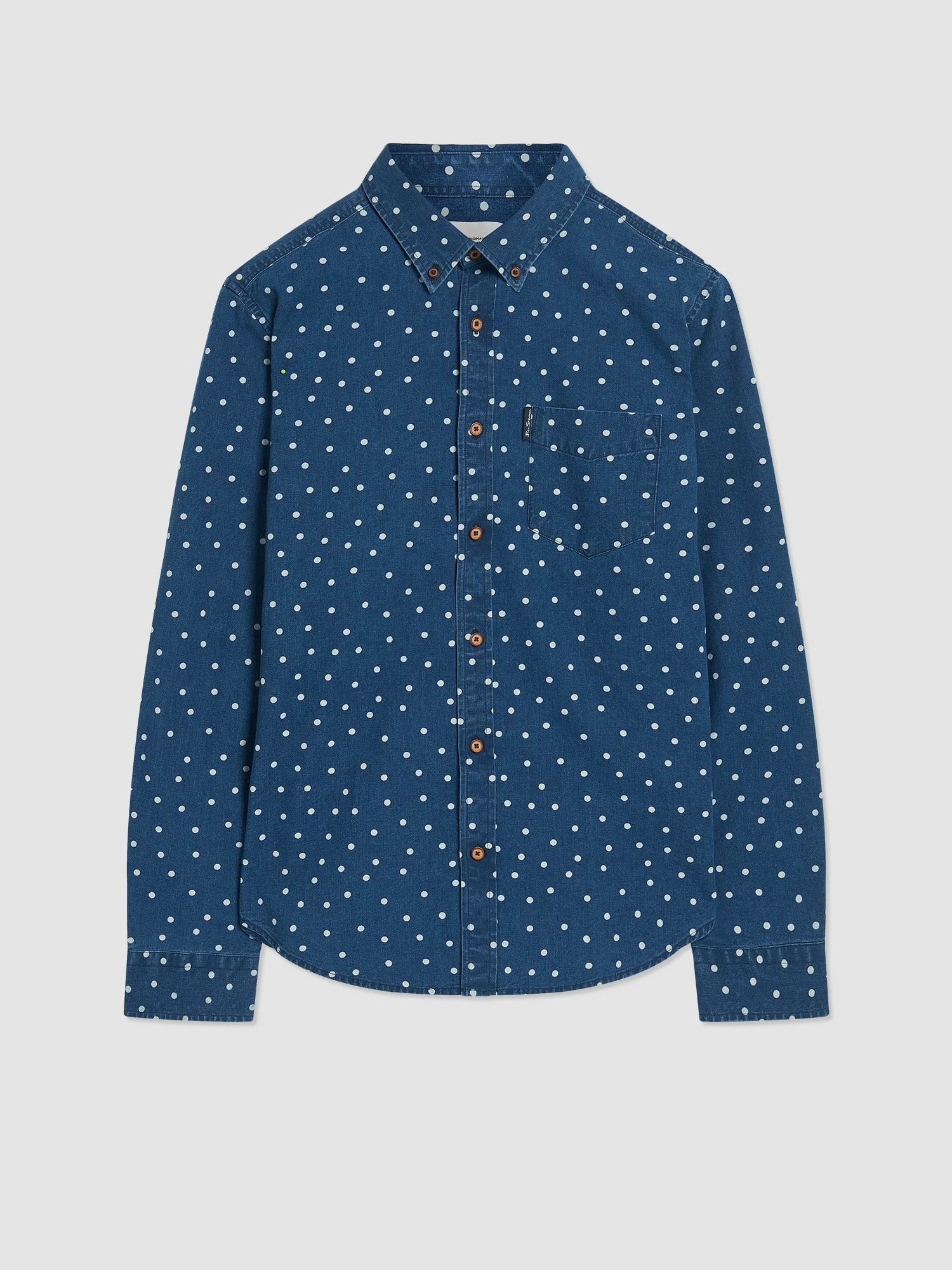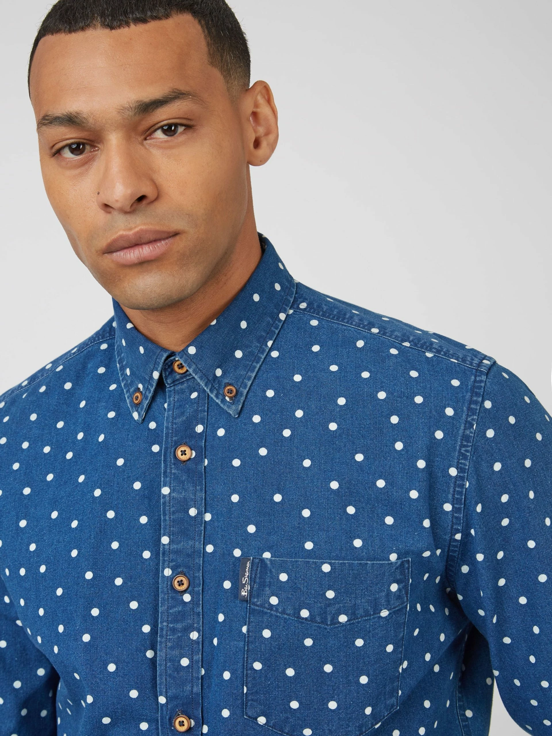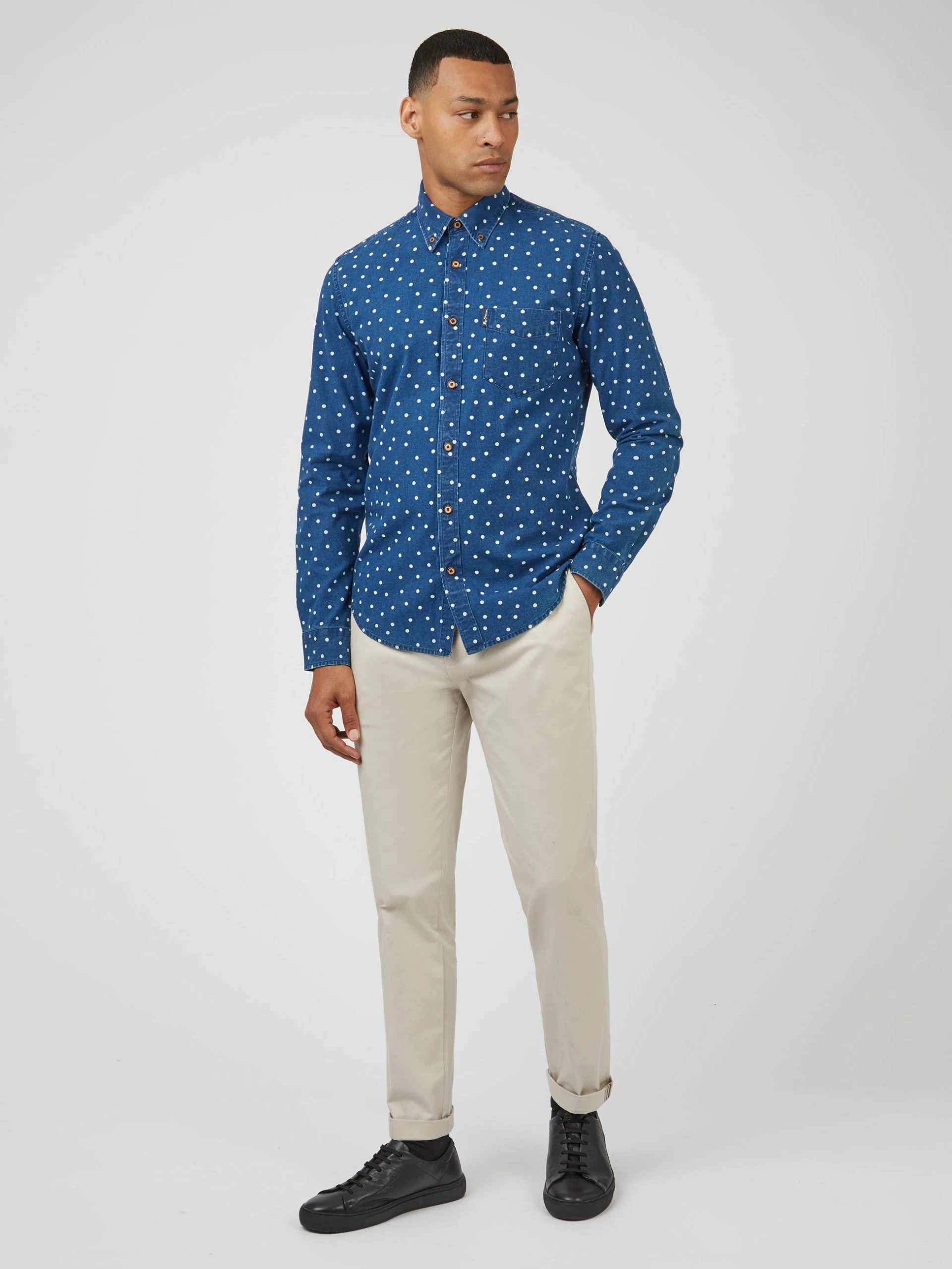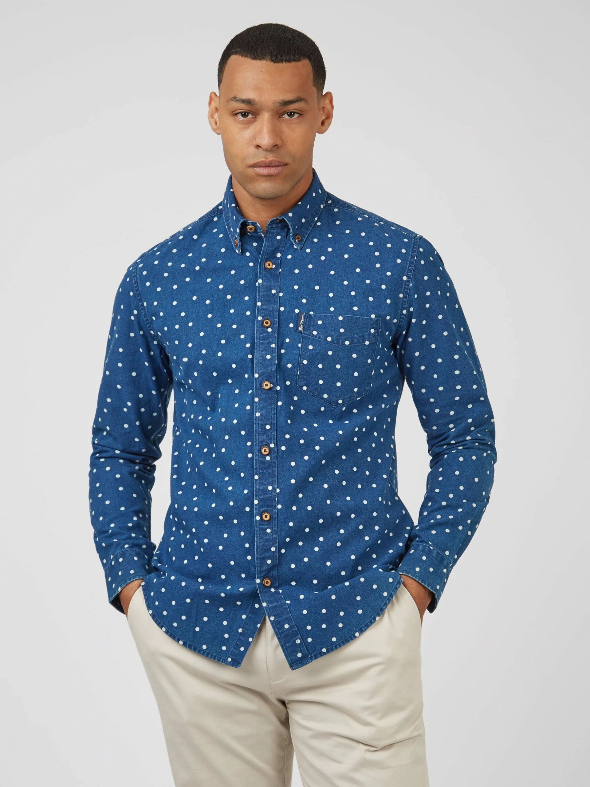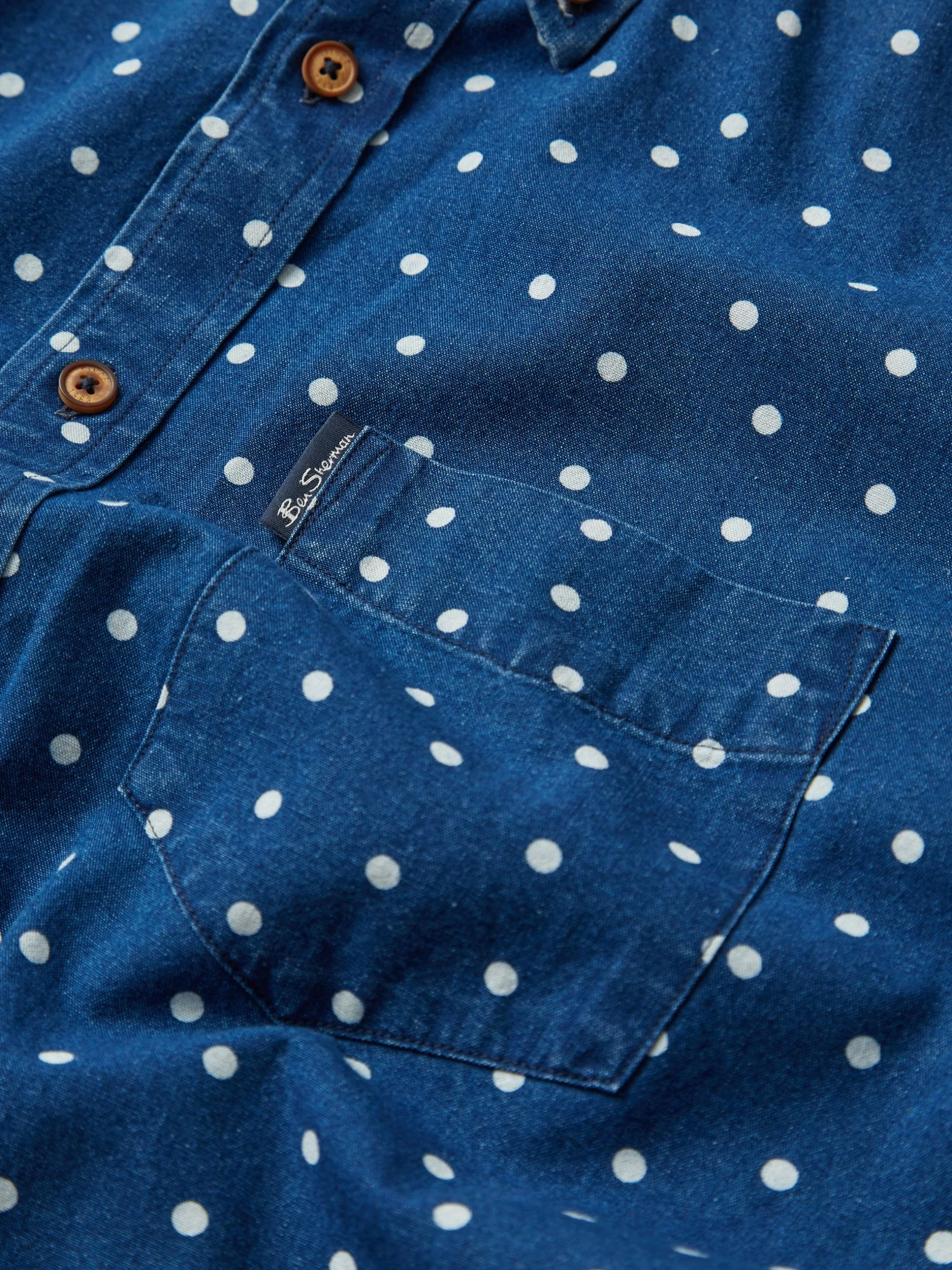 This Ben Sherman indigo spot print long sleeve shirt comes in a regular fit and features a 2 finger button down collar. Made from 100% Cotton.