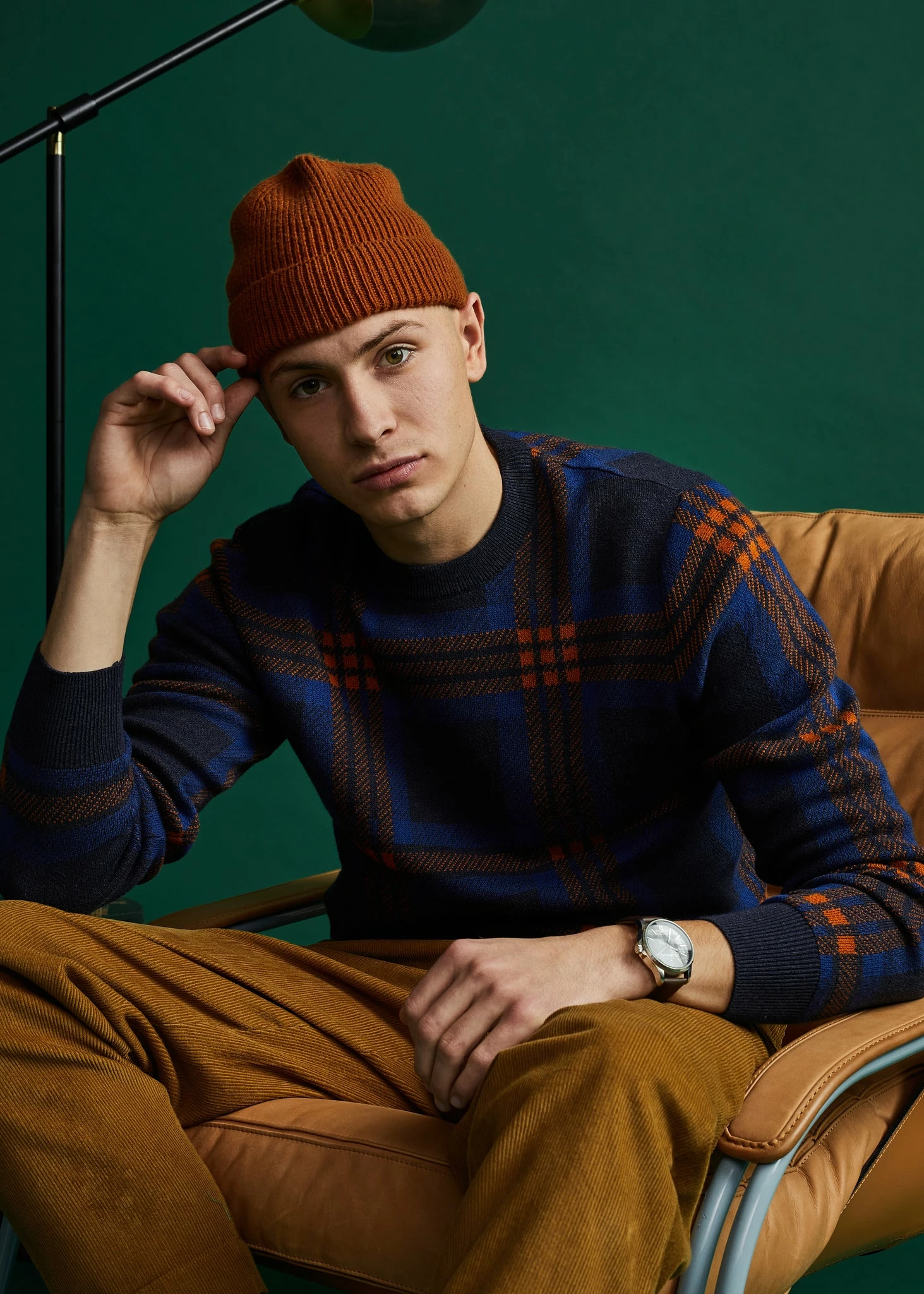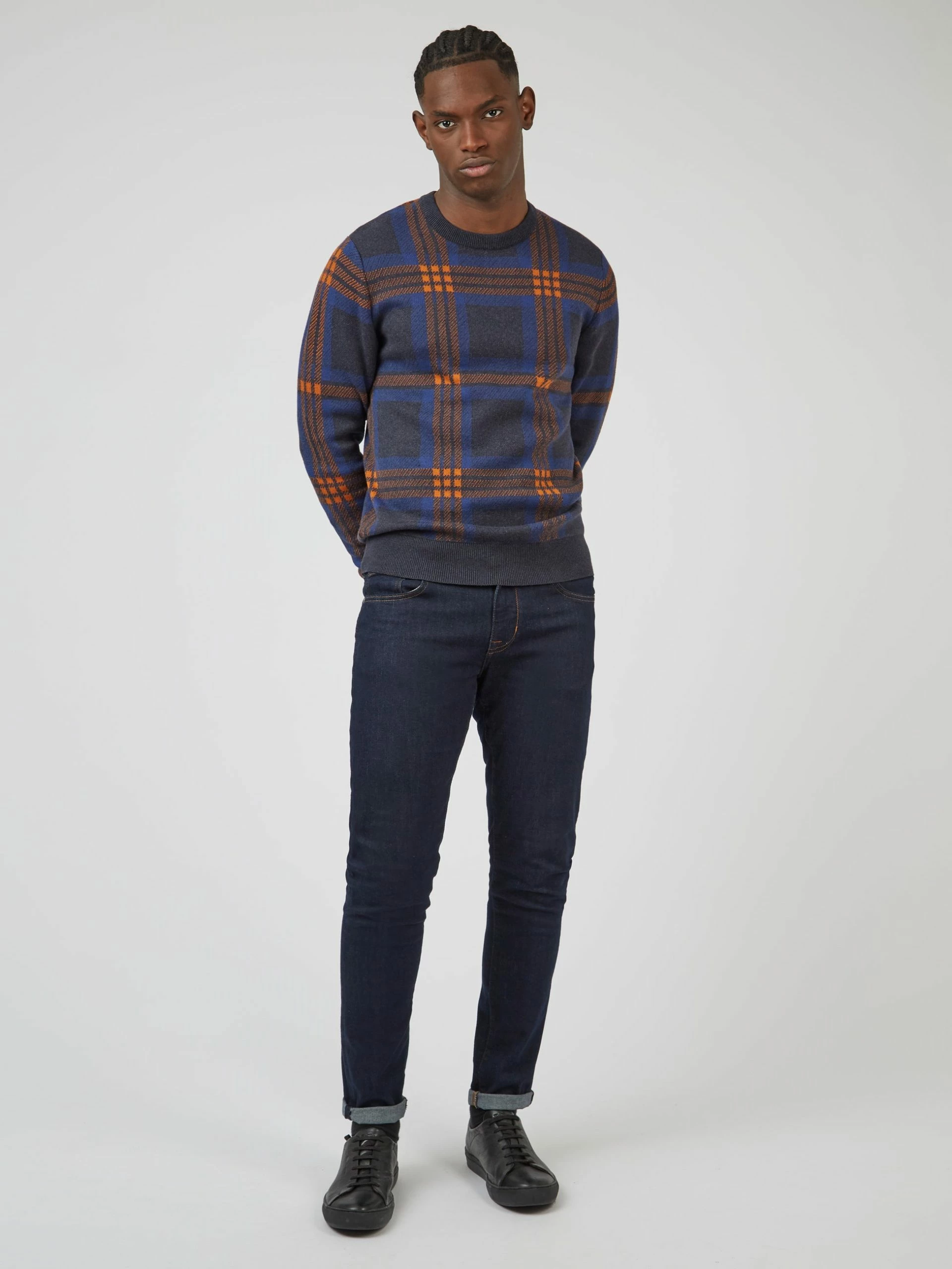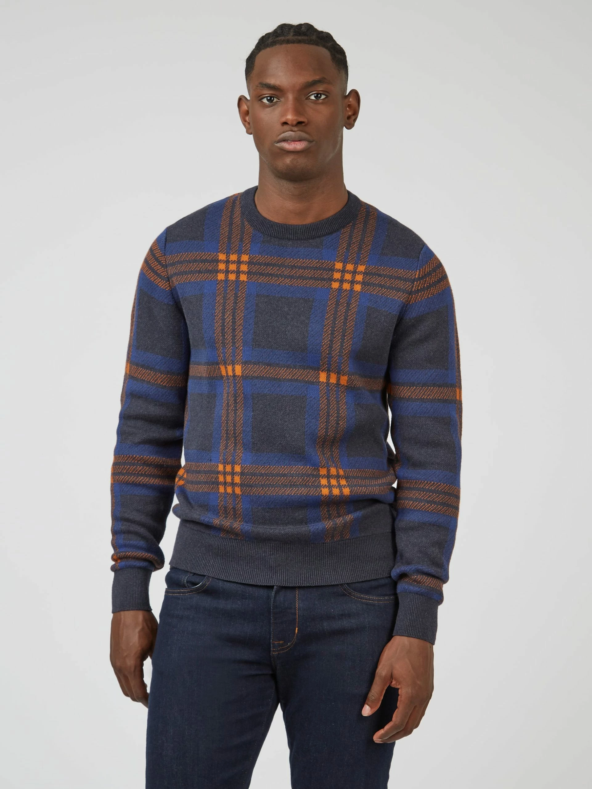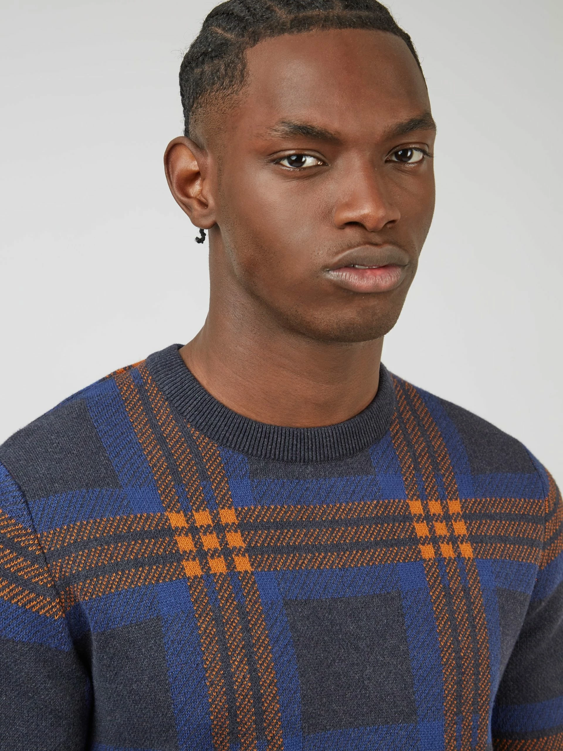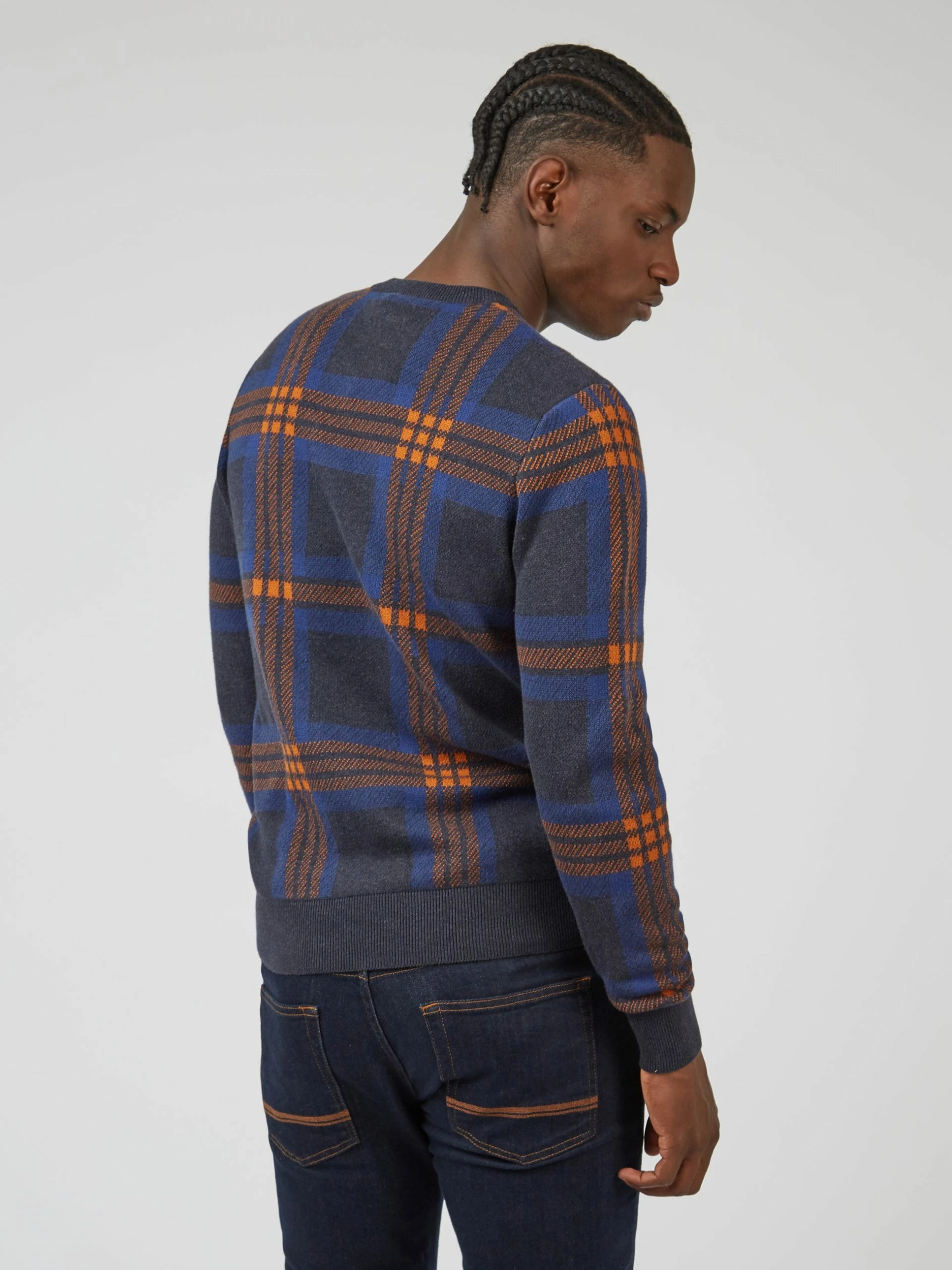 A cotton crew neck jumper designed with an all over jacquard check pattern. In a heavier weight, this jumper is a perfect layering piece for Autumn/Winter. Branded with the Ben Sherman woven side tab label. 100% COTTON.