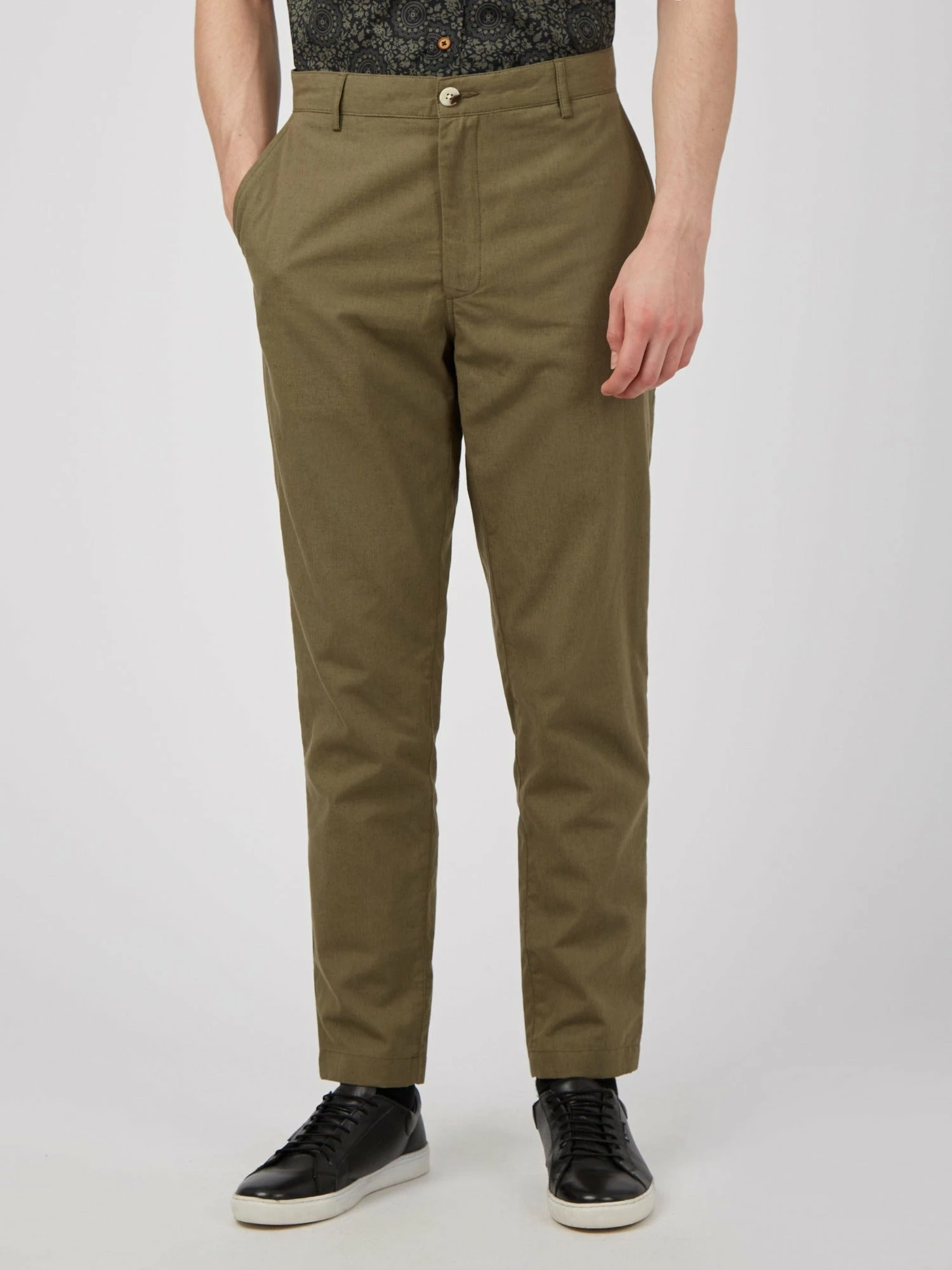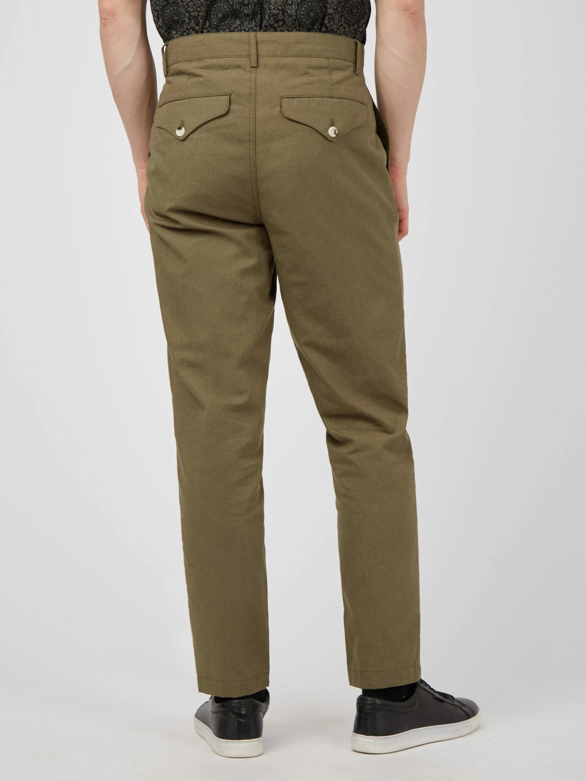 A cotton/linen blend trouser in a slim taper fit. Features include front slanted pockets, button through flap pockets at the back, internal contrast waistband binding and a Ben Sherman branded woven badge at the center back.