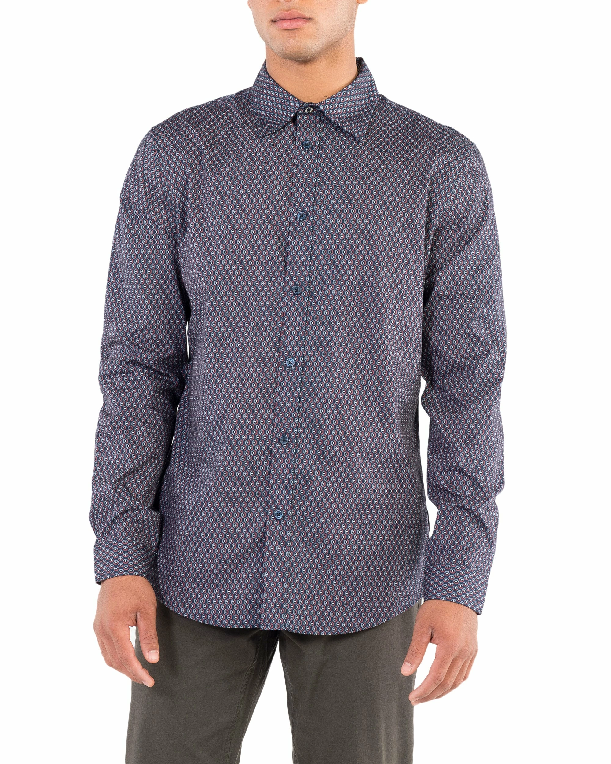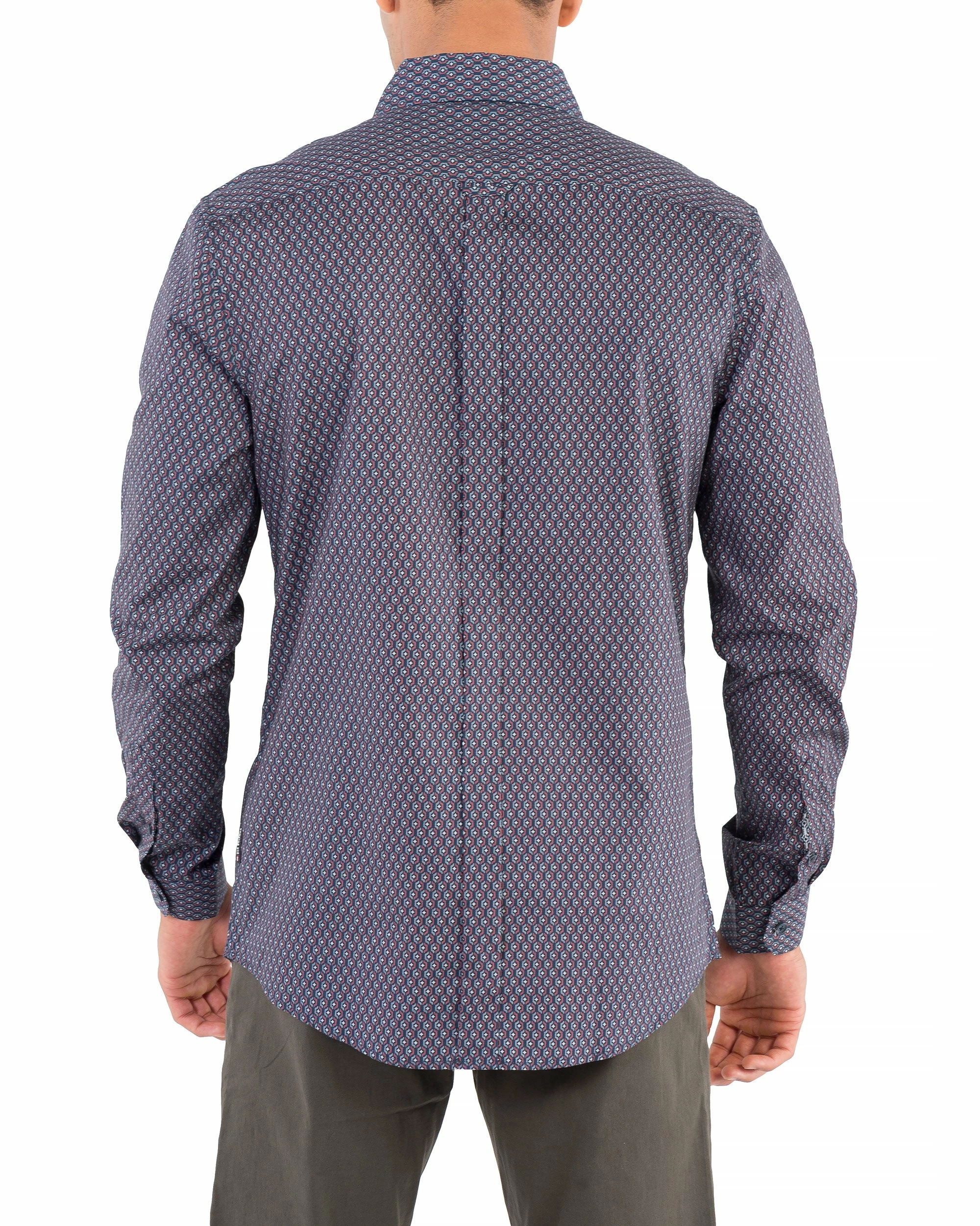 This shirt’s subtle retro geo print is inspired by wallpaper patterns in 1970s northern England. Mod fit.
