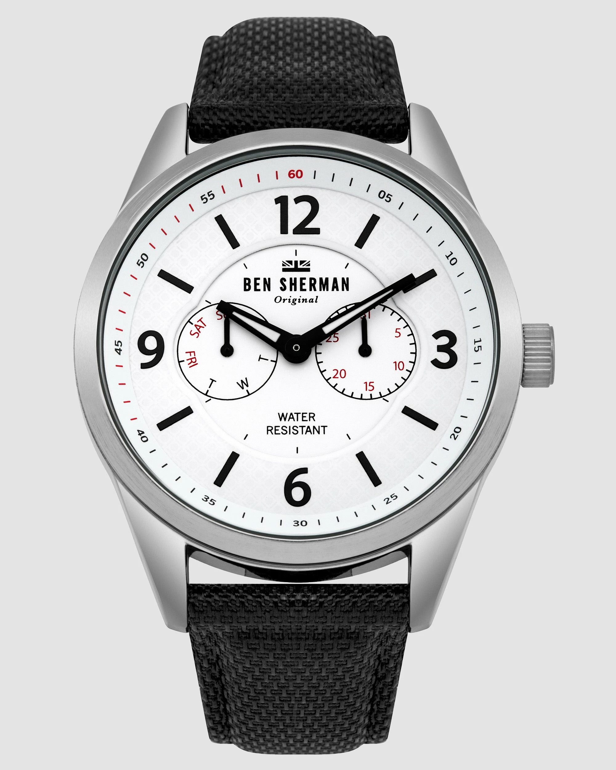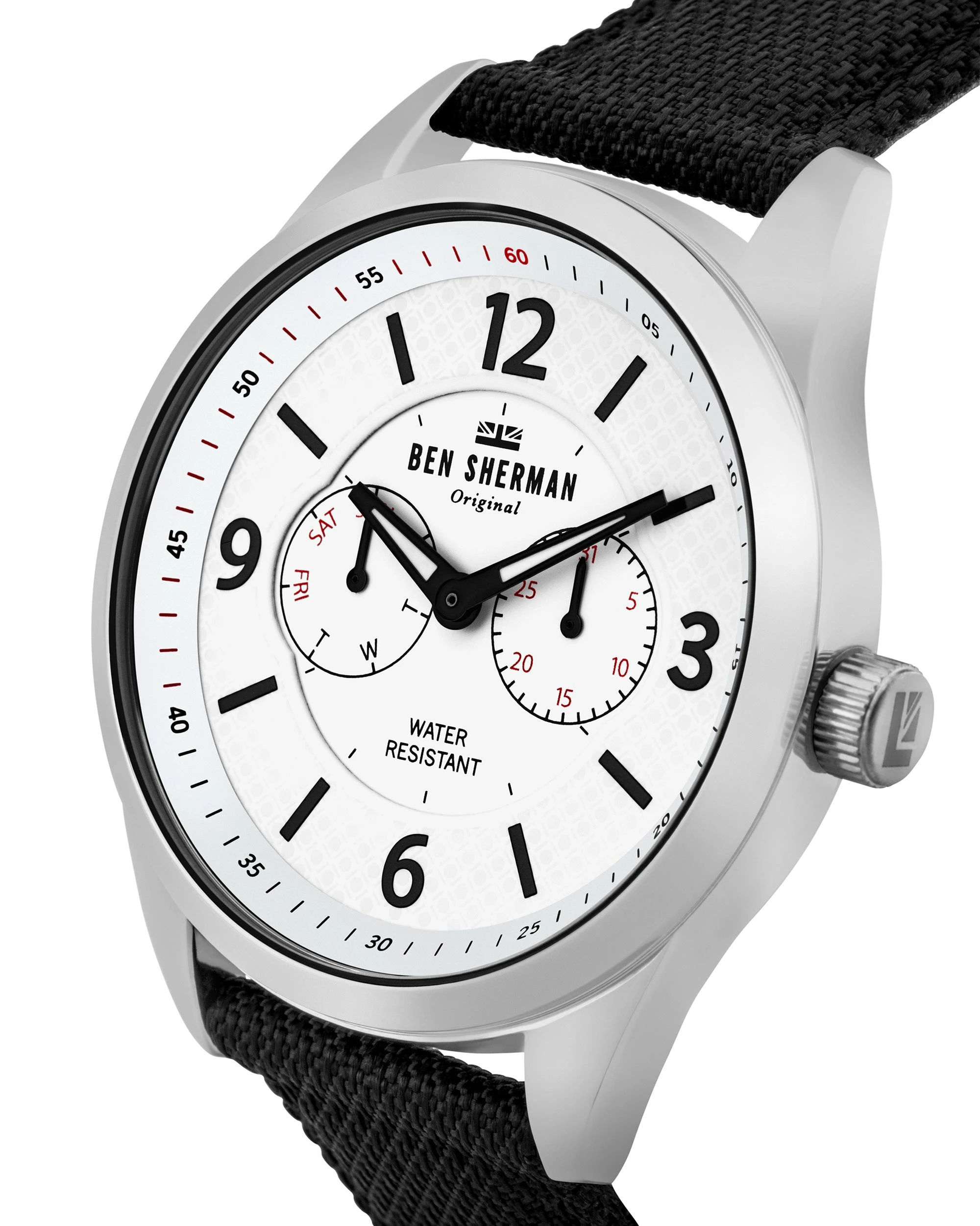 Our Big Carnaby Utility watch is a handsome utility-style men’s watch with a white dial and brushed-silver case. A black nylon strap adds durable function to this fashionable watch.