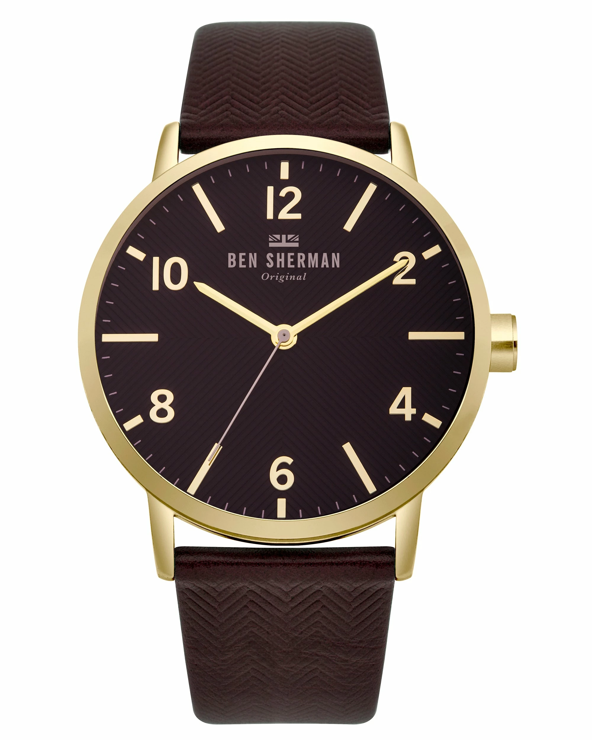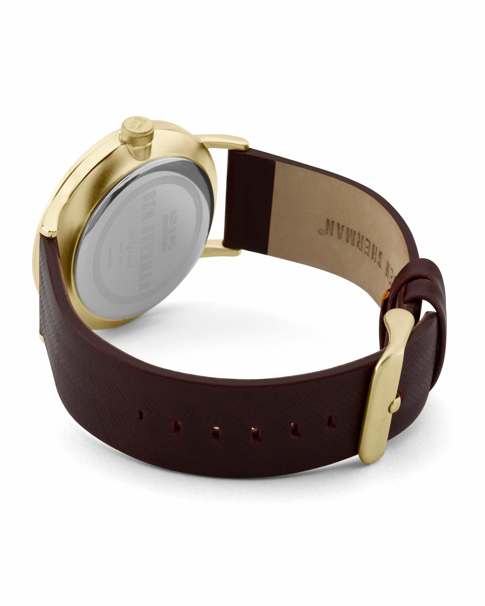 Our Big Portobello Herringbone watch is a sleek and stylish men’s watch with mulberry-hued dial and rose gold case. The burgundy-toned dial is complemented by a herringbone patterned leather strap.
