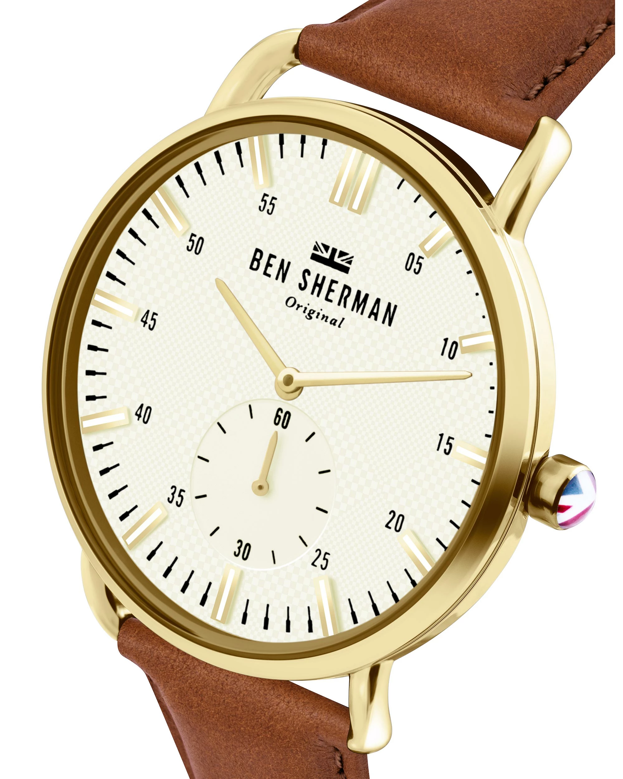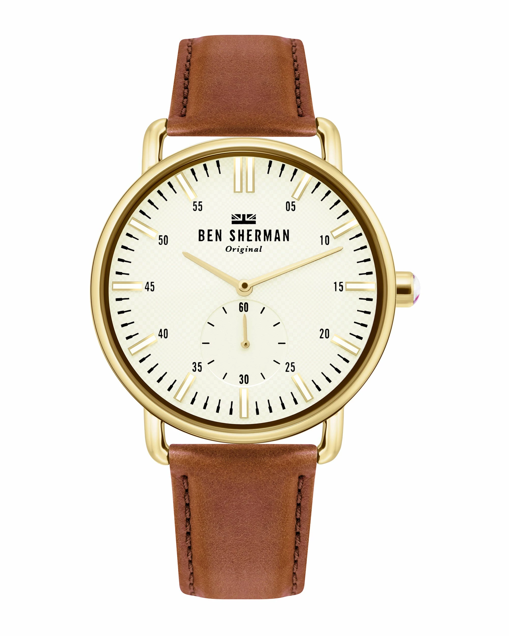 Our Brighton City men’s watch is a stylish timepiece with a white dial and gold case. The brown leather strap completes the look.