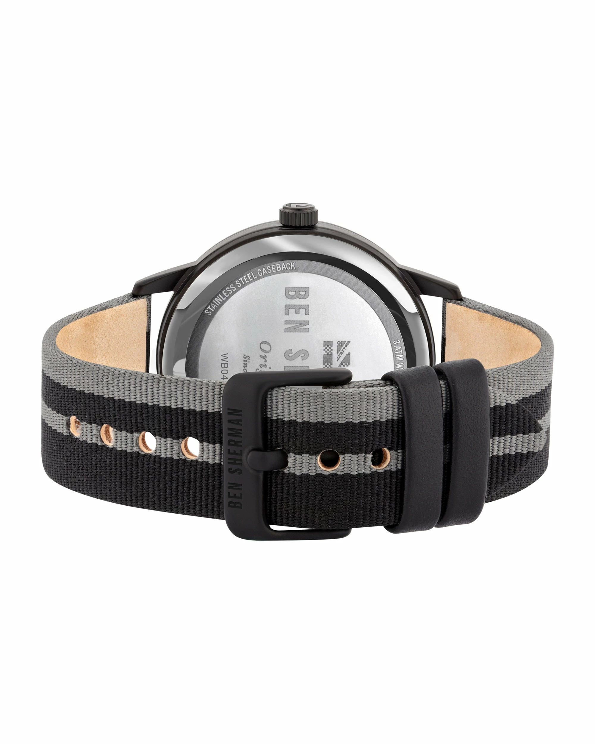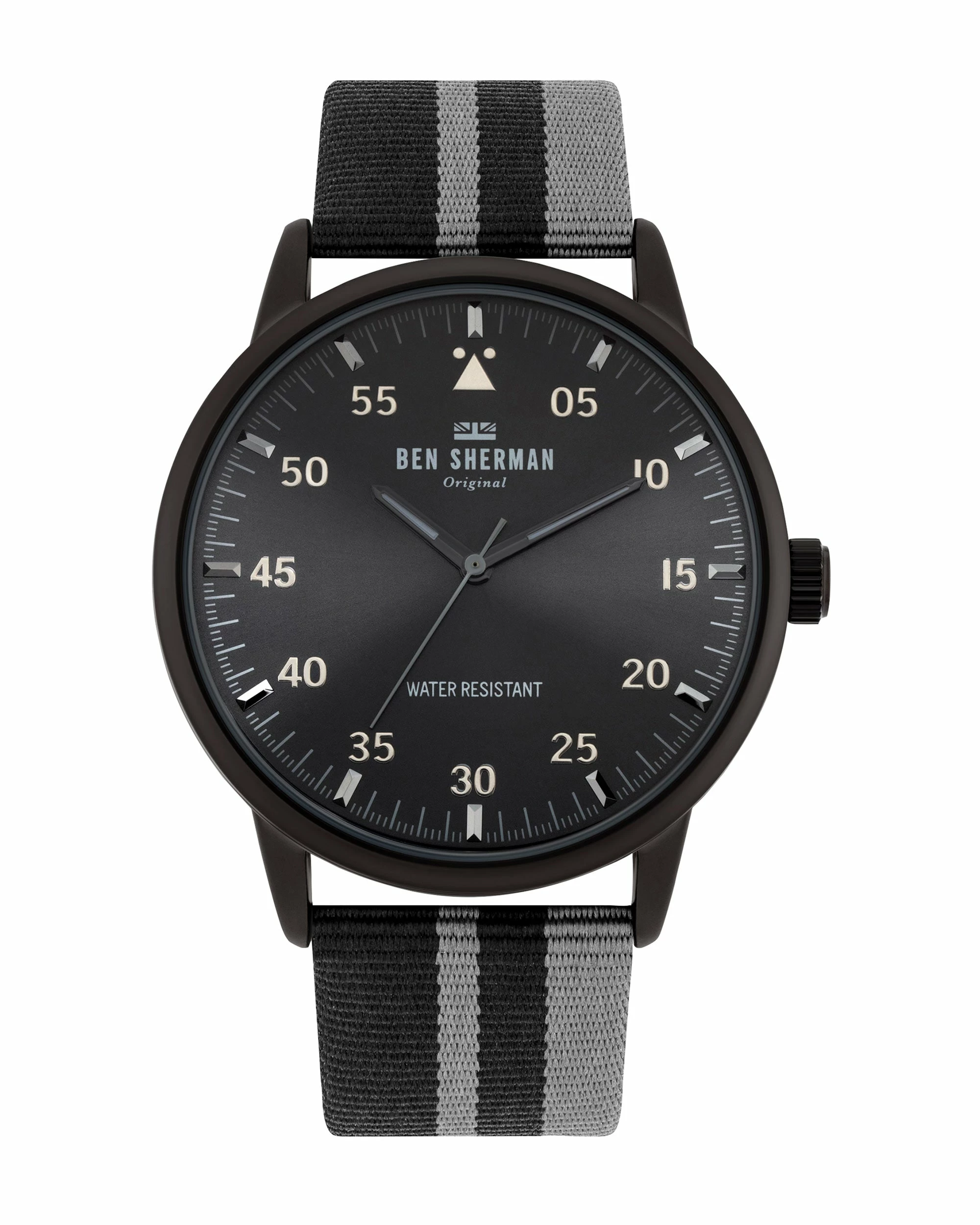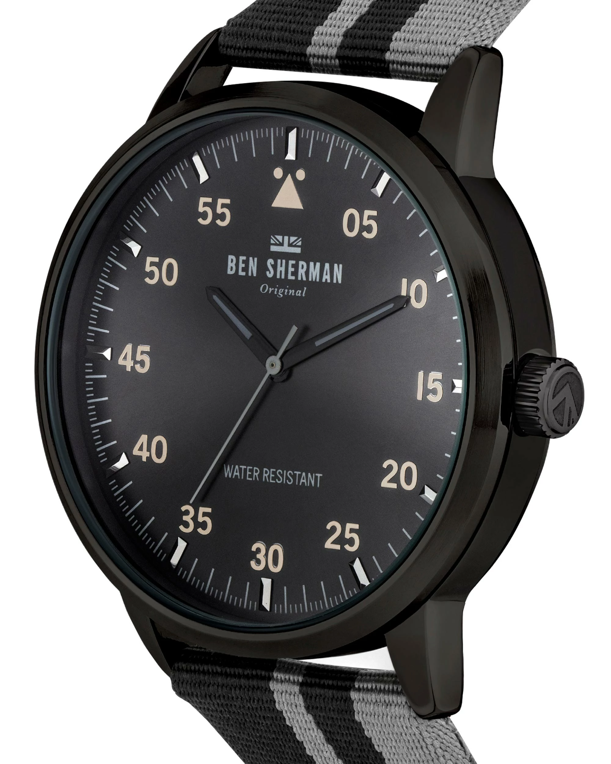 Our Daltrey Sport Watch is a stylish men’s watch with a black sunray dial and black case that are complemented by a black-and-grey striped nylon strap.