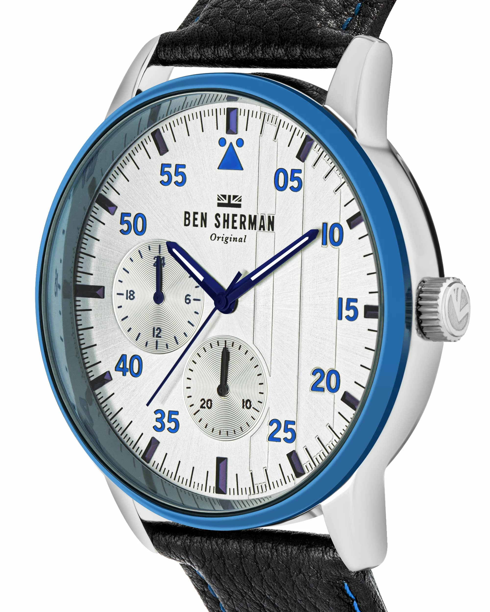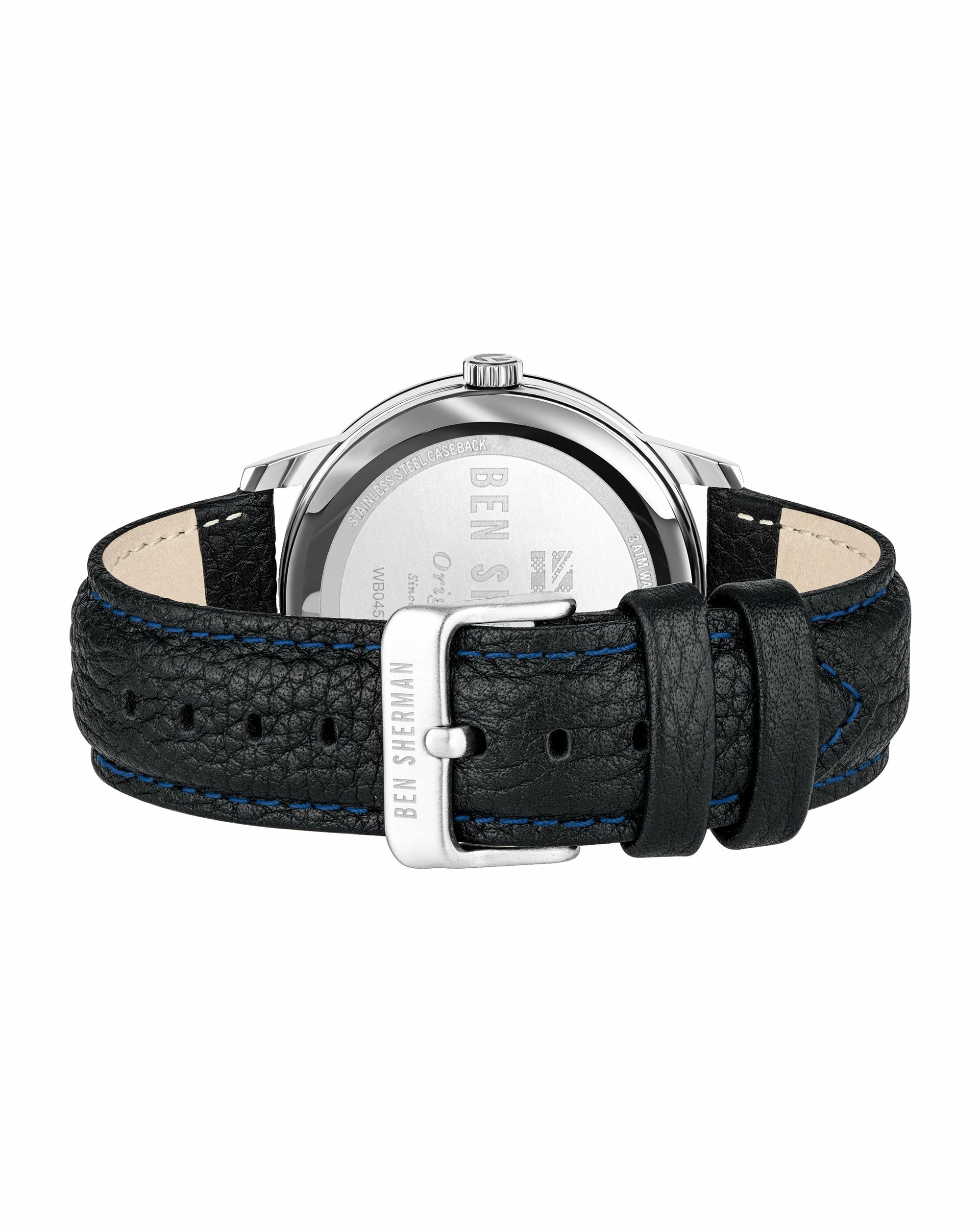Our Daltry Sport watch is a stylish men’s timepiece with a silver dial, silver case, and a black leather strap.