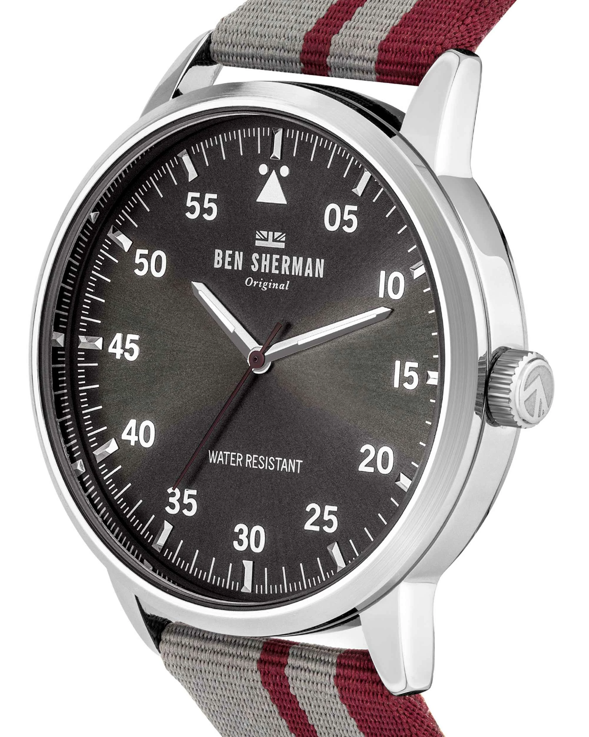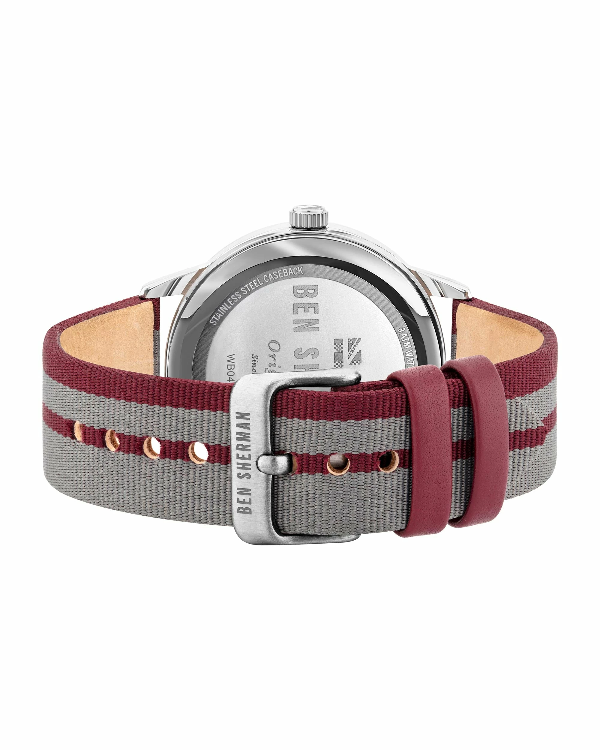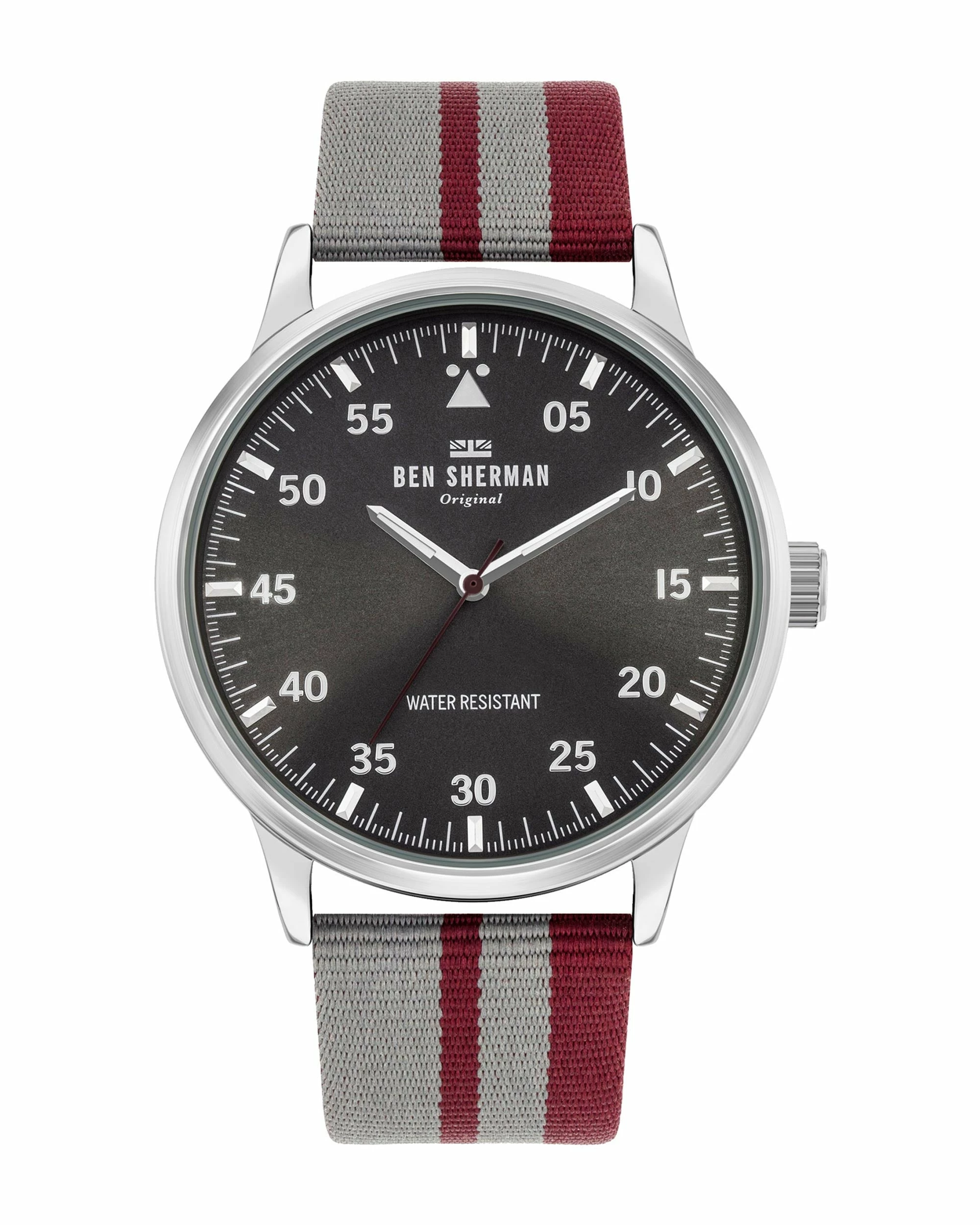 Our Daltrey Sport Watch is a stylish men’s watch with a cool-grey sunray dial and silver case. The combination is complemented by a grey-and-burgundy striped nylon strap.