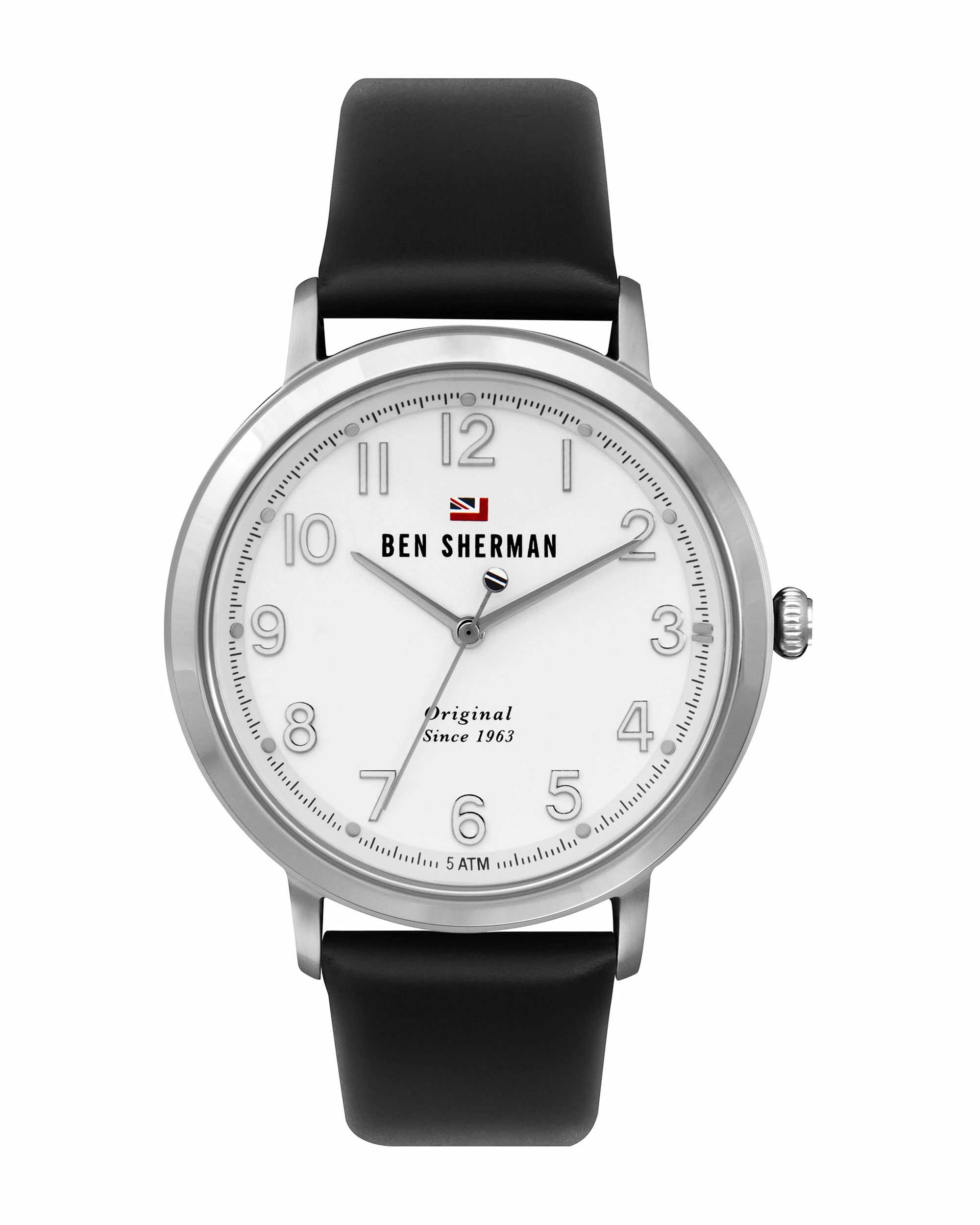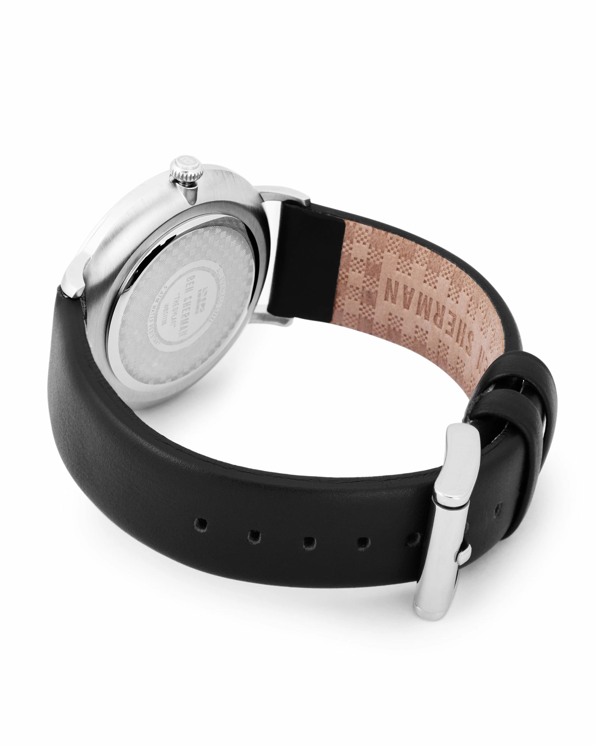 The Dylan Casual watch is a stylish everyday timepiece. The handsome men’s watch has a matte-white dial, silver case, and a black leather strap.