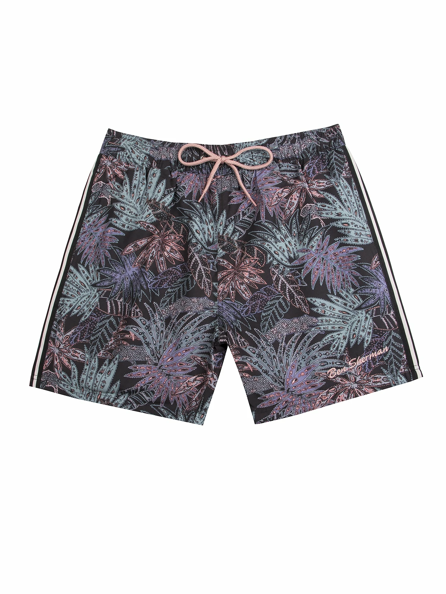 Make a stylish statement this summer in our printed La Concha swim shorts. A blend of California cool and Brit-inspired polish, these classic trunks pop in a black, blue and soft-coral tropical print. Our La Concha shorts feature an elasticated waist and drawstring, traditional mesh lining, versatile pockets, and the iconic Ben Sherman branding.