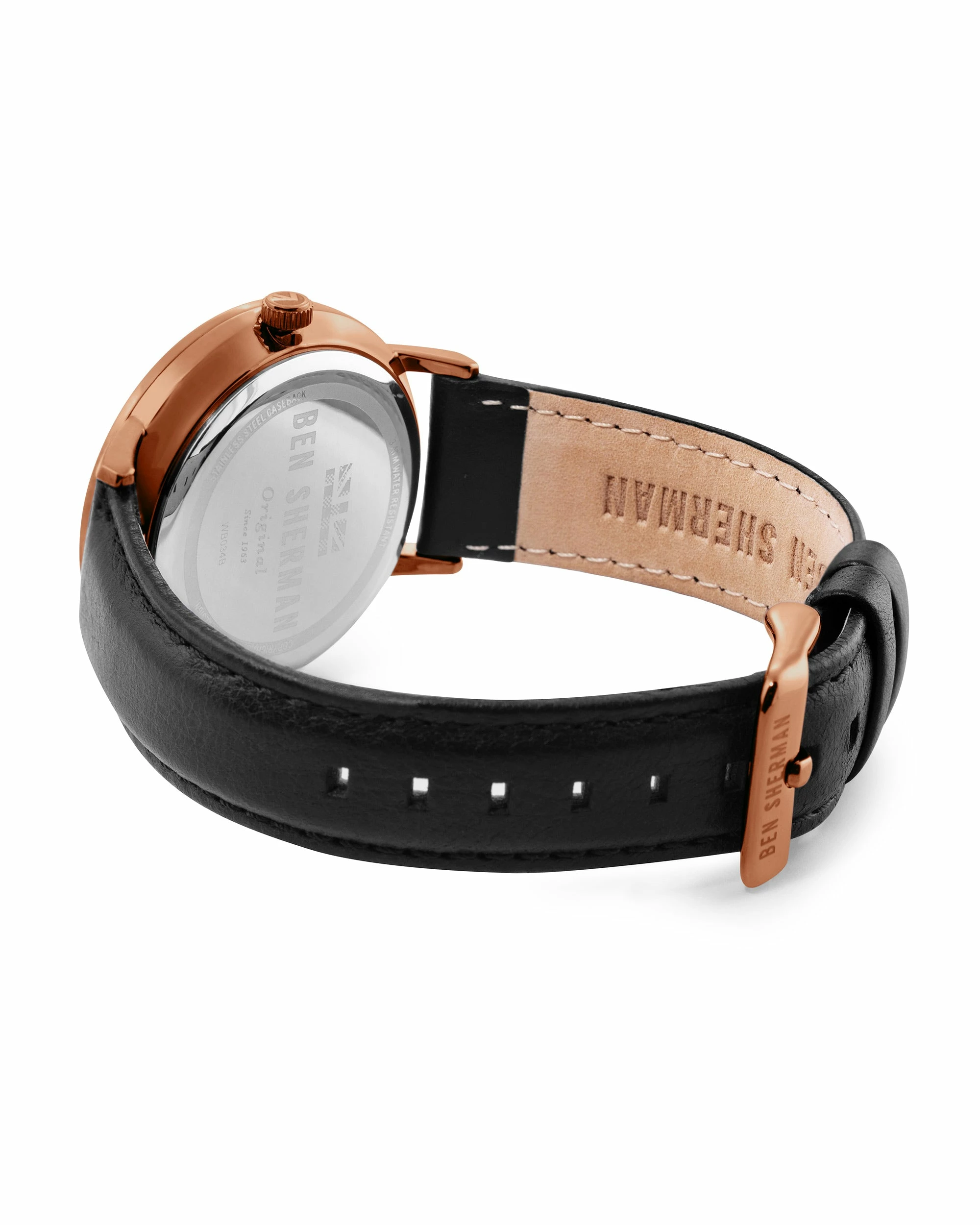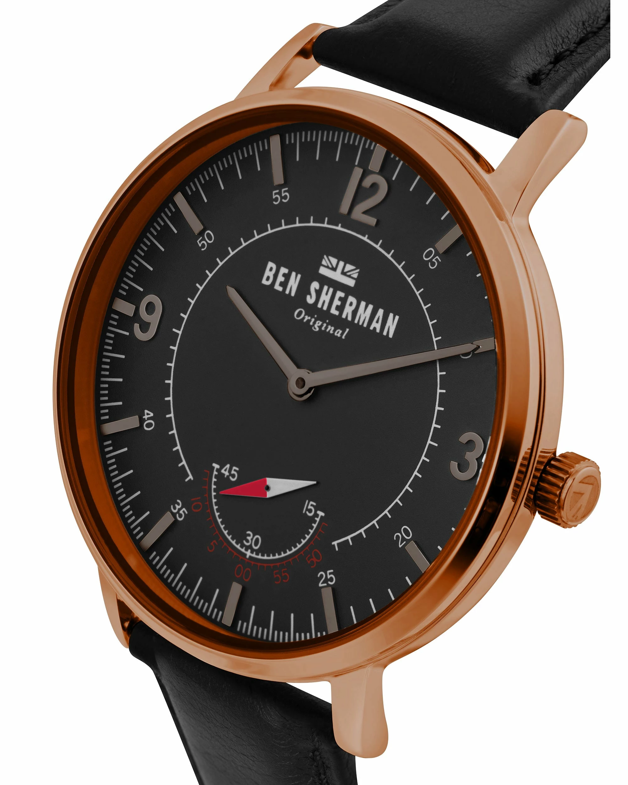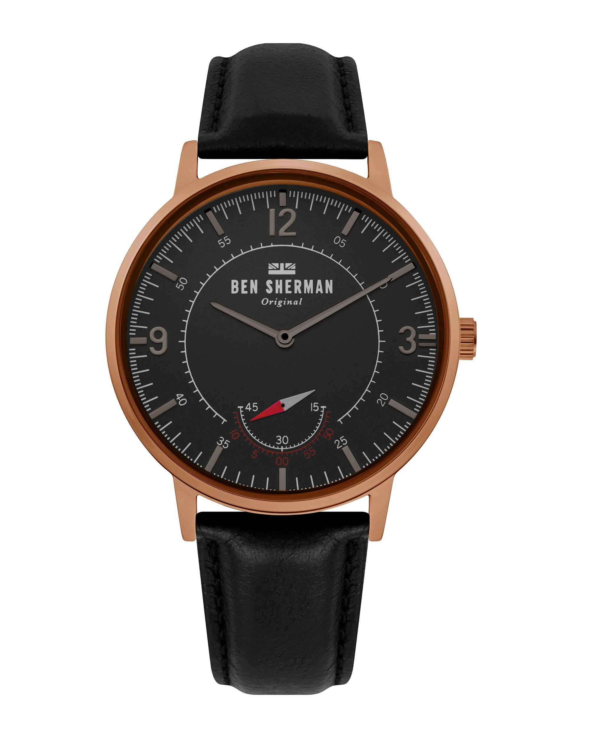 Our Portobello Heritage men’s watch is a stylish timepiece with a black dial and brown case. The black leather strap completes the look.