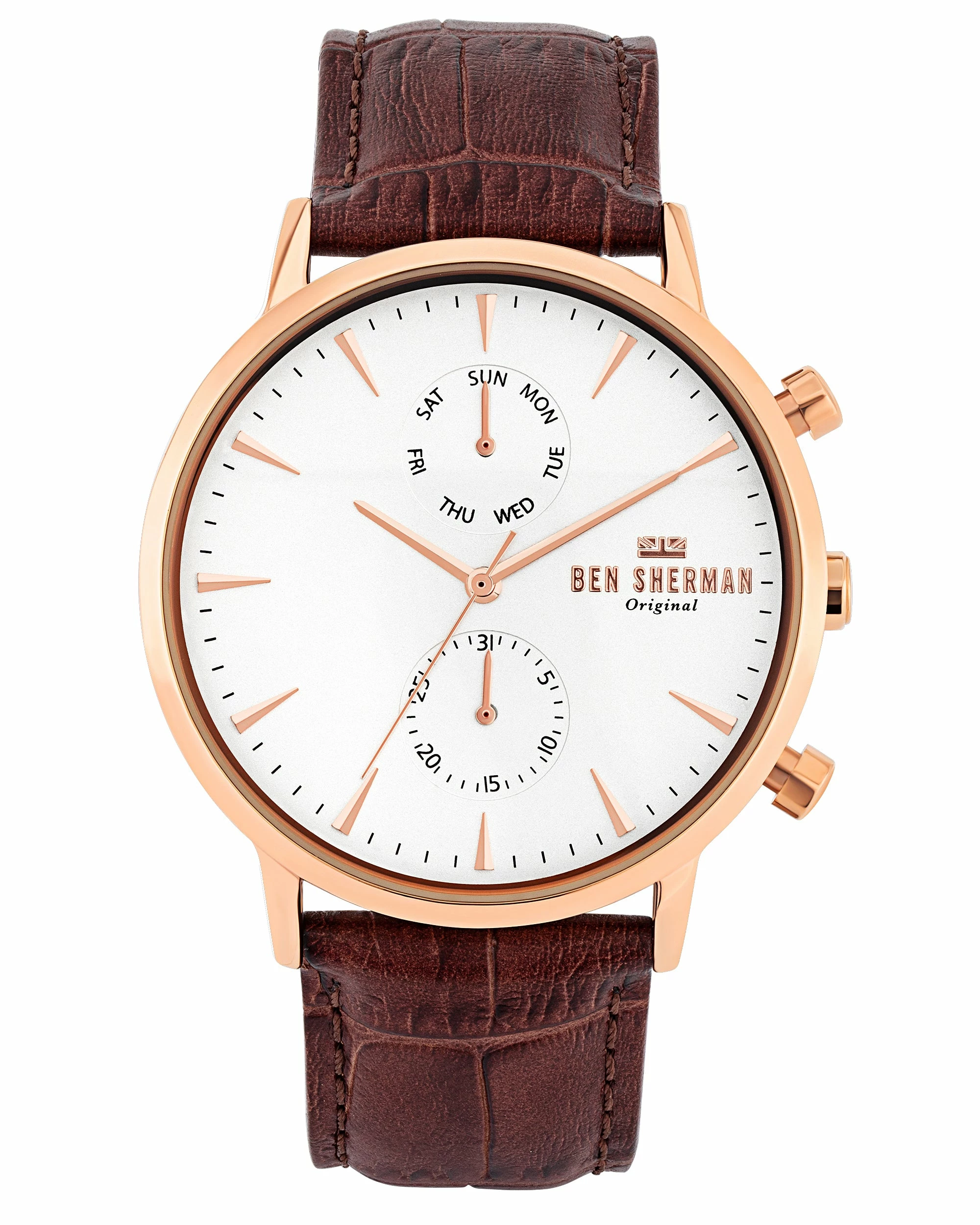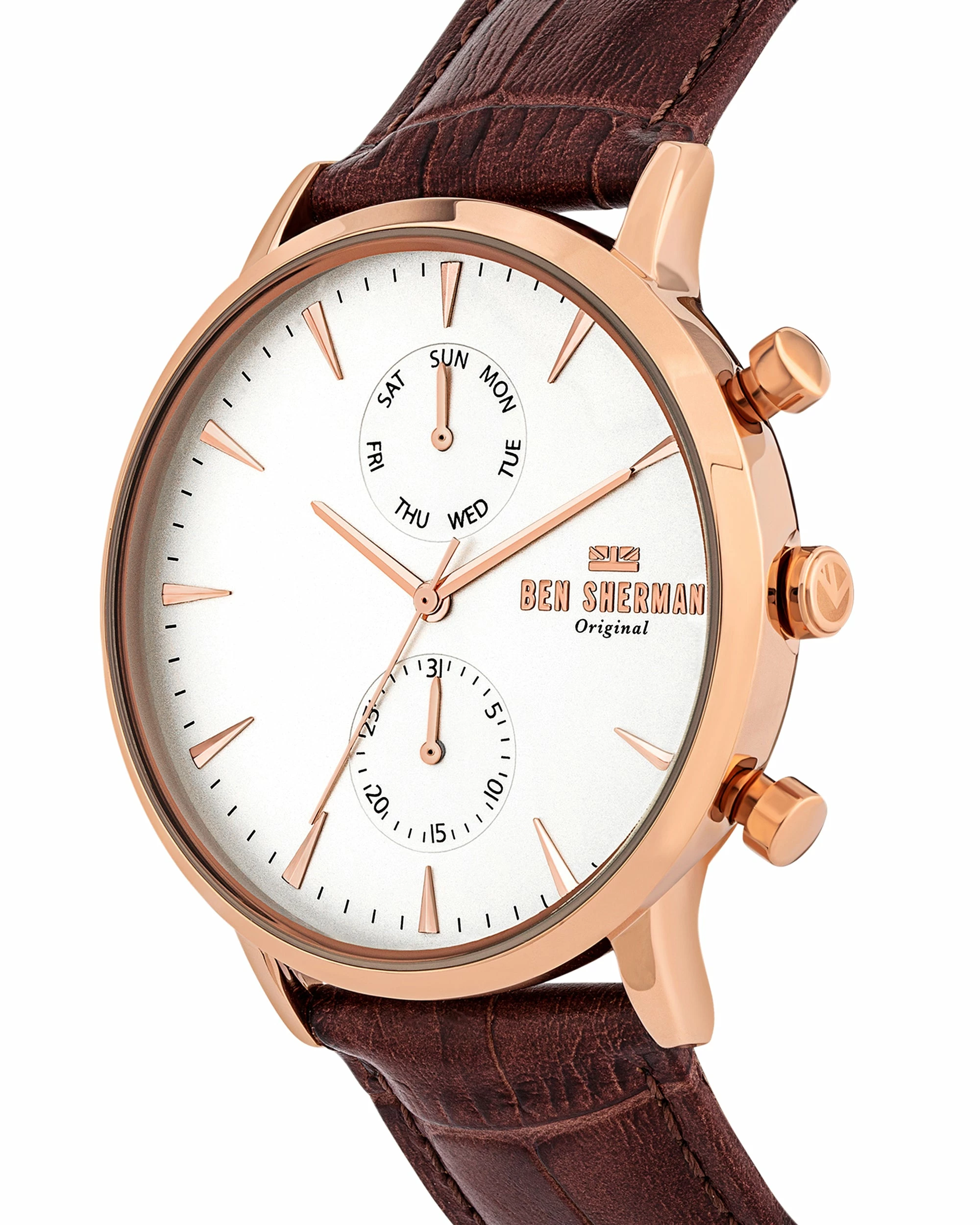 Our Portobello Professional watch is a handsome men’s watch with a stylish satin off-white dial and dark-brown croc-printed leather strap. A rose-gold case adds stylish contrast.