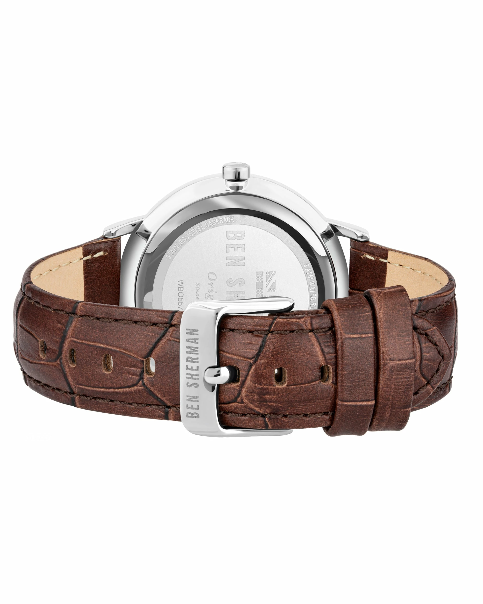 Our Portobello Professional watch is a handsome men’s timepiece with a white dial and silver case. The dark-brown croc-printed leather strap completes the look.