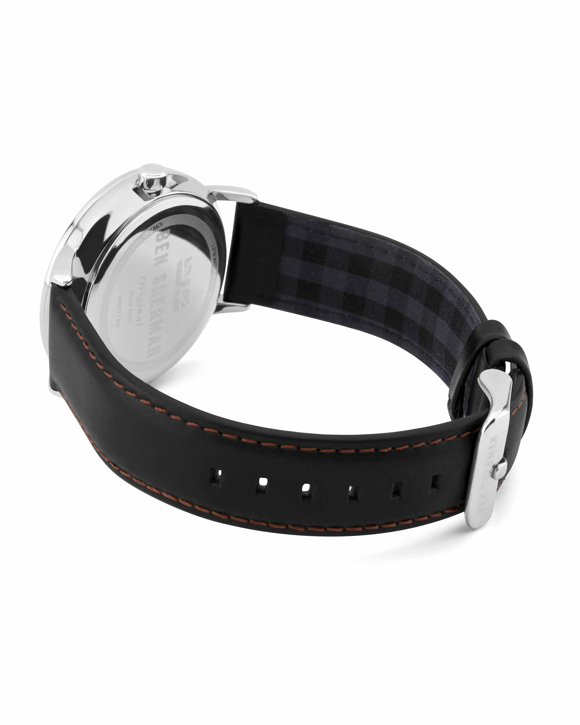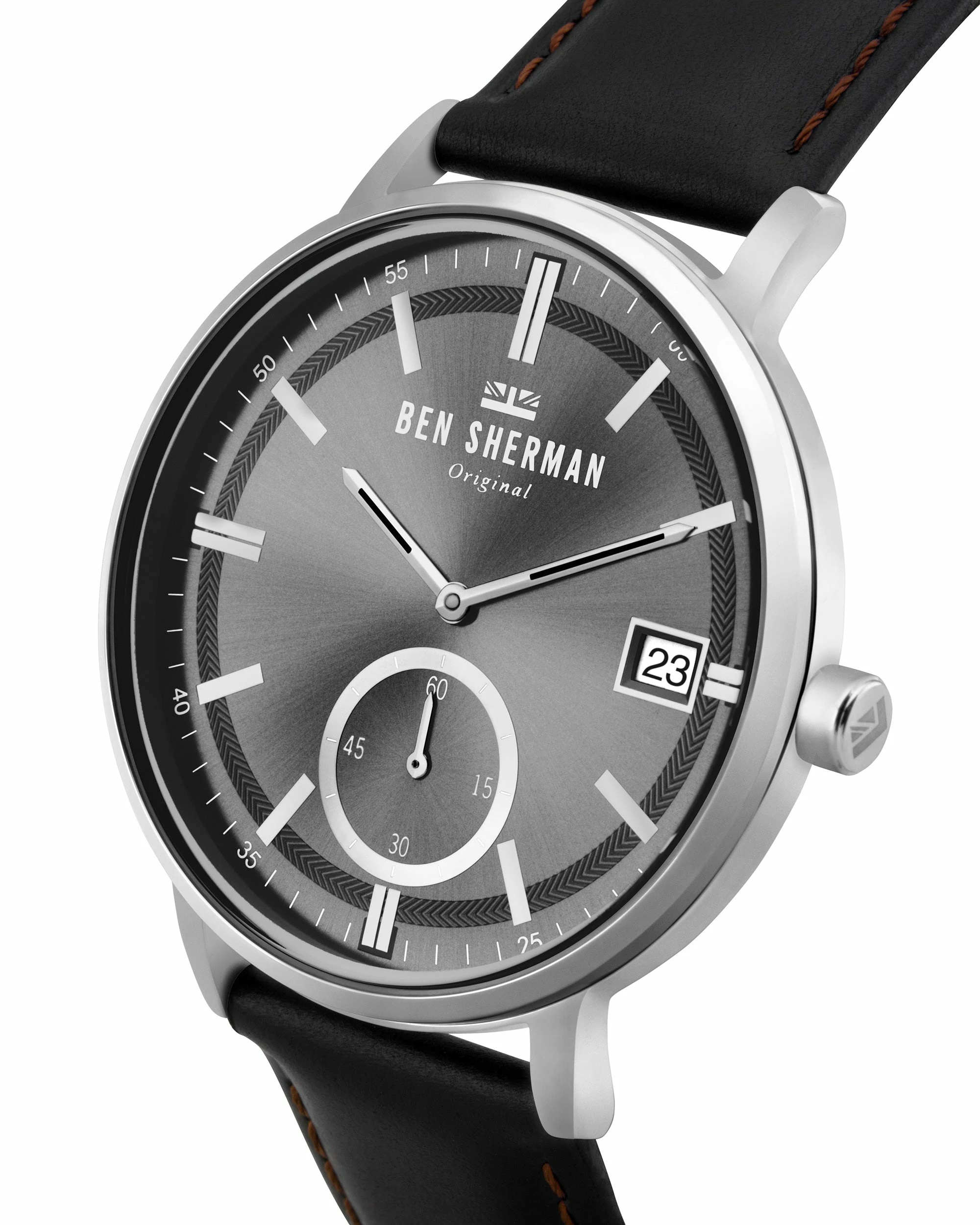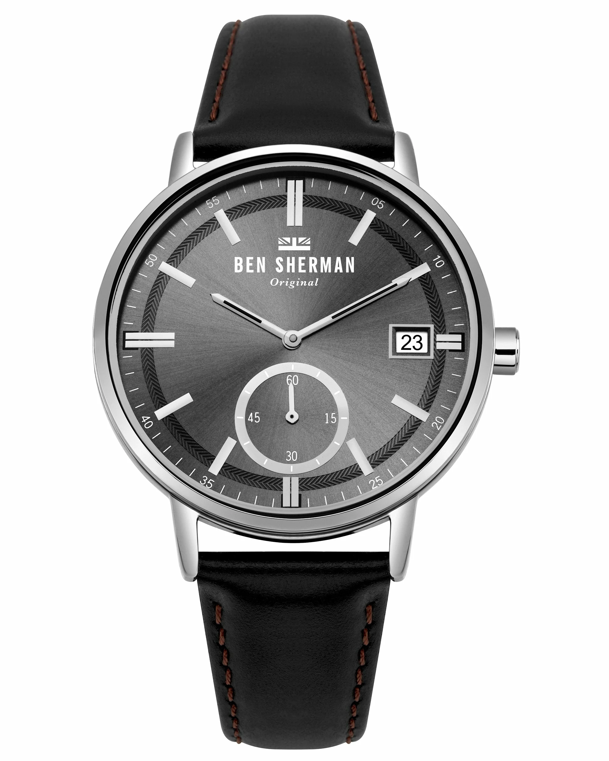 Our Portobello Professional watch is a handsome men’s watch with a black sunray dial and black leather strap. A polished silver case adds stylish contrast.