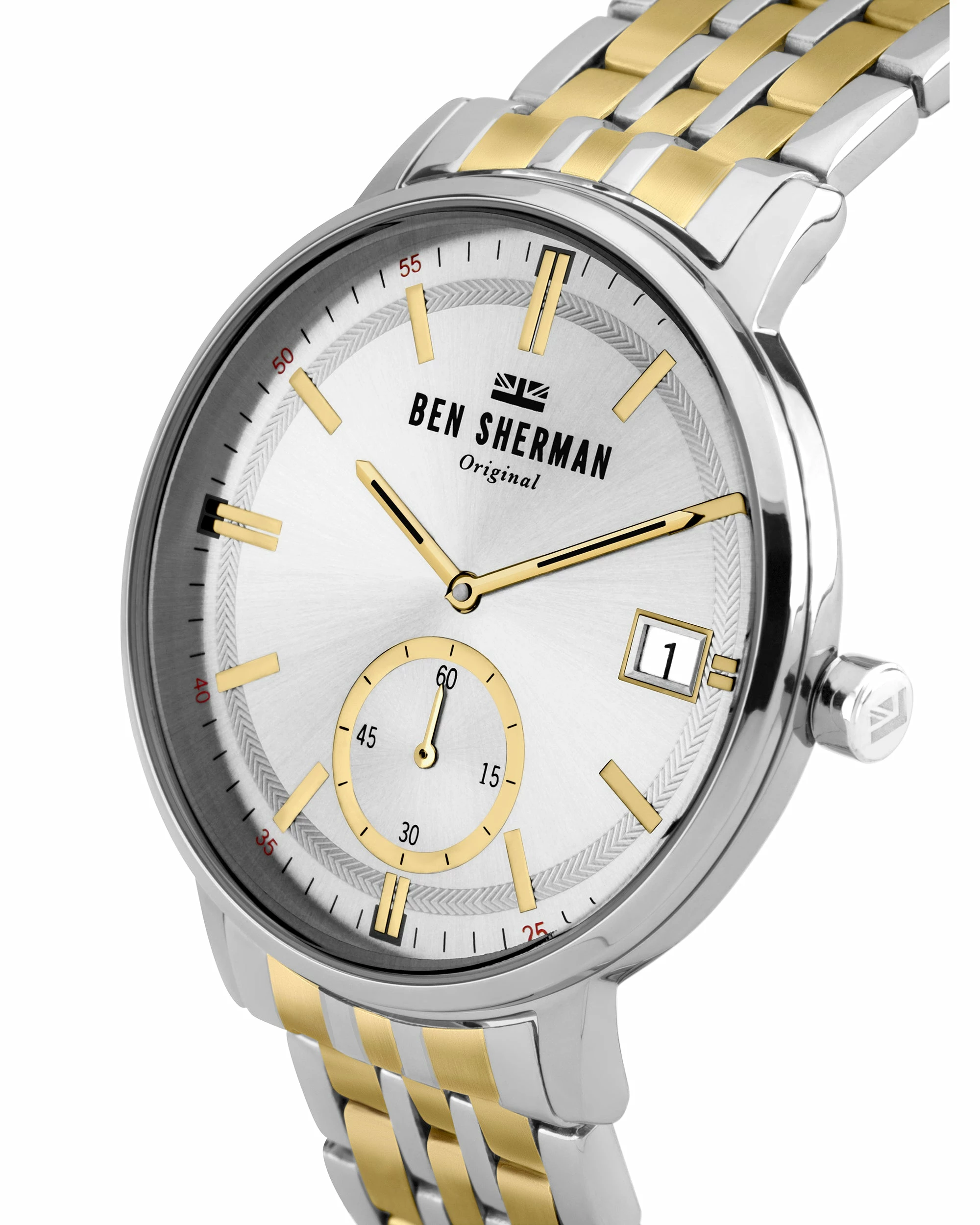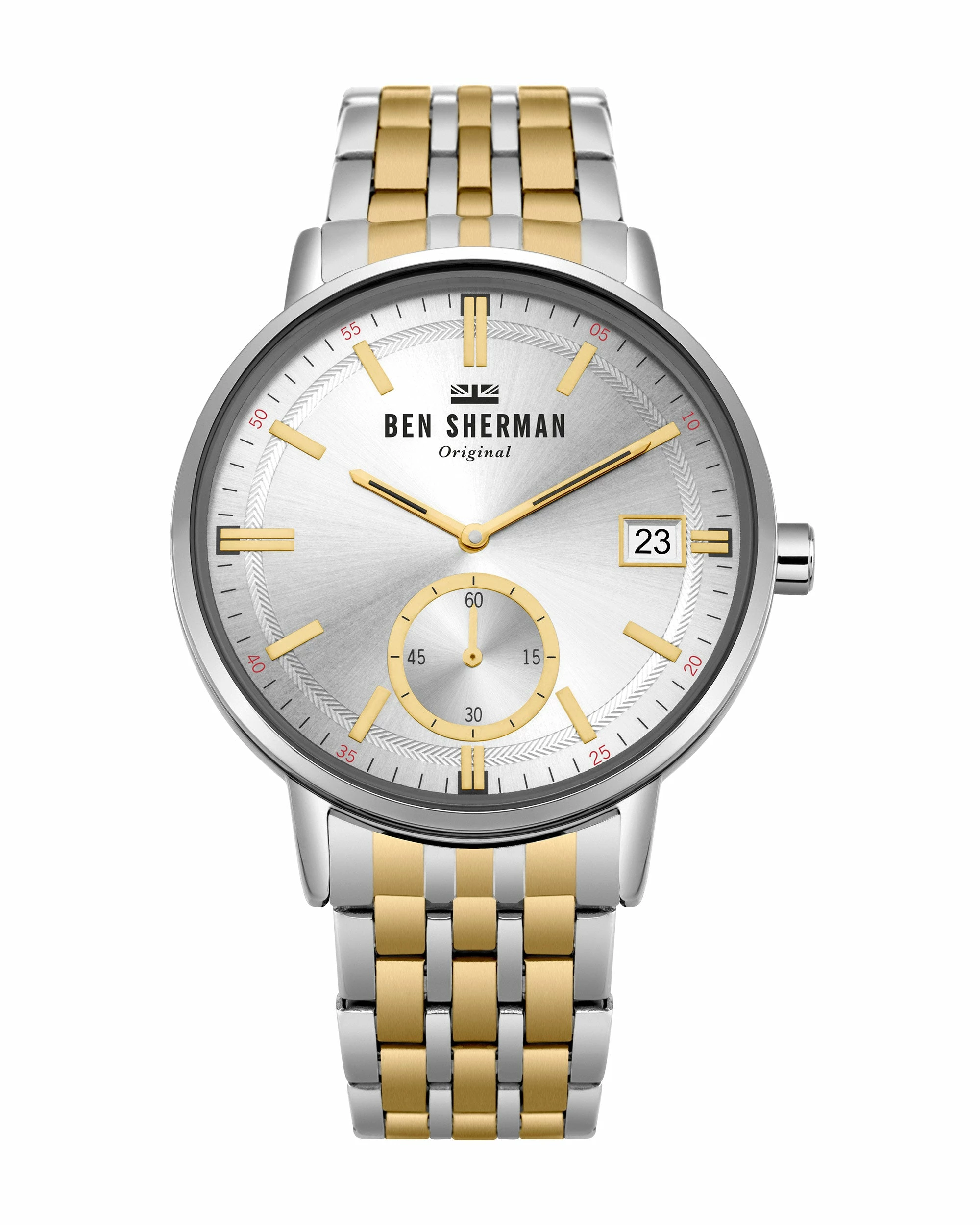 Our Portobello Professional watch is a handsome men’s timepiece with a silver sunray dial and silver case. The classic silver-and-gold stainless strap completes the look.
