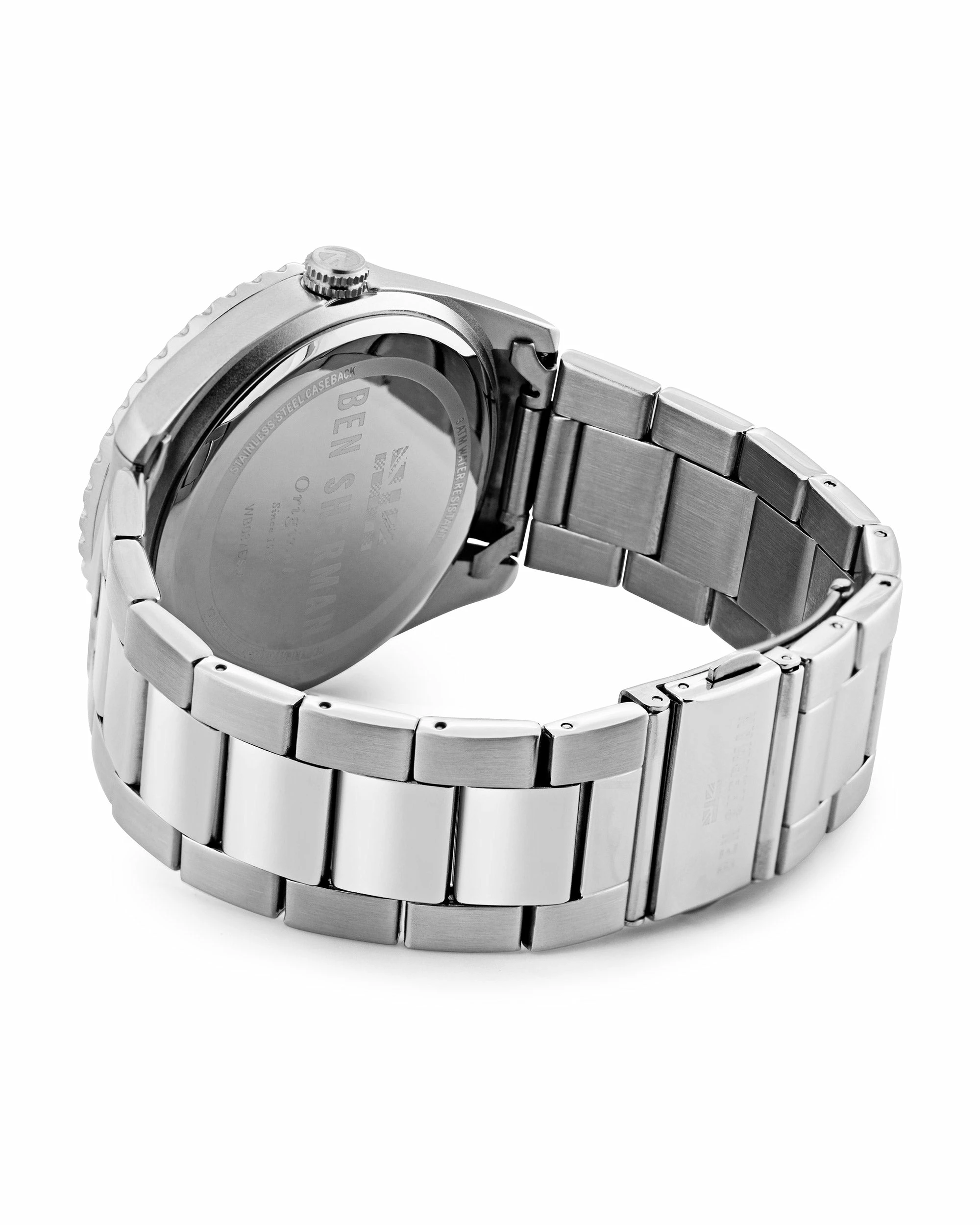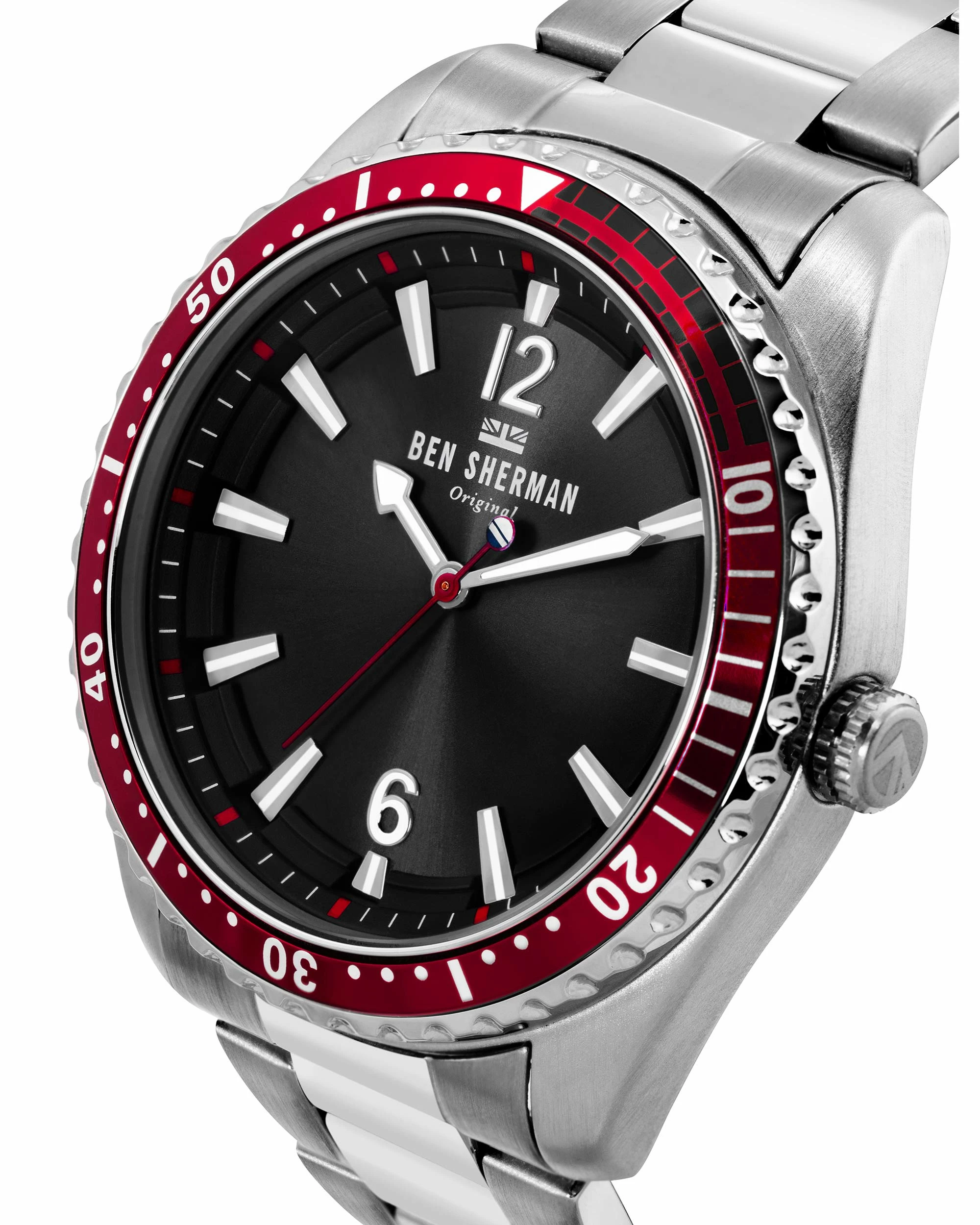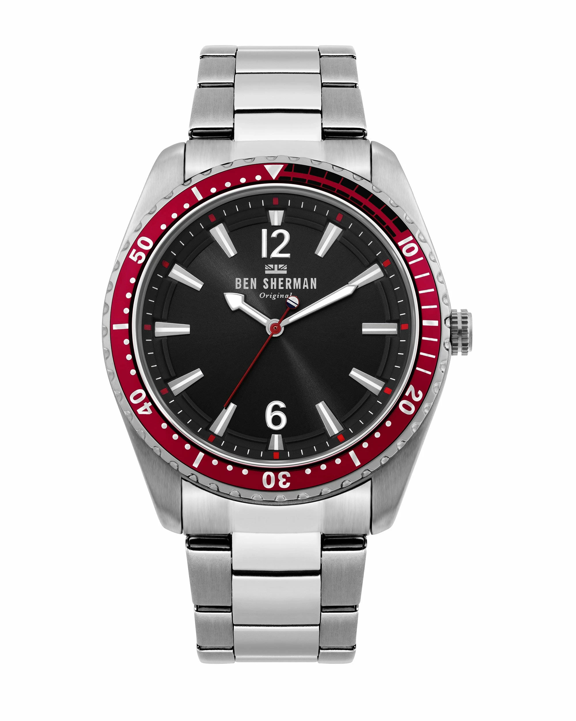 Our Ronnie Diver watch is a handsome men’s timepiece that stands out with its increased water resistance. The watch has a black sunray dial and silver case with red accent. Both are complemented by a silver stainless-steel bracelet strap.