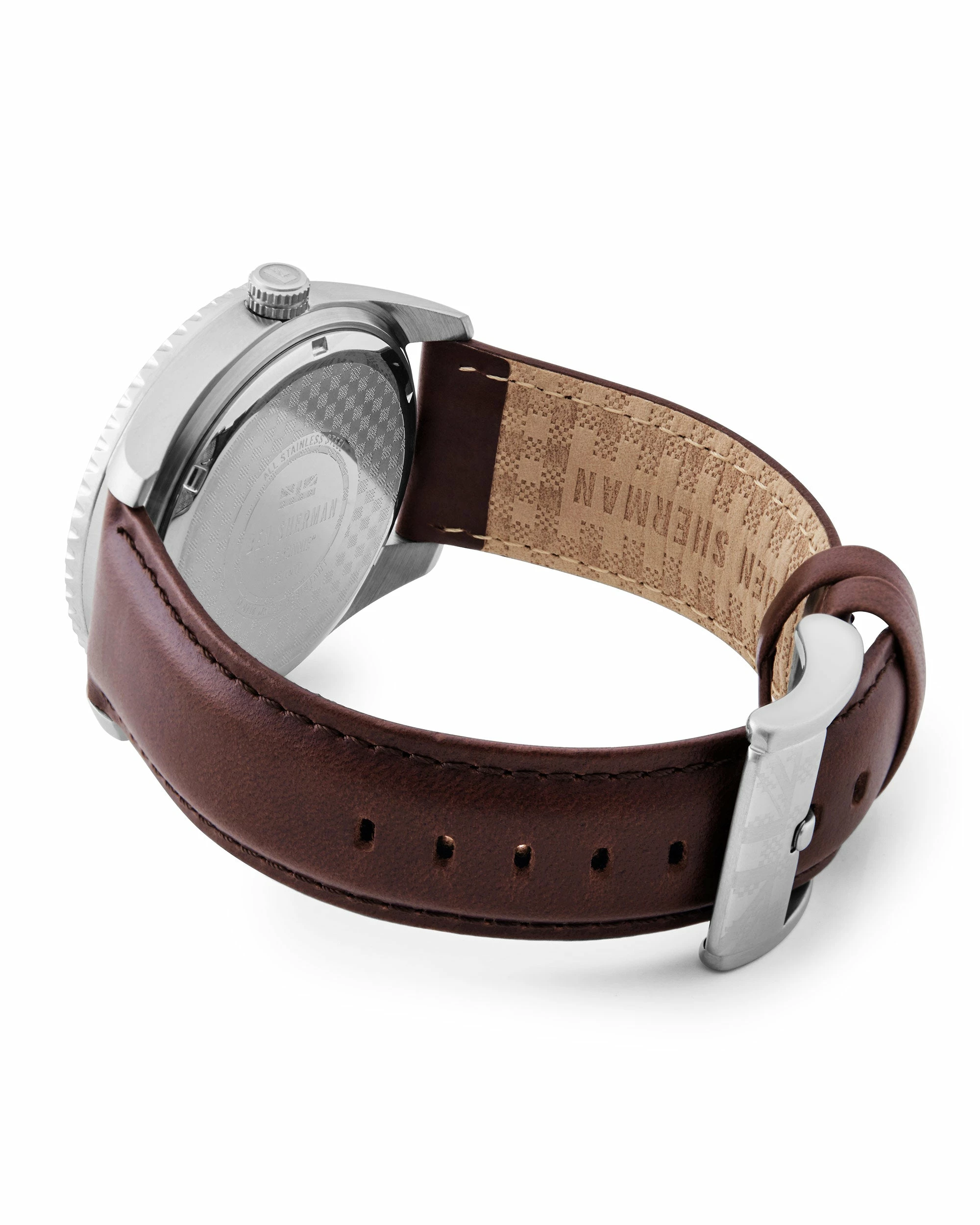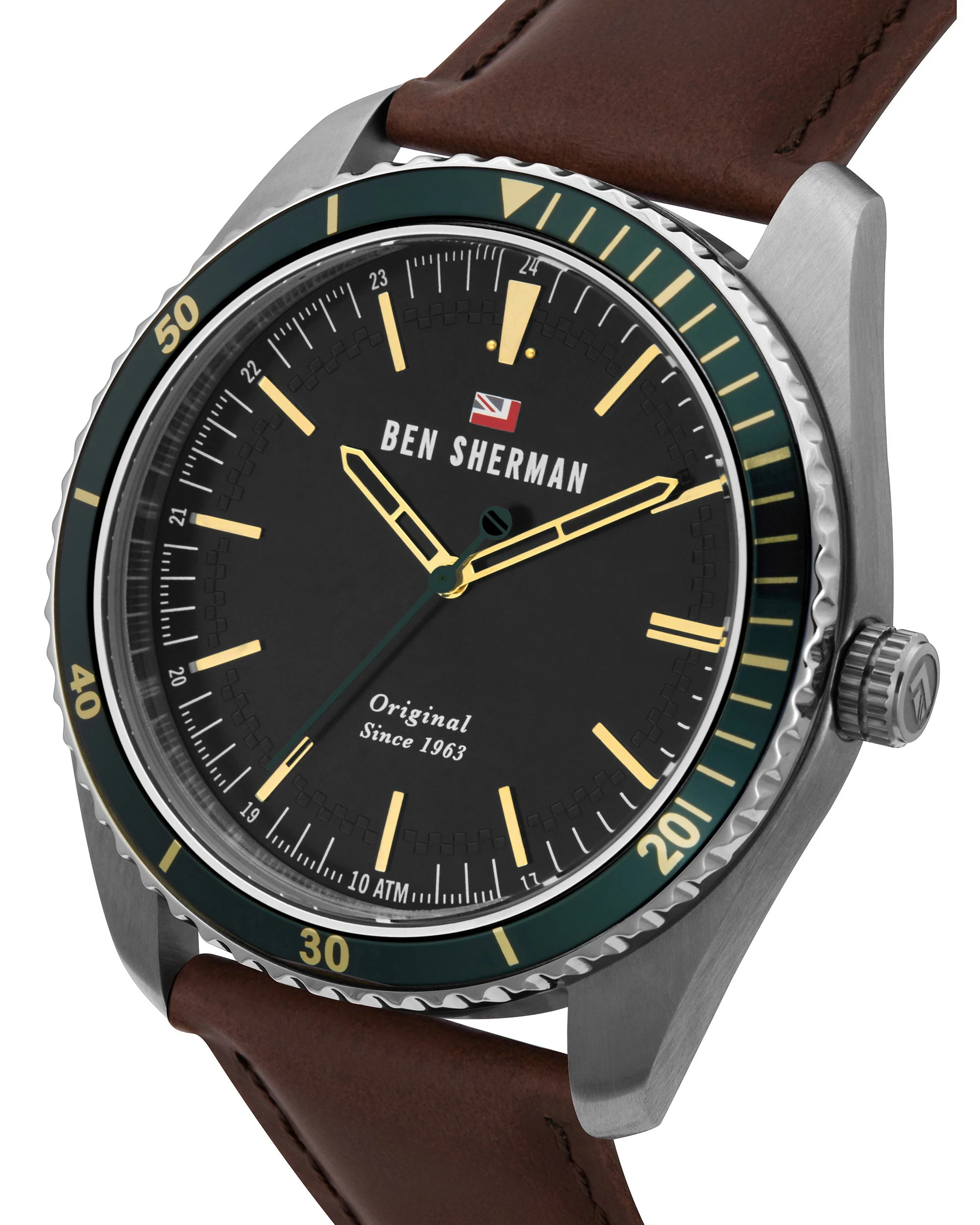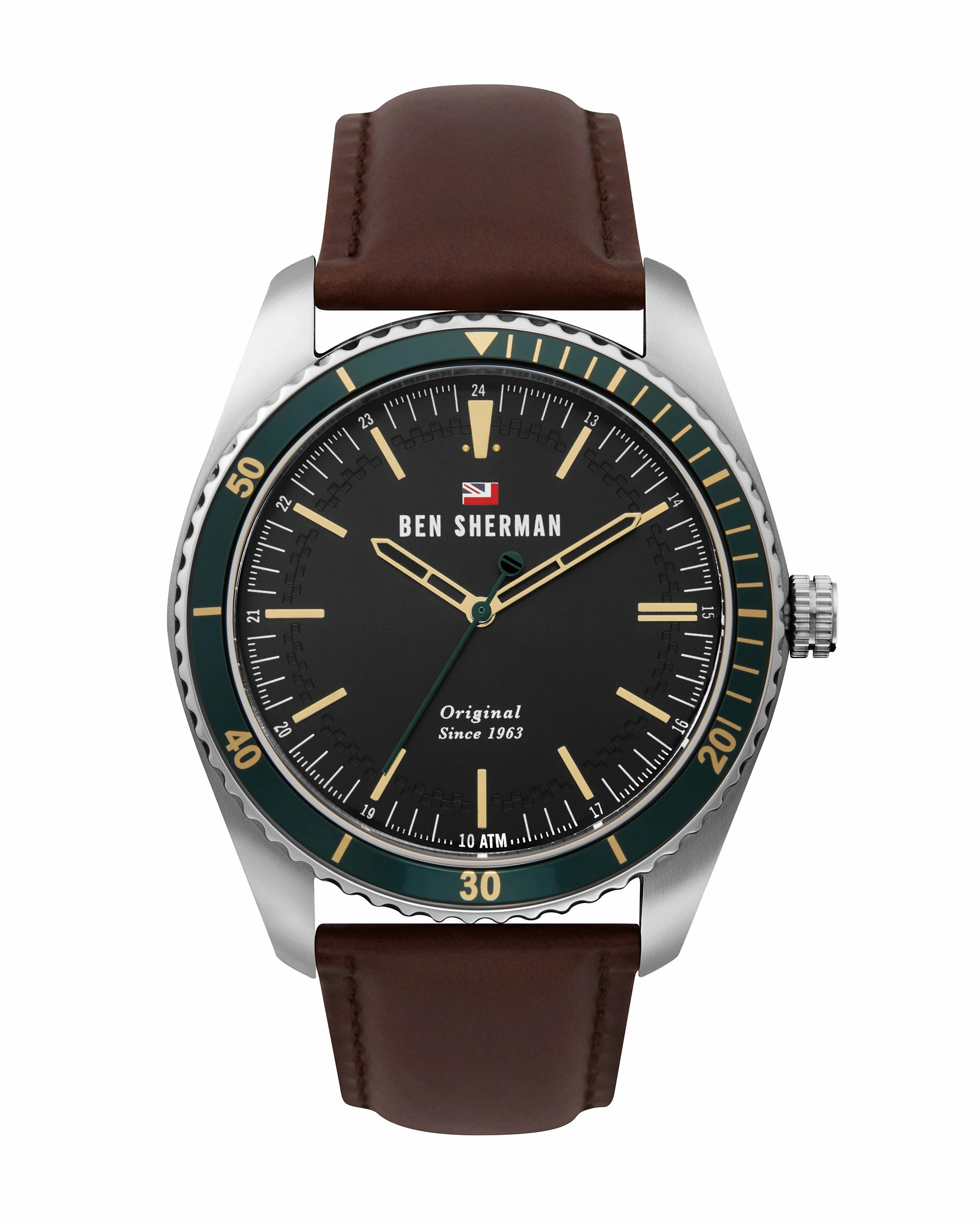 The Ronnie Original watch is a stylish men’s watch with a black sunray dial, silver case with green and gold accents, and a brown leather strap.