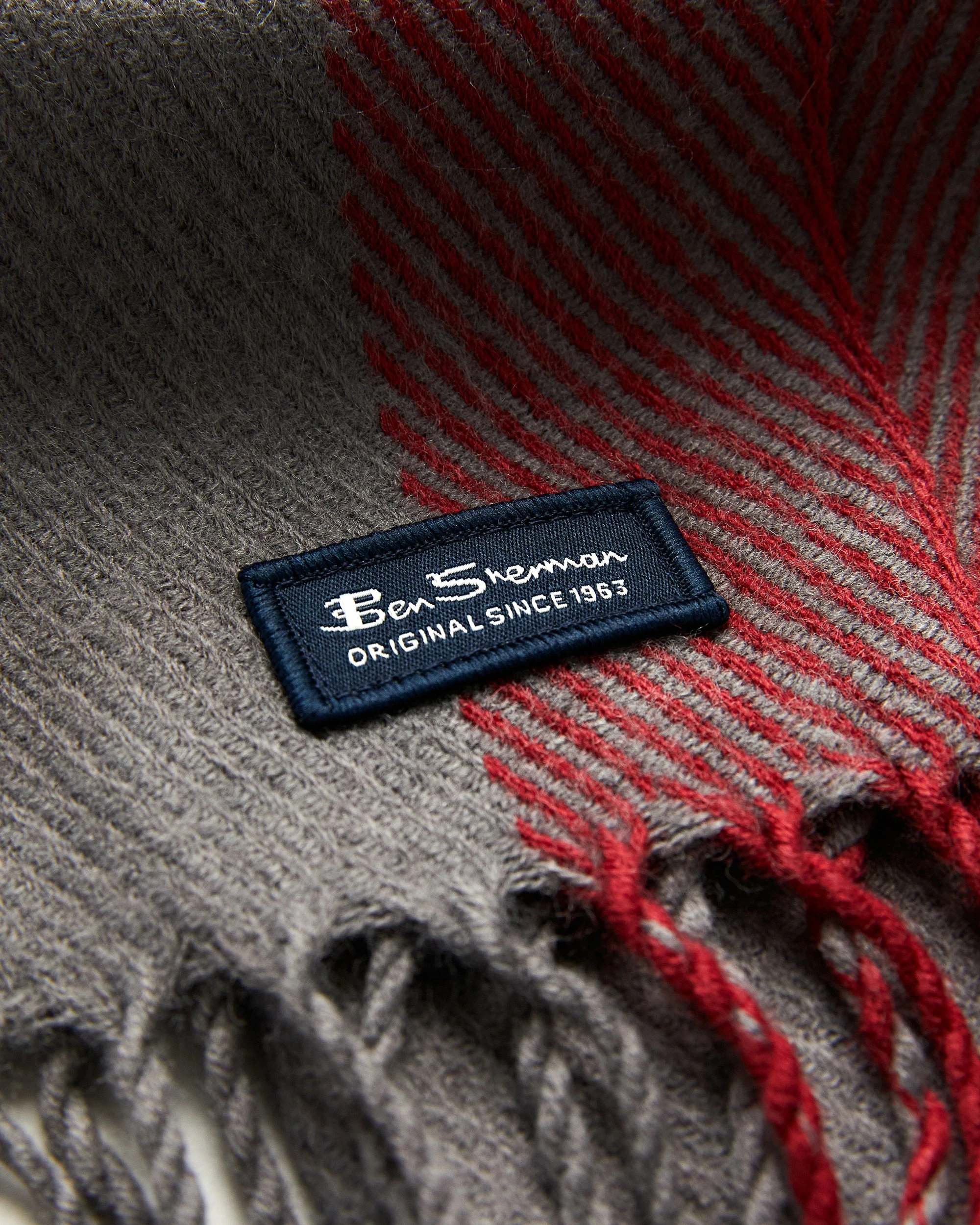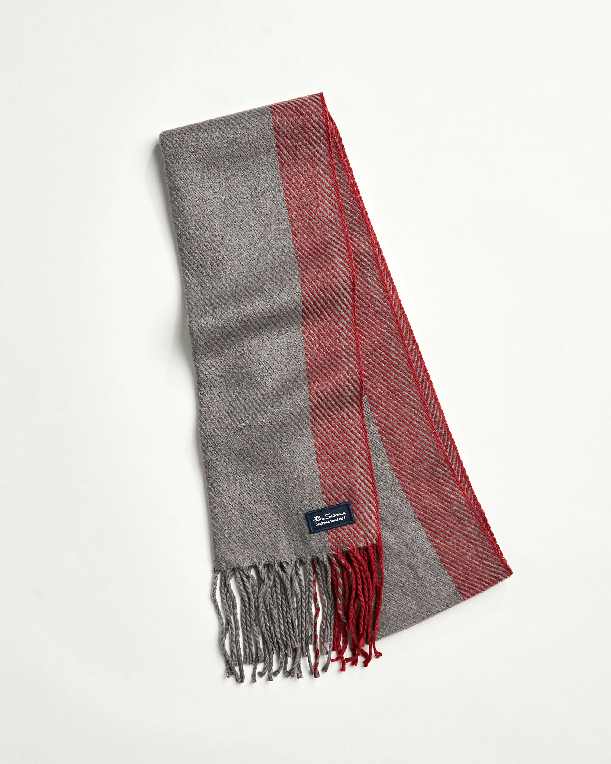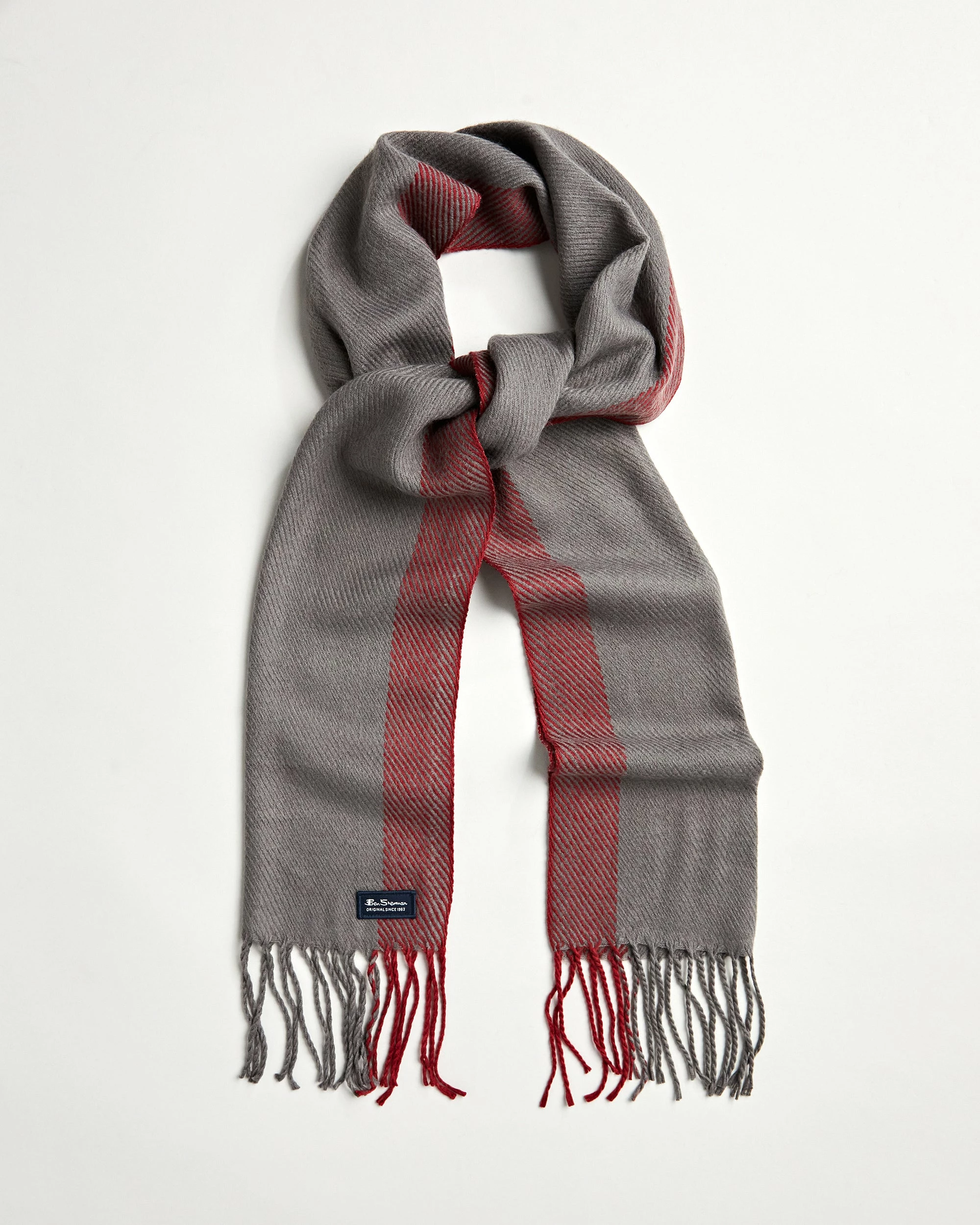 Add warmth and style to your look this season with our herringbone knit striped scarf.