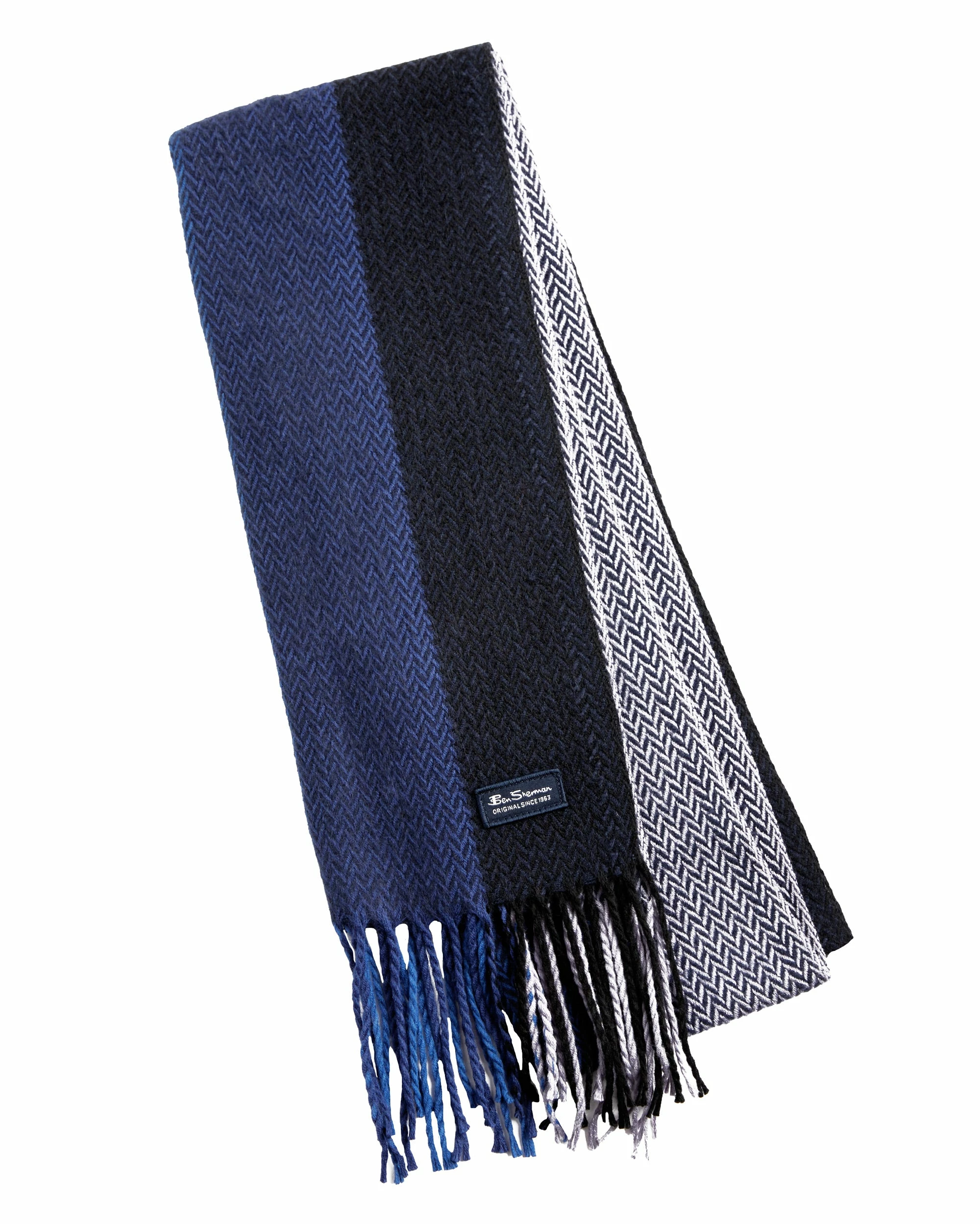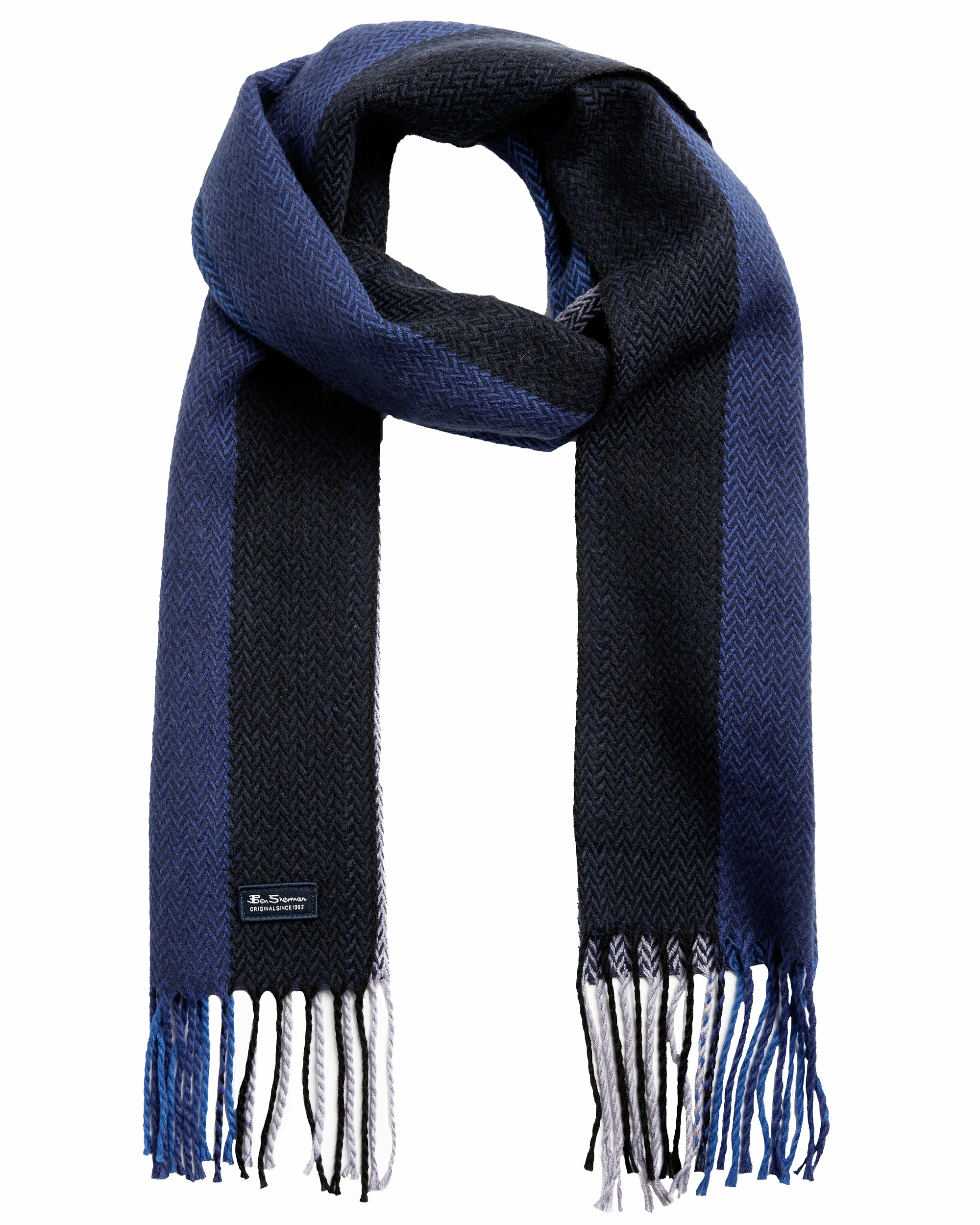 Add warmth and style to your look this season with our herringbone knit striped scarf.