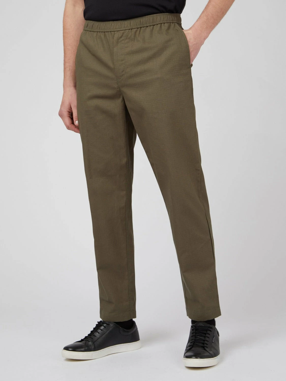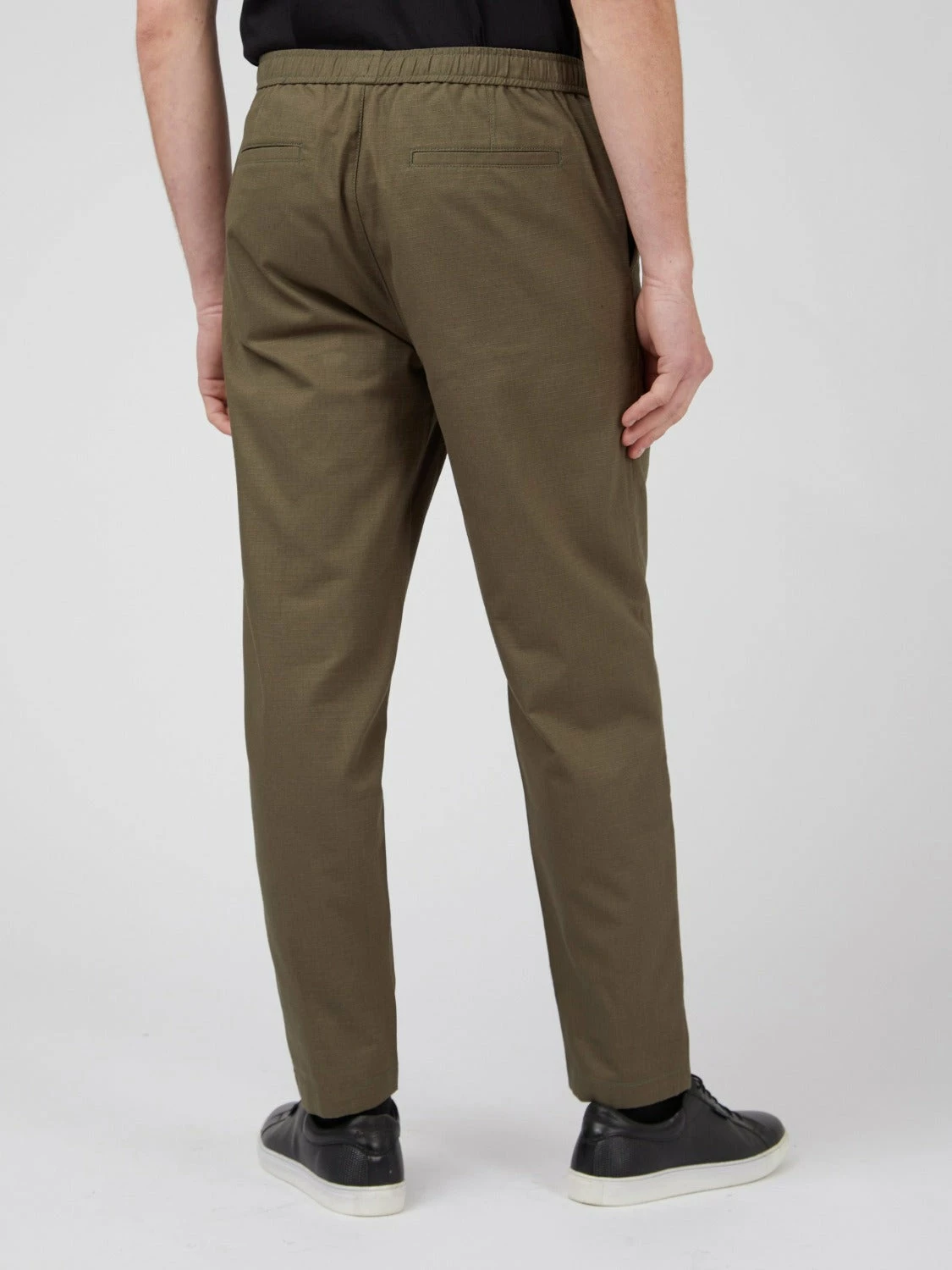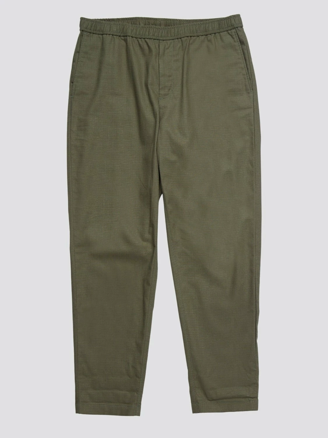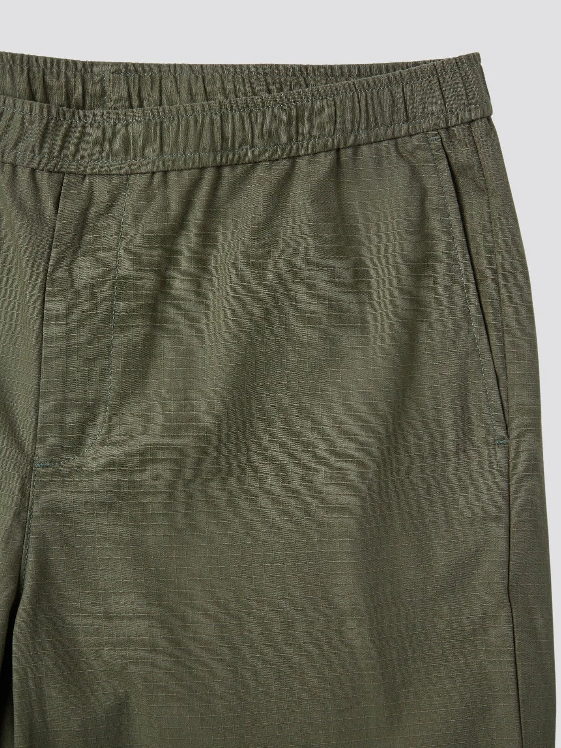 A ripstop trouser in a cotton fabric. Features include an elasticated waistband with drawcord, 2 front slanted pockets and 2 back jet pocket.