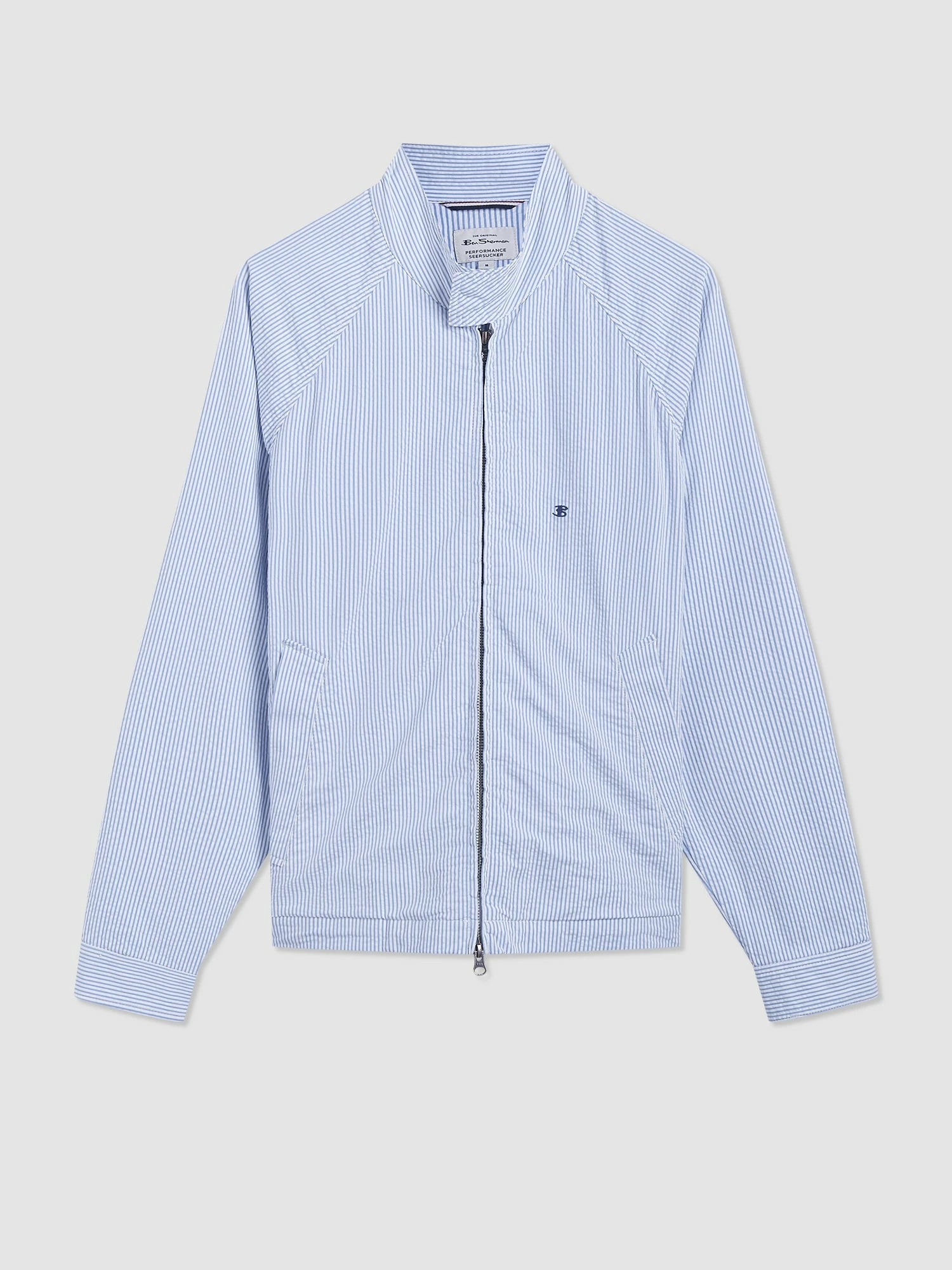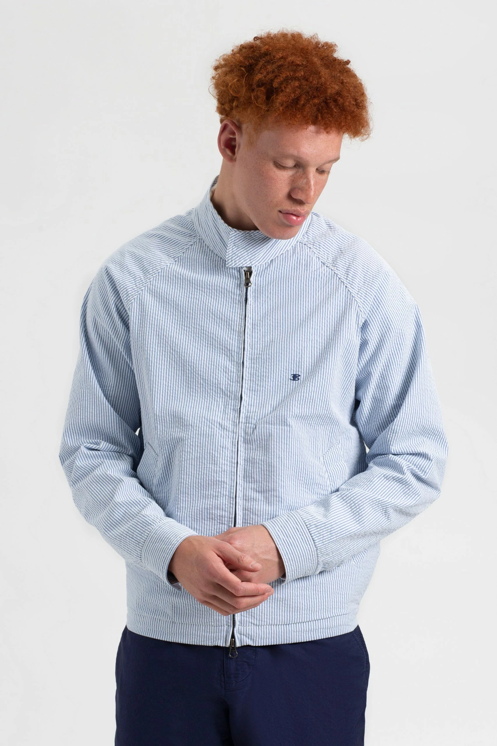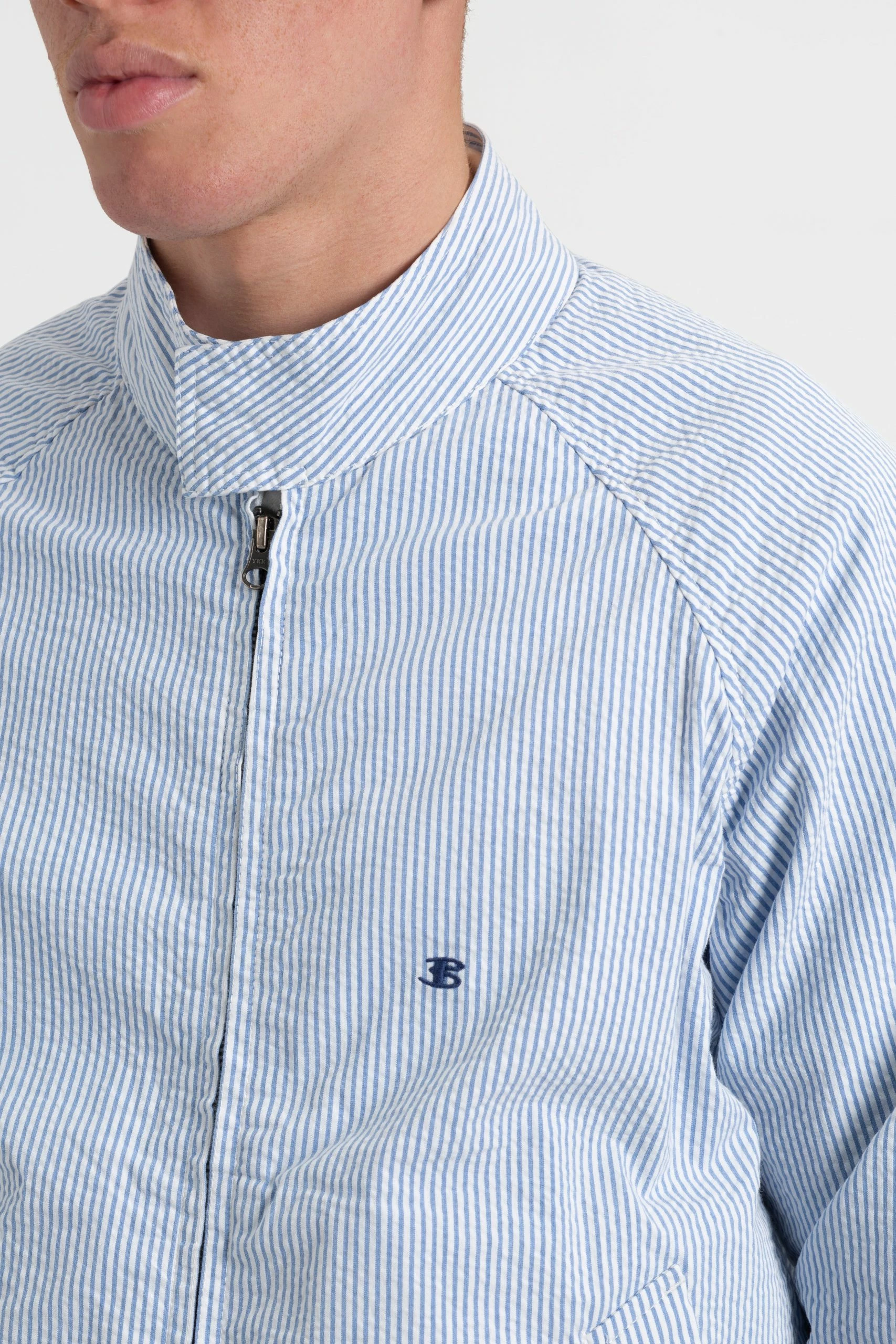 Our Seersucker Harrington is a summer interpretation of the Harrington jacket and nods to Ivy League ‘60s college styling. The seersucker cloth makes this Harrington jacket breathable in the hottest climates, and the style fits slim like our classic Harrington. We’ve finished the jacket with our signature B logo embroidered onto the left chest.