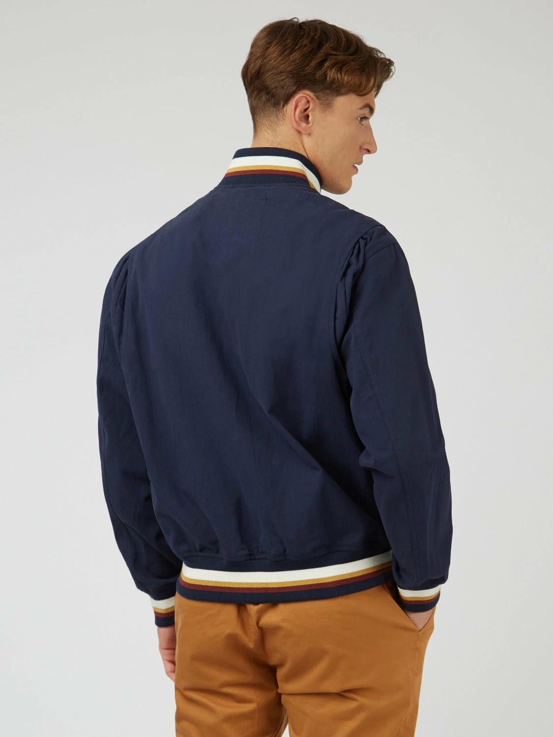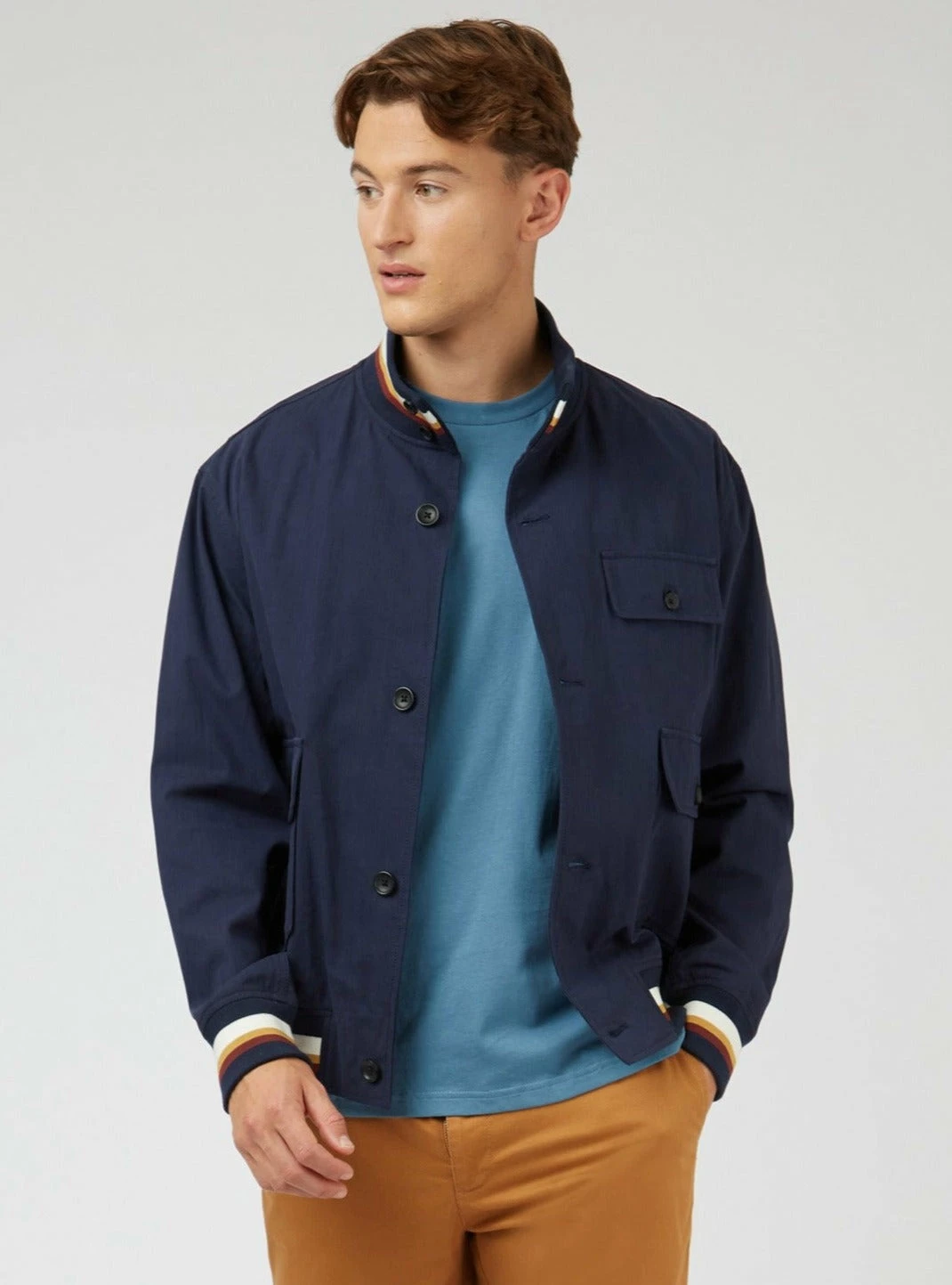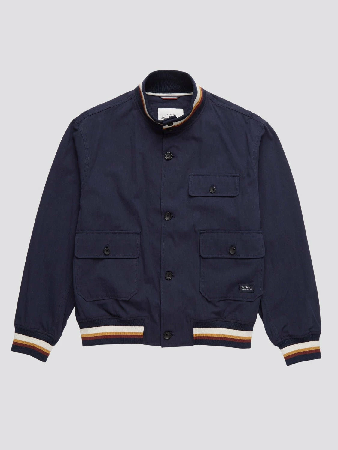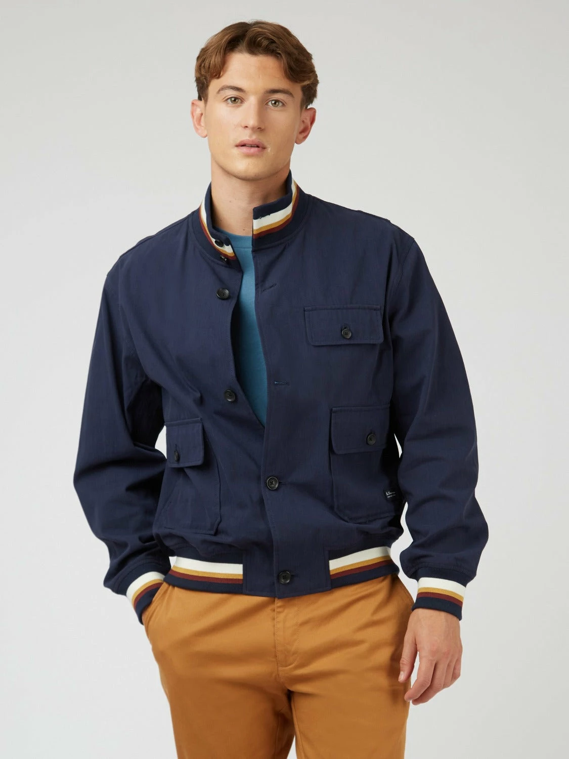 A classic bomber jacket in a cotton fabric. Features include a contrast rib at the neck, hem and cuff and a branded Ben Sherman badge. This piece has 3 external patch pockets and an internal pocket.