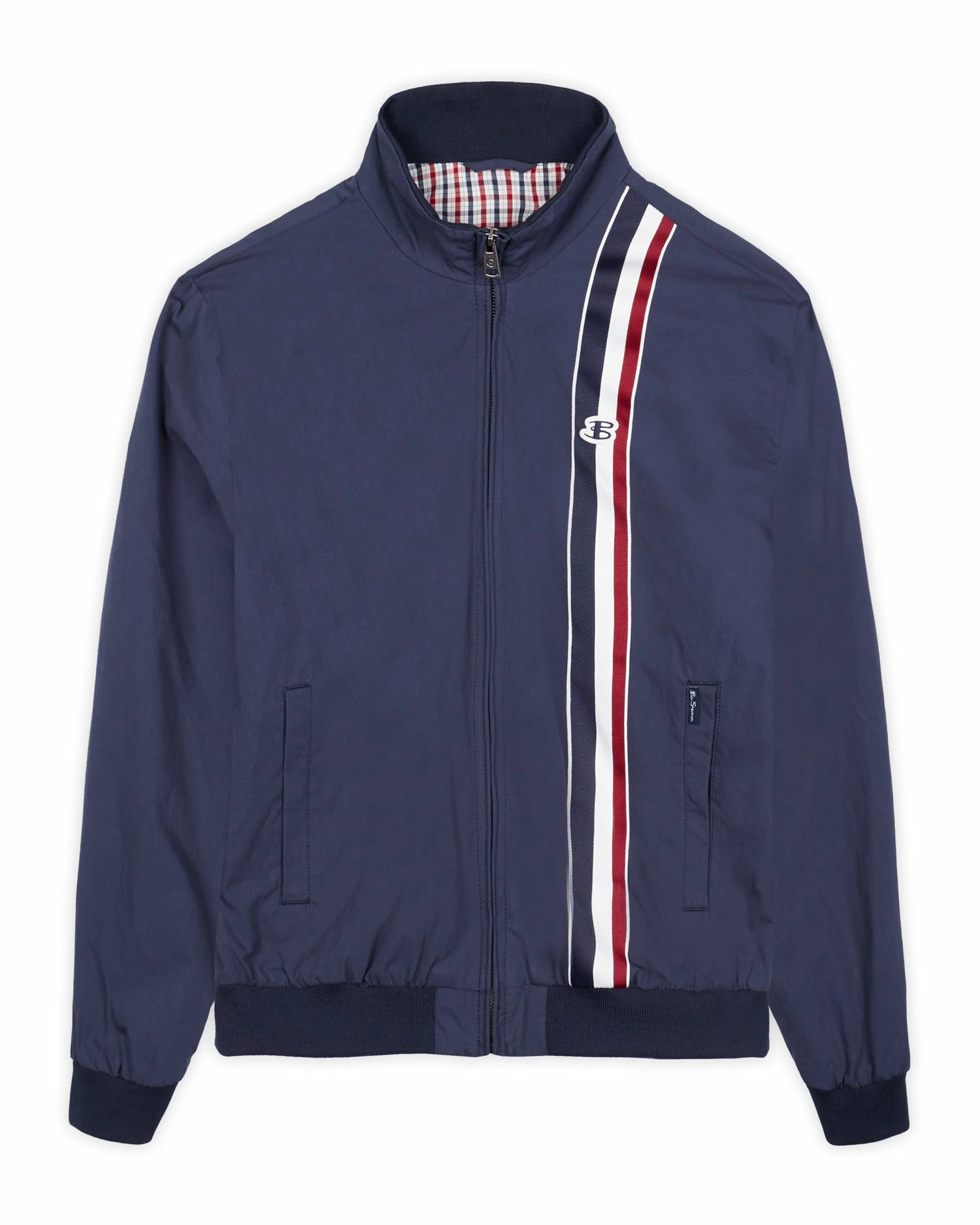 A sport-inspired update on our signature Harrington jacket, the zip-through Sports Harrington stands out with a herringbone textured stripe tape detail and Ben Sherman branding. An iconic check lining and classic styling, including ribbed hem and cuffs and two welt pockets, complete the look.