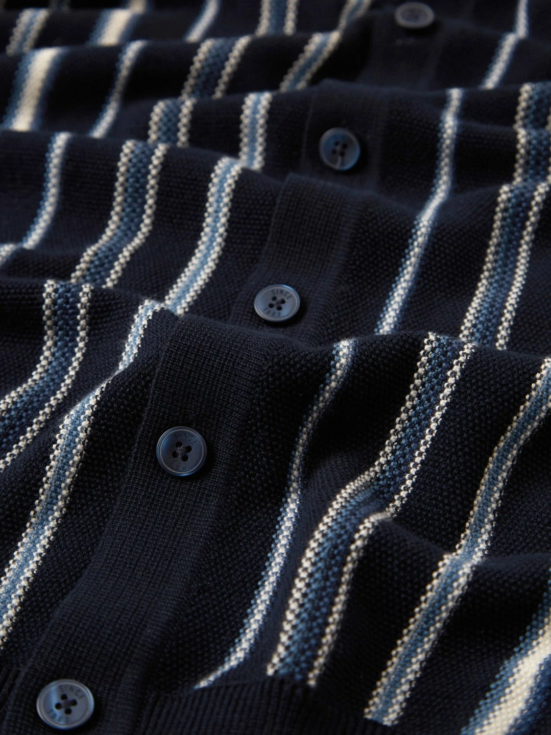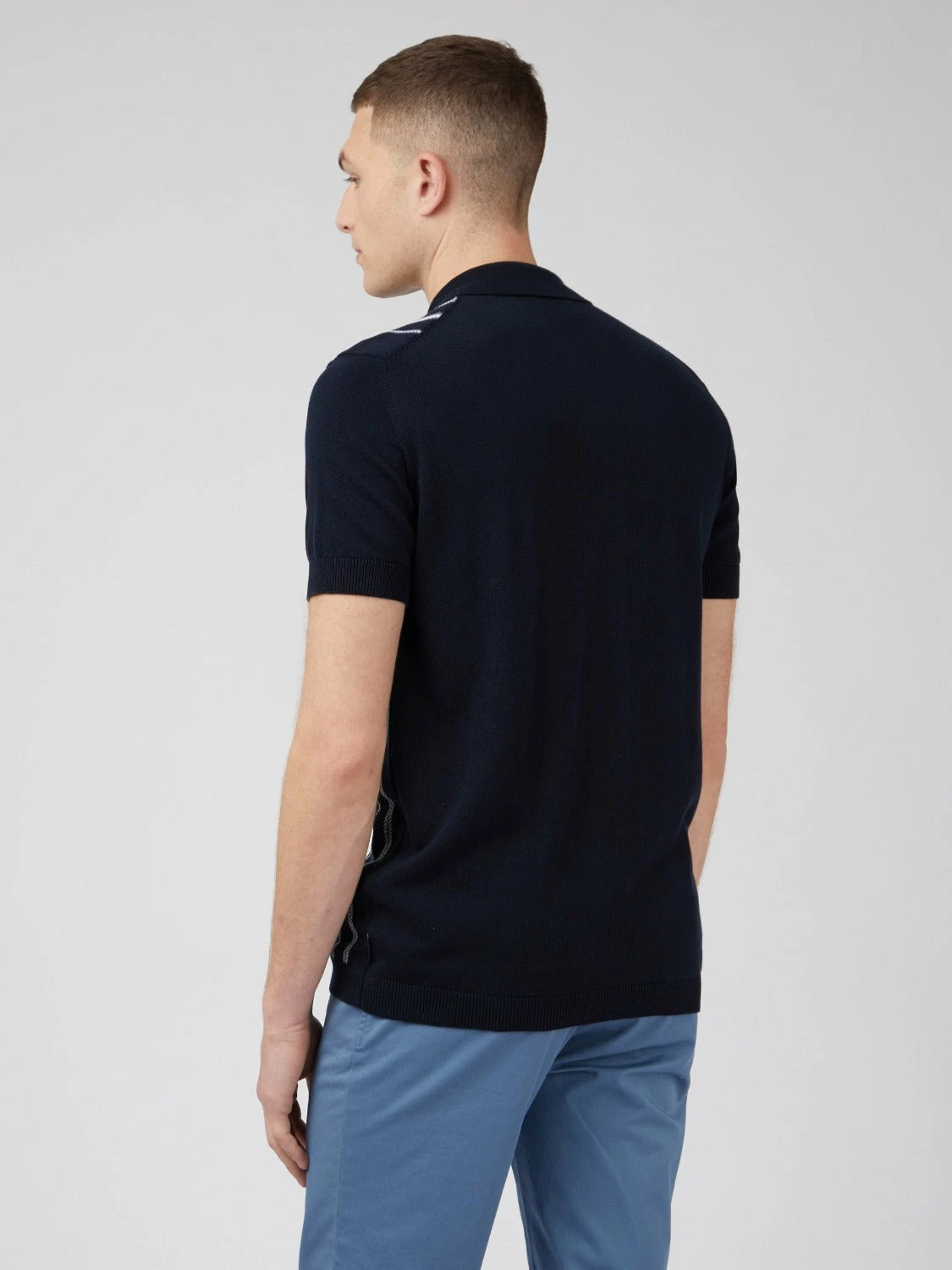 Featuring a unique ivory and navy striped pattern, this polo shirt is perfect for both casual and dressy occasions. Dress it up with dress pants and shoes, or wear it with jeans and sneakers for a more casual look.