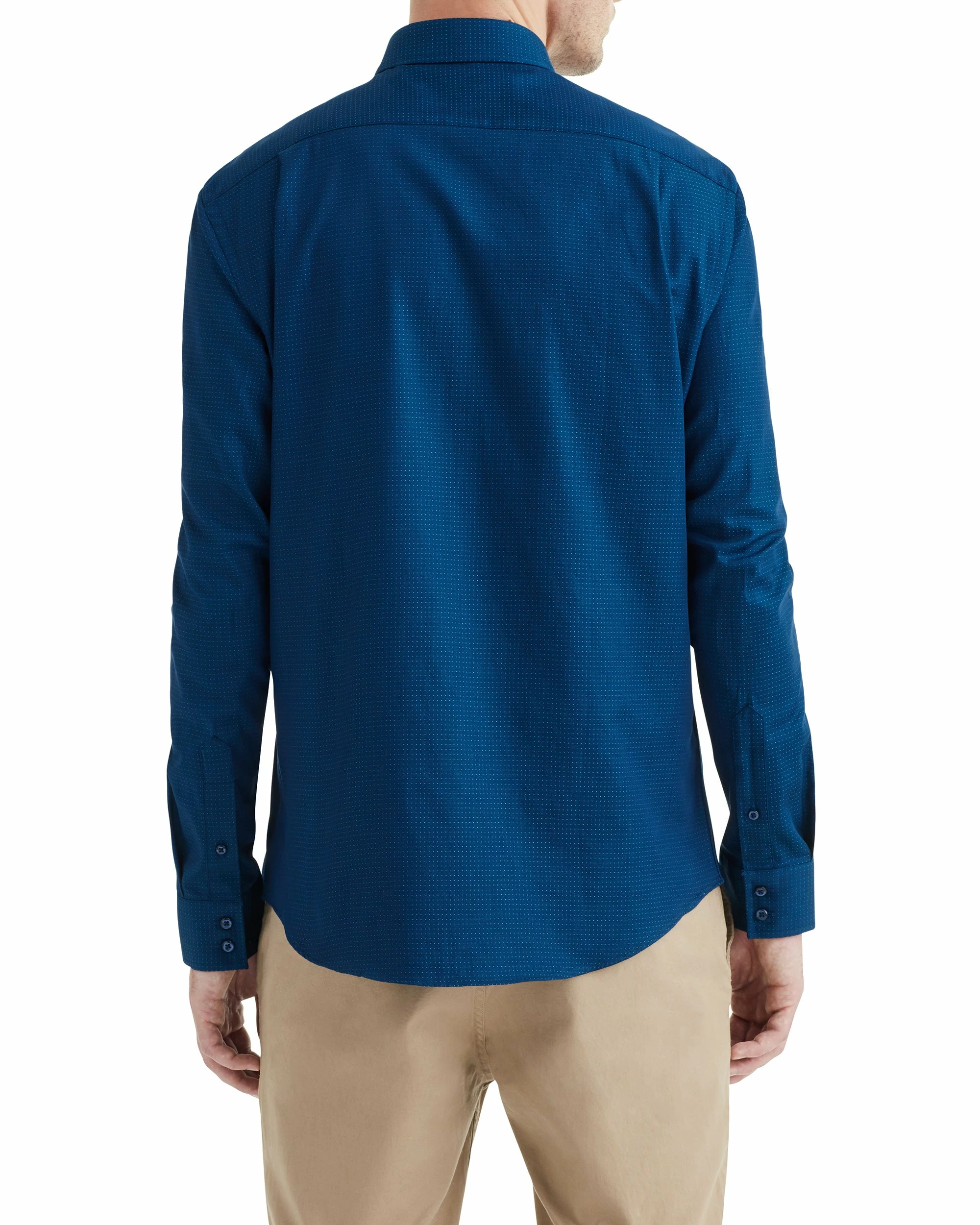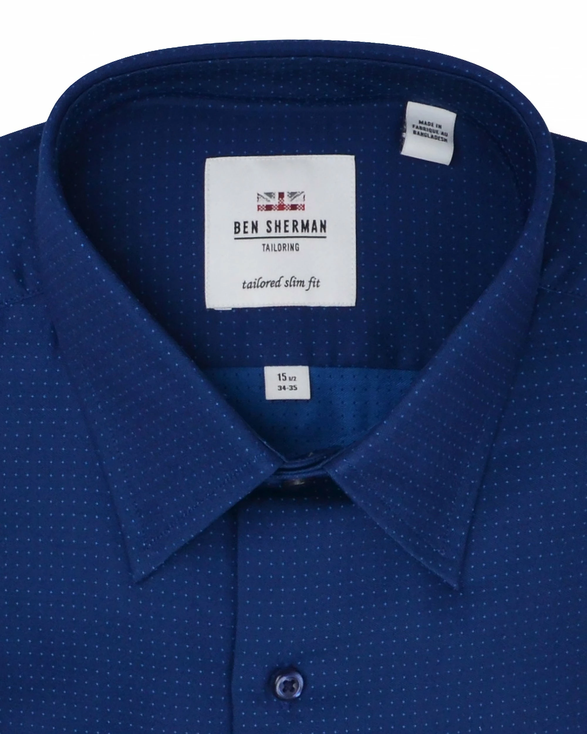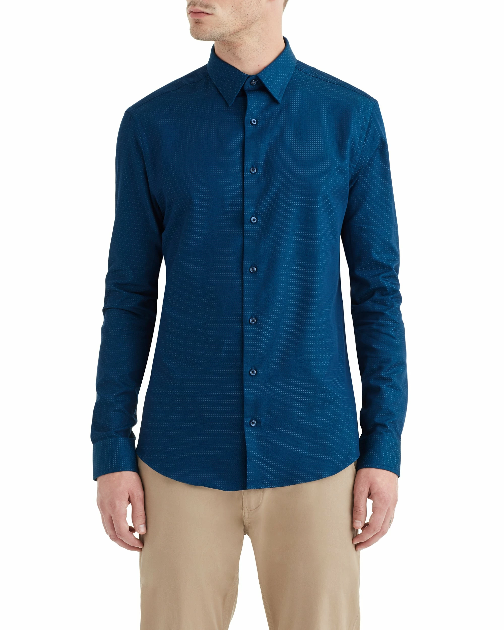 The Teal & Navy Solid Dobby Dress Shirt is cut to a slim fit with 100% cotton and dobby texturing. Teal with navy dobby pattern gives an instant wardrobe update.